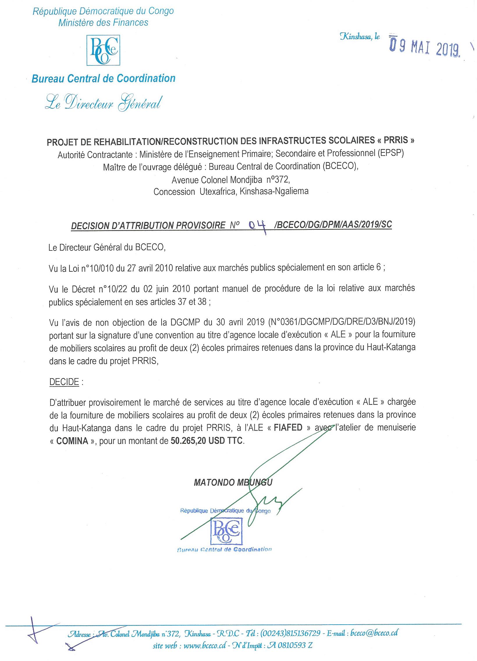 Attribution provisoire du marché de services au titre d’agence locale d’exécution « ale » chargée de la fourniture de mobiliers au profit de deux (2) écoles primaires retenues dans la province du haut-Katanga dans le cadre du projet prris à l’ale « fiaf