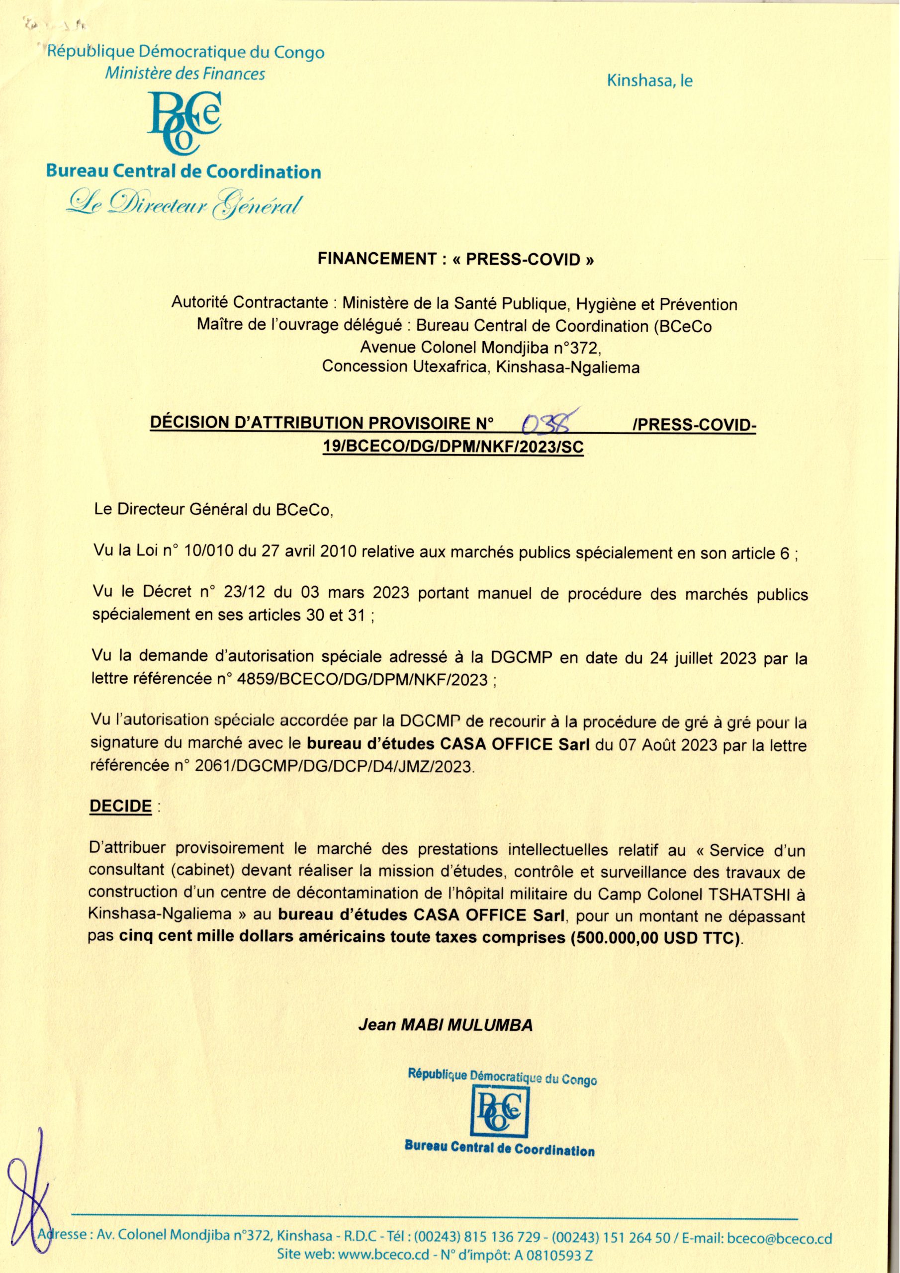 DÉCISION D’ATTRIBUTION PROVISOIRE ACCORDÉE AU CABINET D’ÉTUDE CASA OFFICE SARL RELATIVE AU SERVICE D’UN CONSULTANT (CABINET ) DEVANT RÉALISER LA MISSION D’ÉTUDES, CONTRÔLE ET SURVEILLANCE DES TRAVAUX DE CONSTRUCTION D’UN CENTRE DE DÉCONTAMINATION DE …