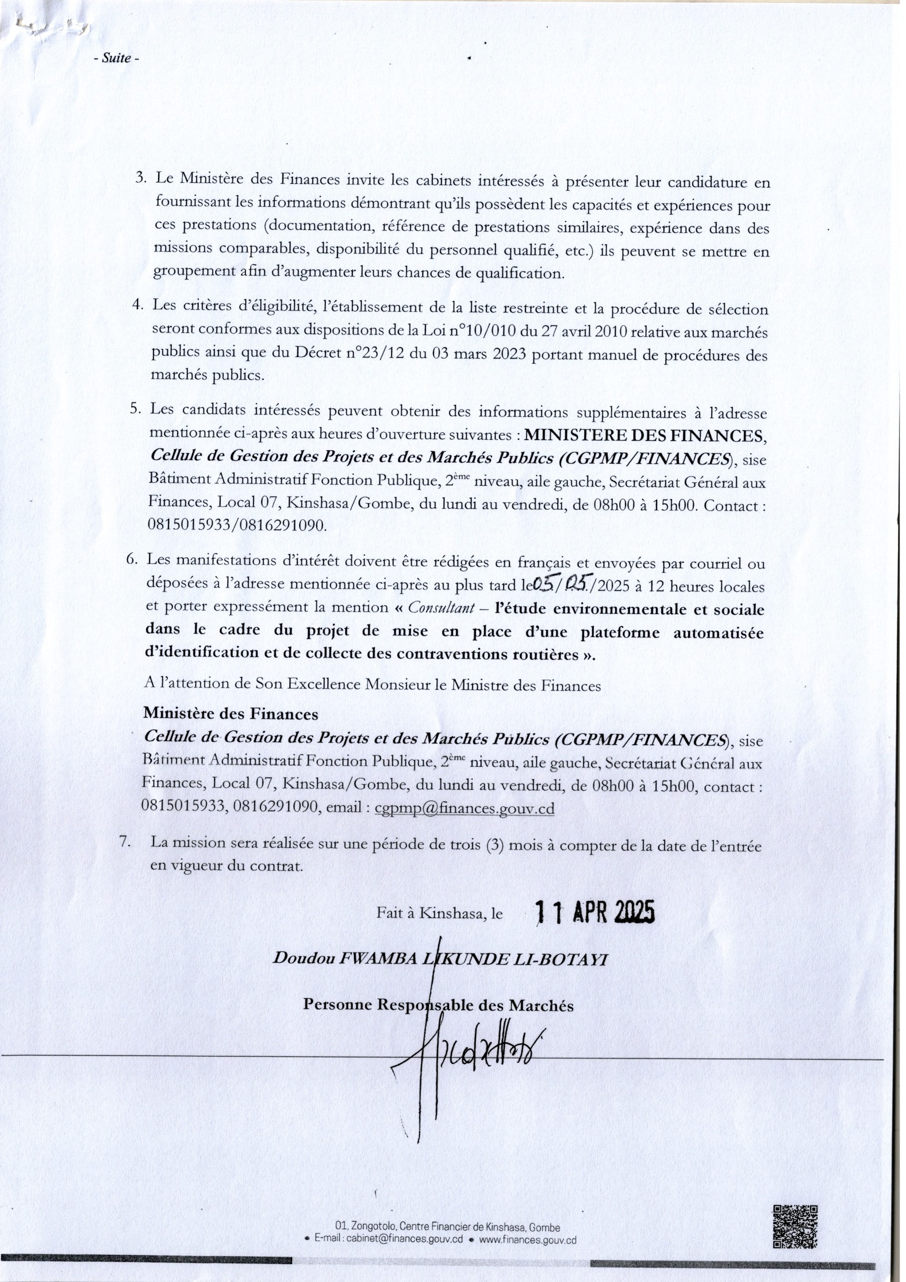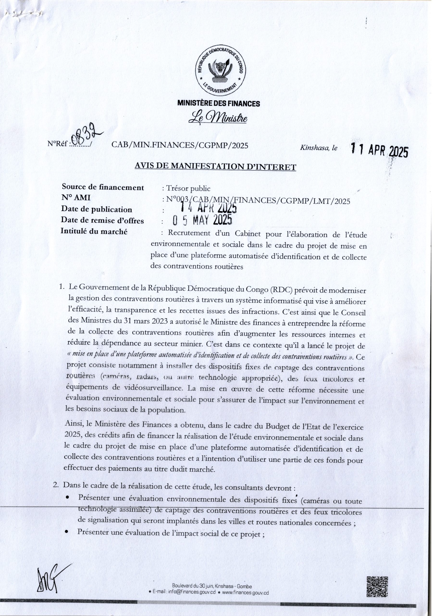 Recrutement d’un cabinet pour l’élaboration de l’étude environnementale et social dans le cadre du projet de mise en place d’une plateforme automatisée d’identification et de collecte des contravention routières.