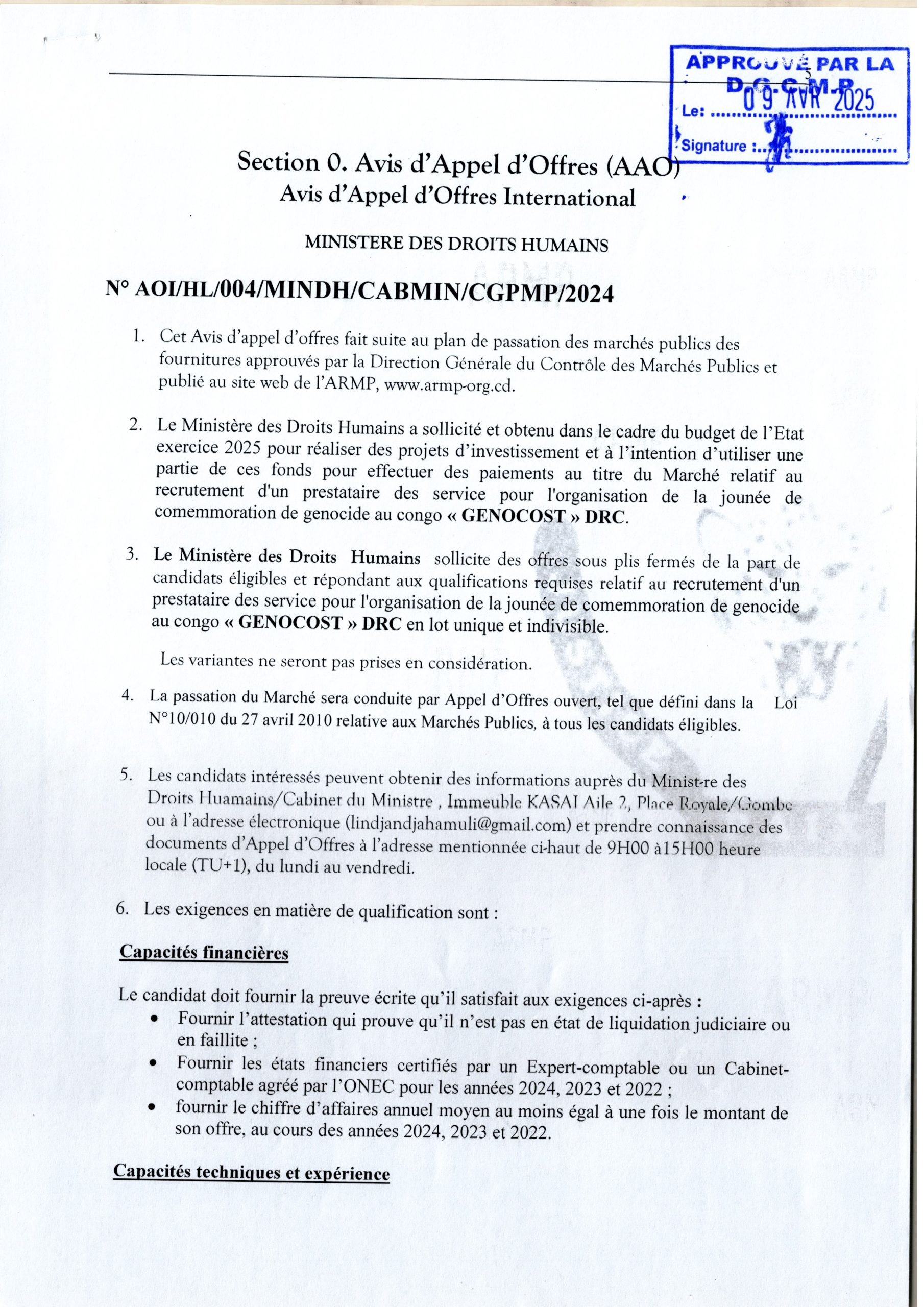 Recrutement d’un prestataire des services pour l’organisation de la journée de commémoration de genocide au Congo “GENOCOST RDC” en lot unique et indivible.