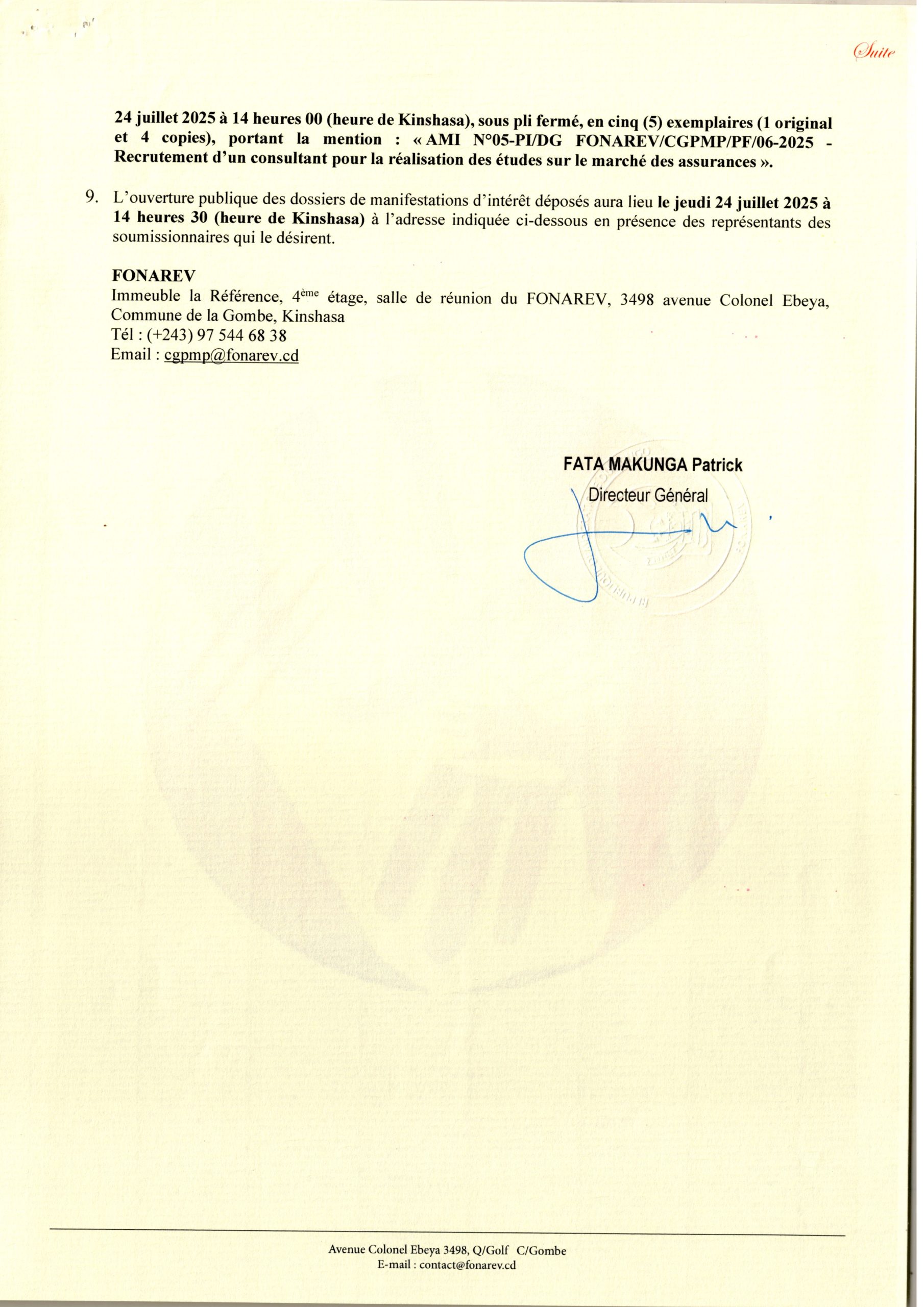 Avis de report de l’avis d’appel d’offre relatif à l’acquisition des intrants pour le balisage des cours d’eau “SANKURU-KASAI-KWILU”.