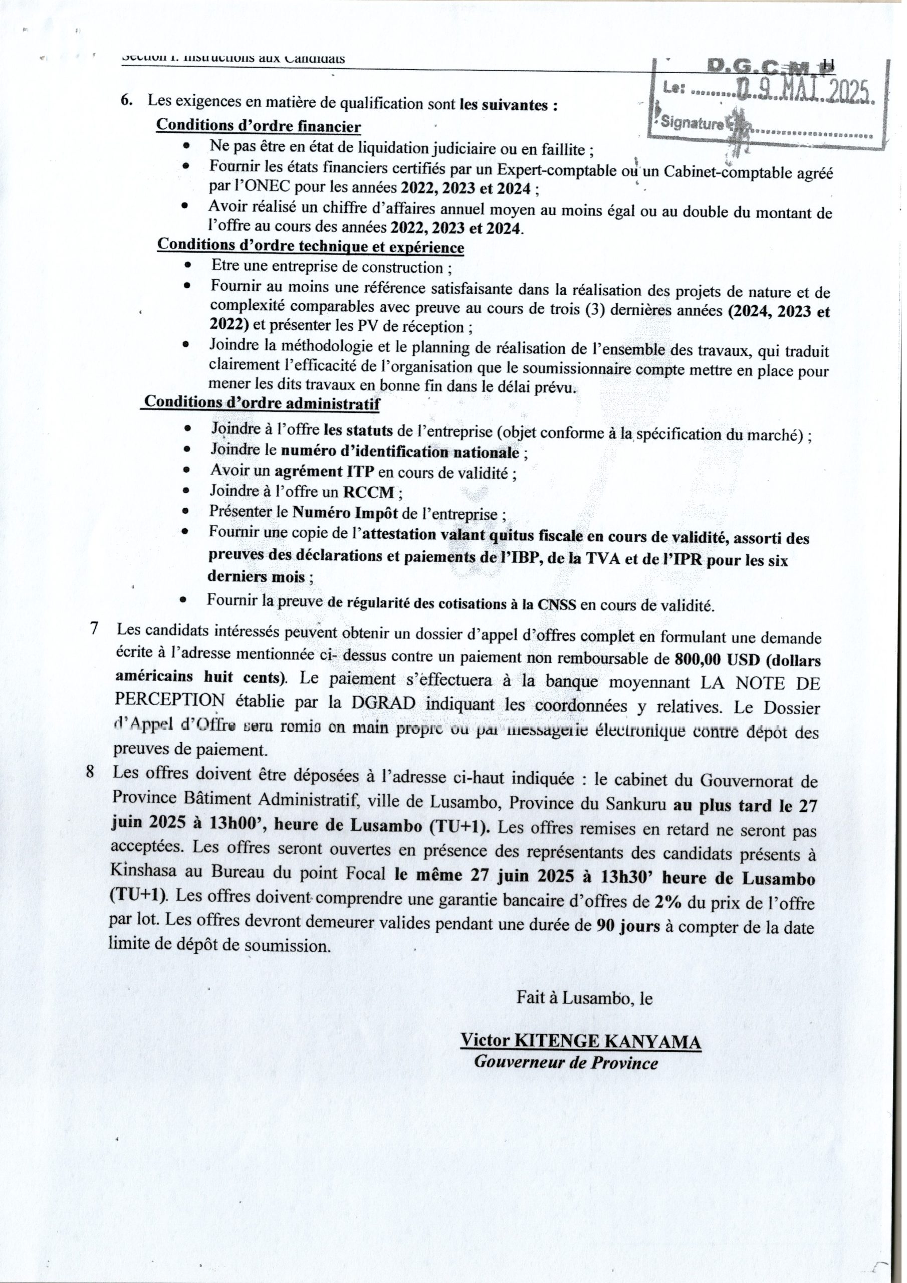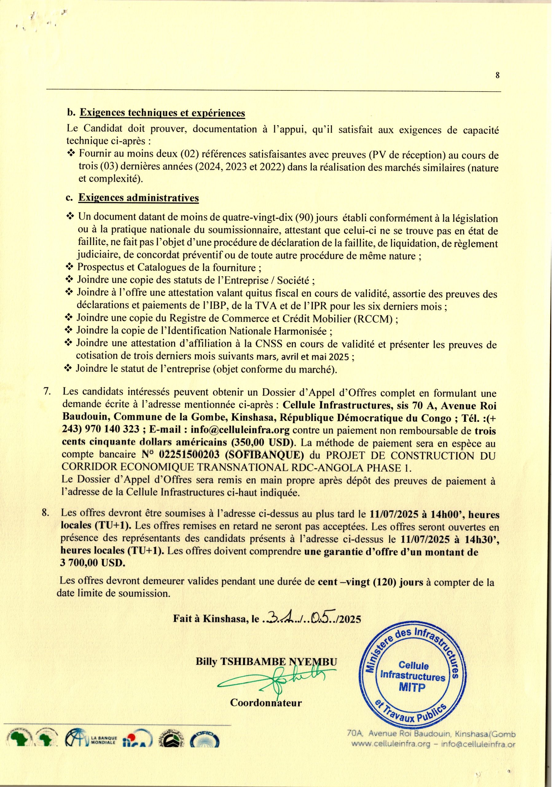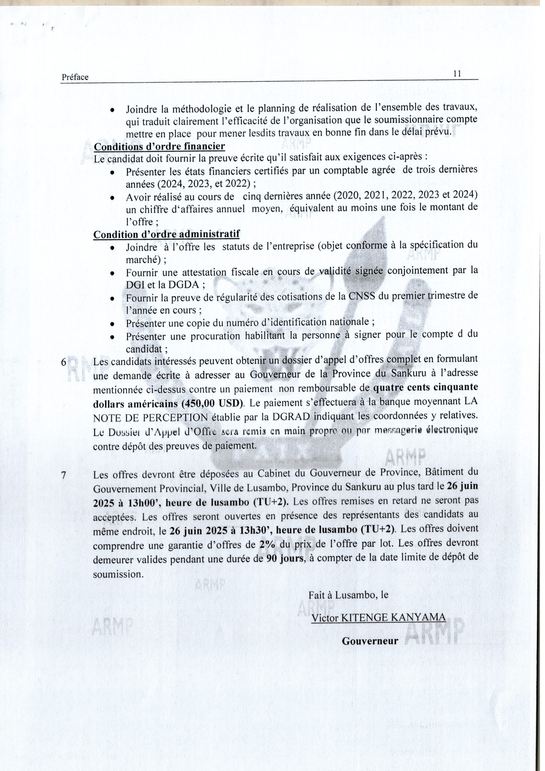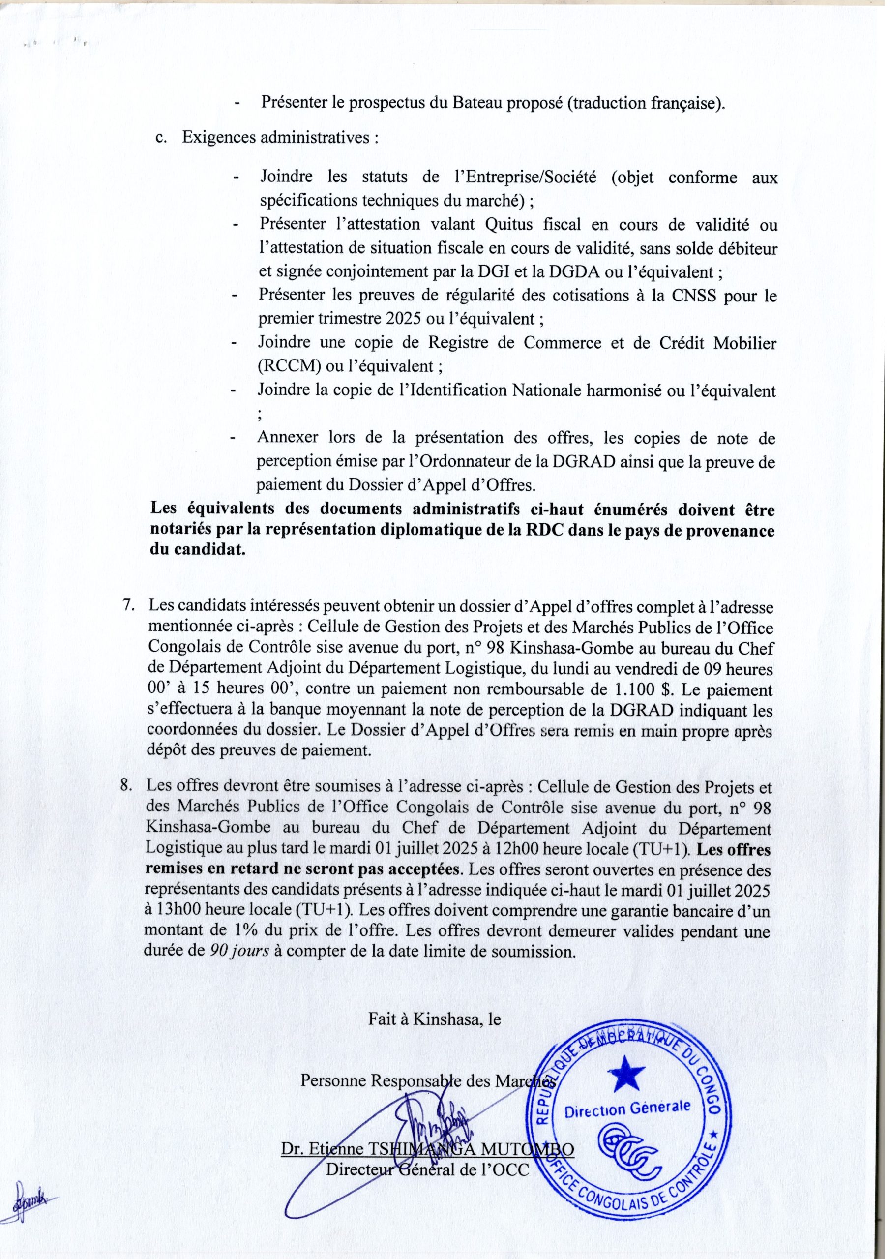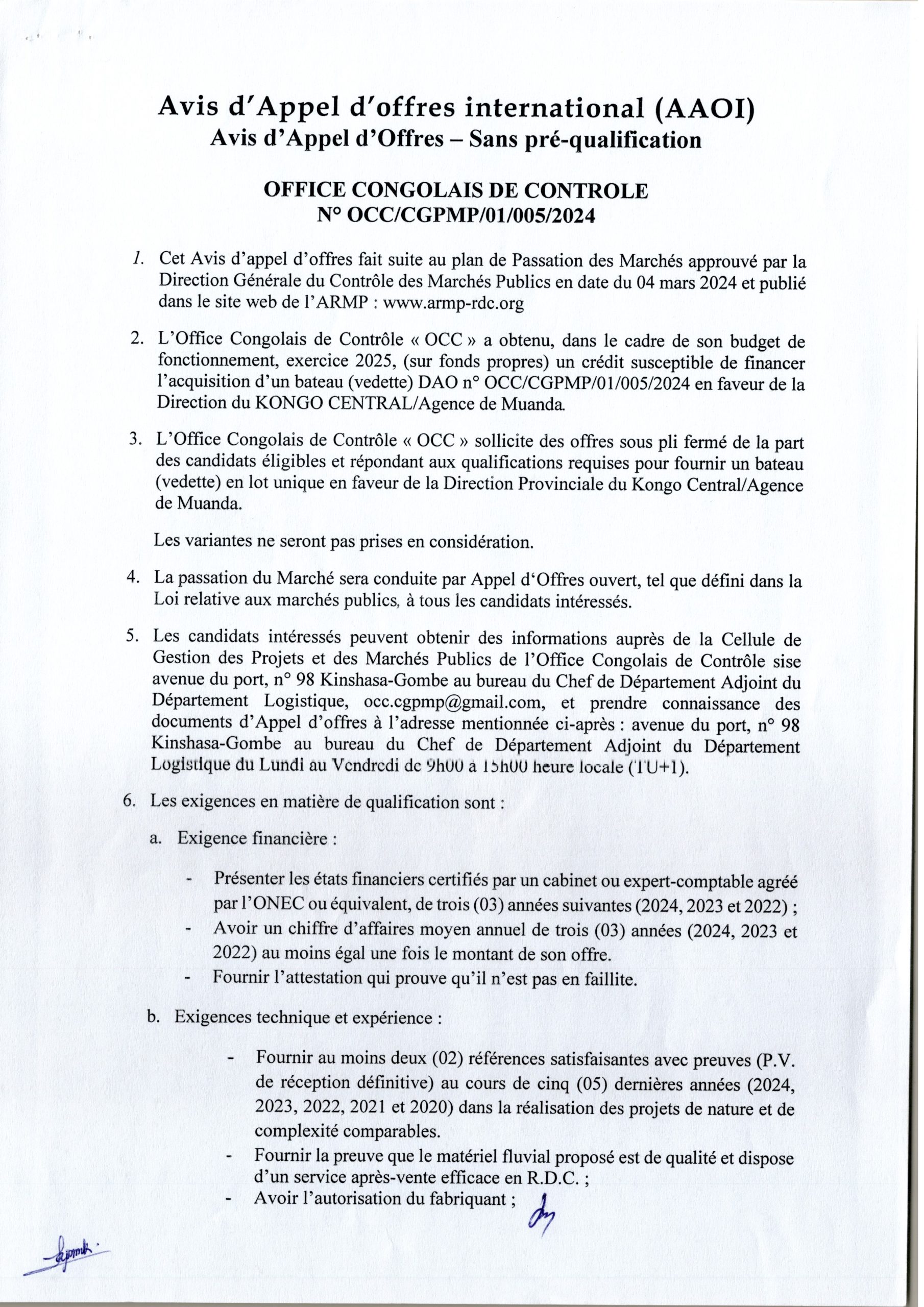 Acquisition d’un bureau (vedette) DAO n°OCC/CGPMP/01/005/2024 en faveur de la Direction du KONGO CENTRAL/Agence de Muanda.