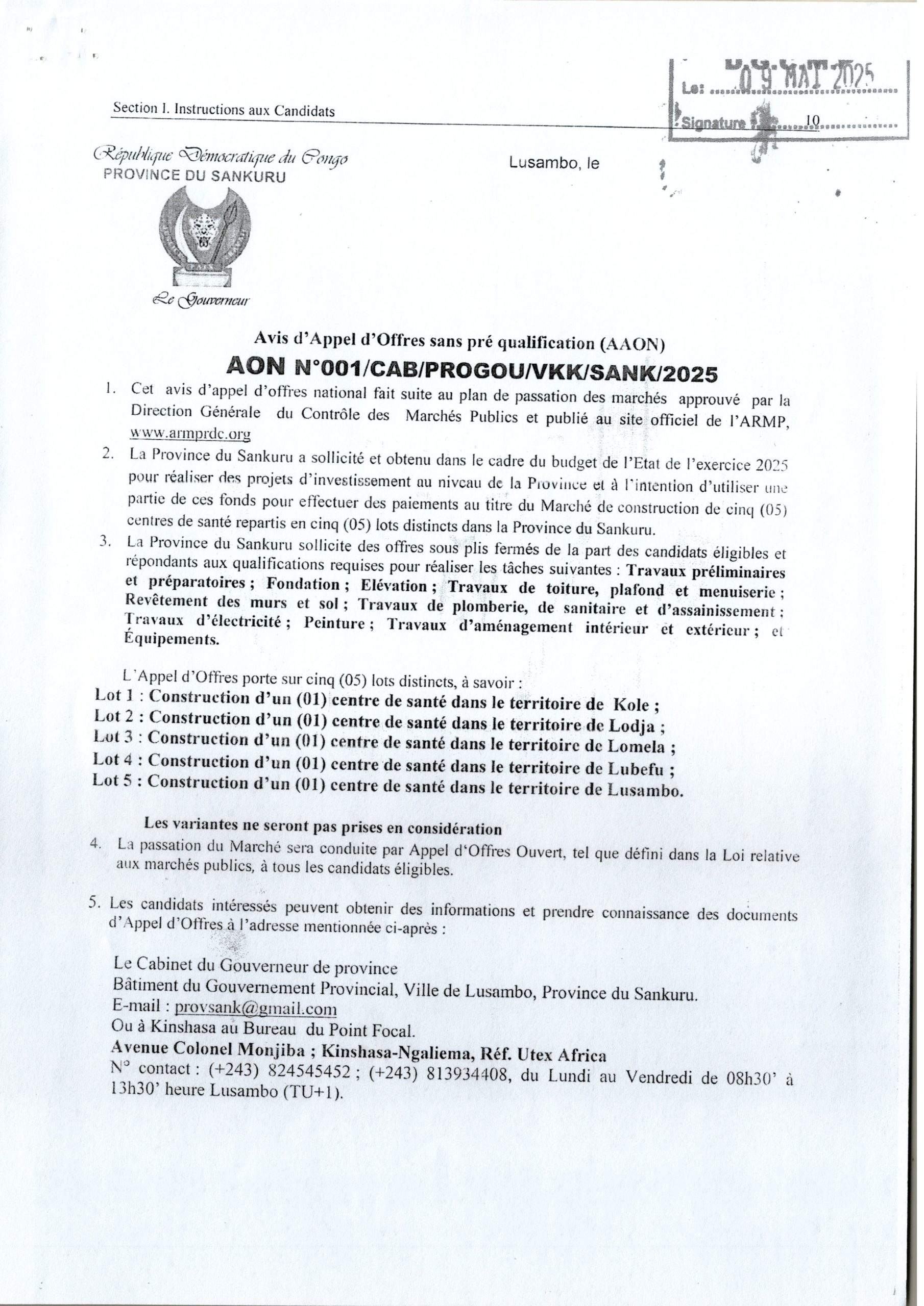 Construction de cinq (05) centres de santé repartis en cinq (05) lots distincts dans la province de Sankuru.