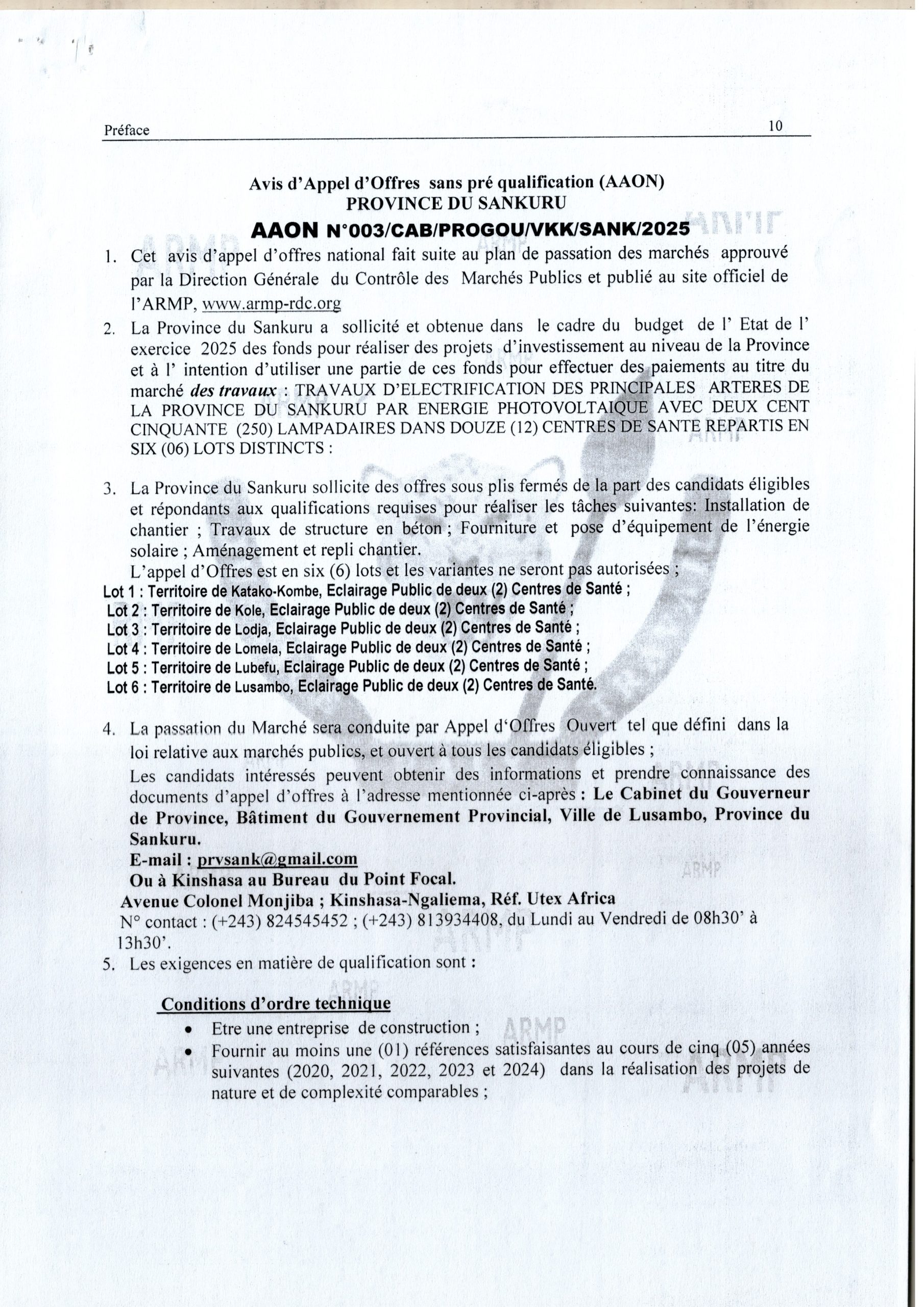 Travaux d’électrification des principales artères de la province du Sankuru par Energie photovoltaïque avec deux cent cinquante (250) lampadaires dans Douze (12) centres de santé repartis en (06) lots distincts.