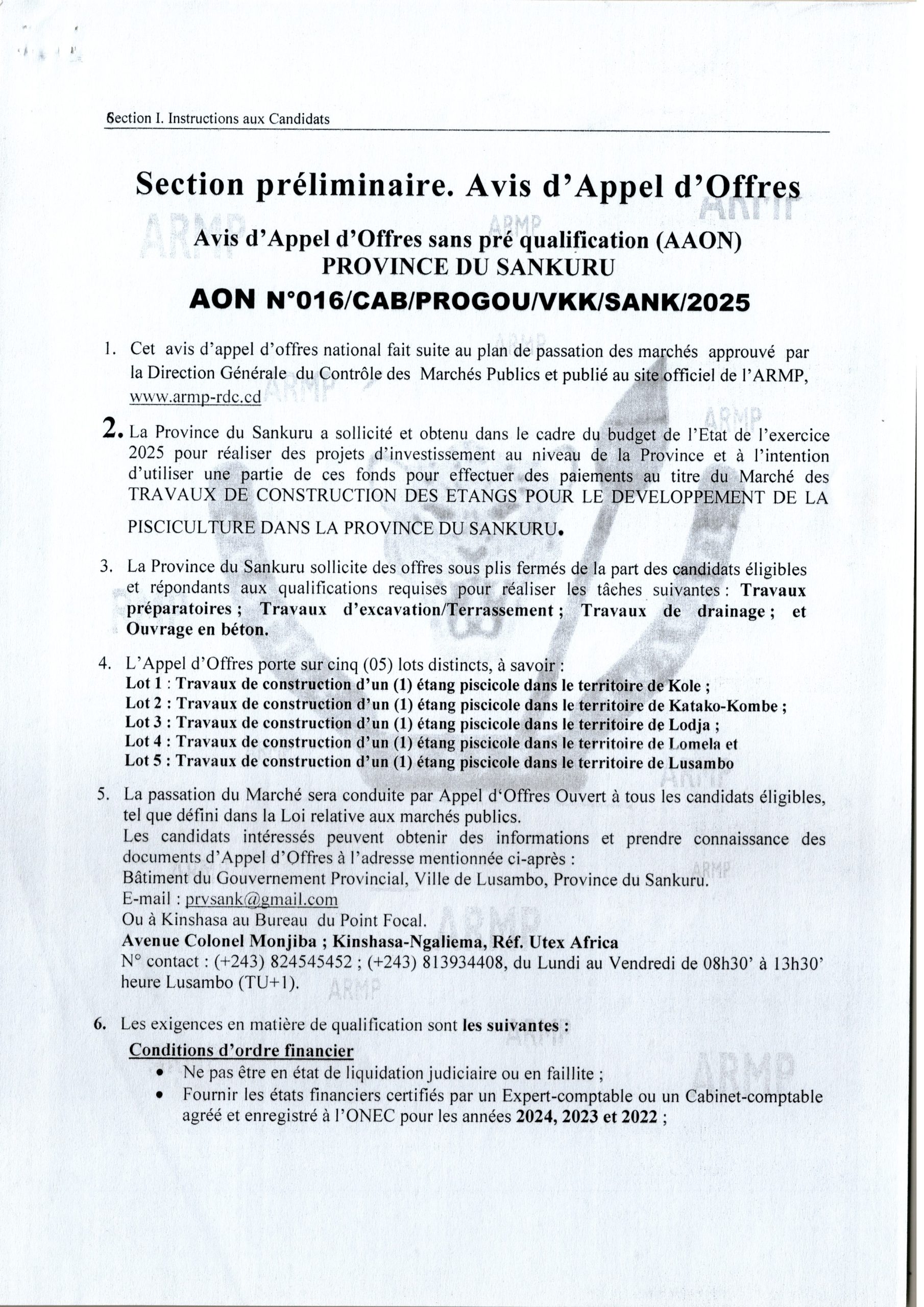 Acquisition des tracteurs et autres engins agricoles pour la Province du Sankuru repartis en quatre (4) lots distincts.