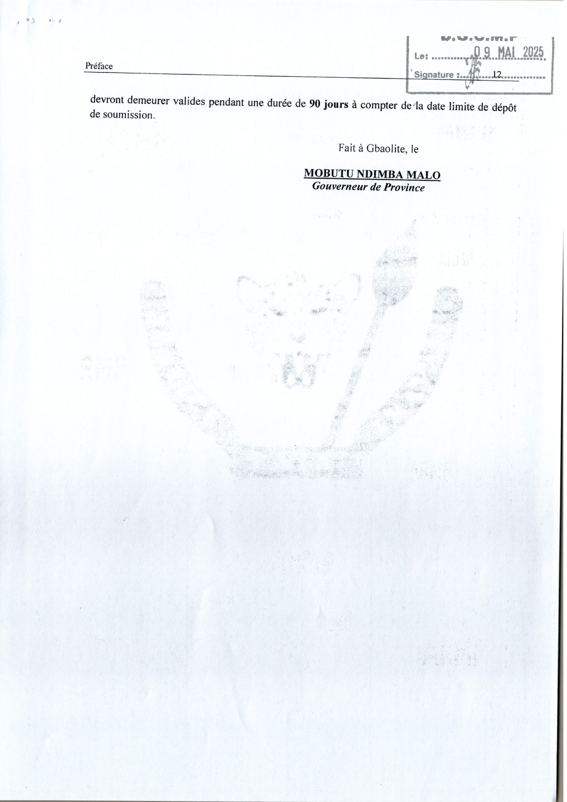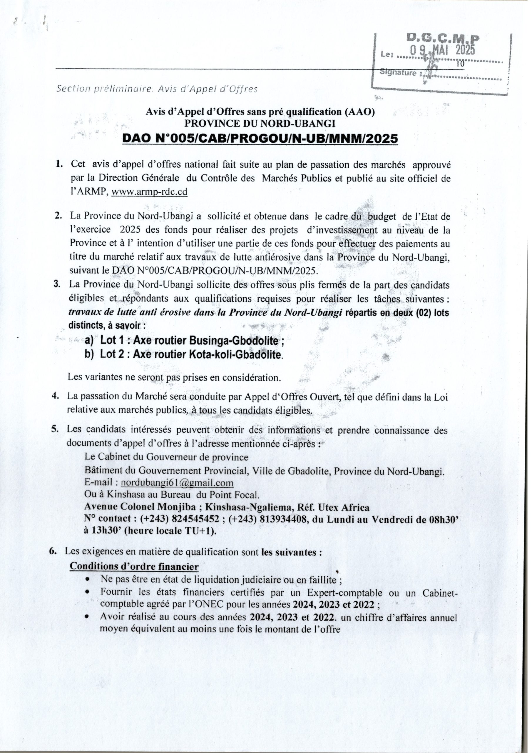 Travaux de lutte antiérosive dans la Province du Nord-Ubangi répartis en deux (02) lots distincts.
