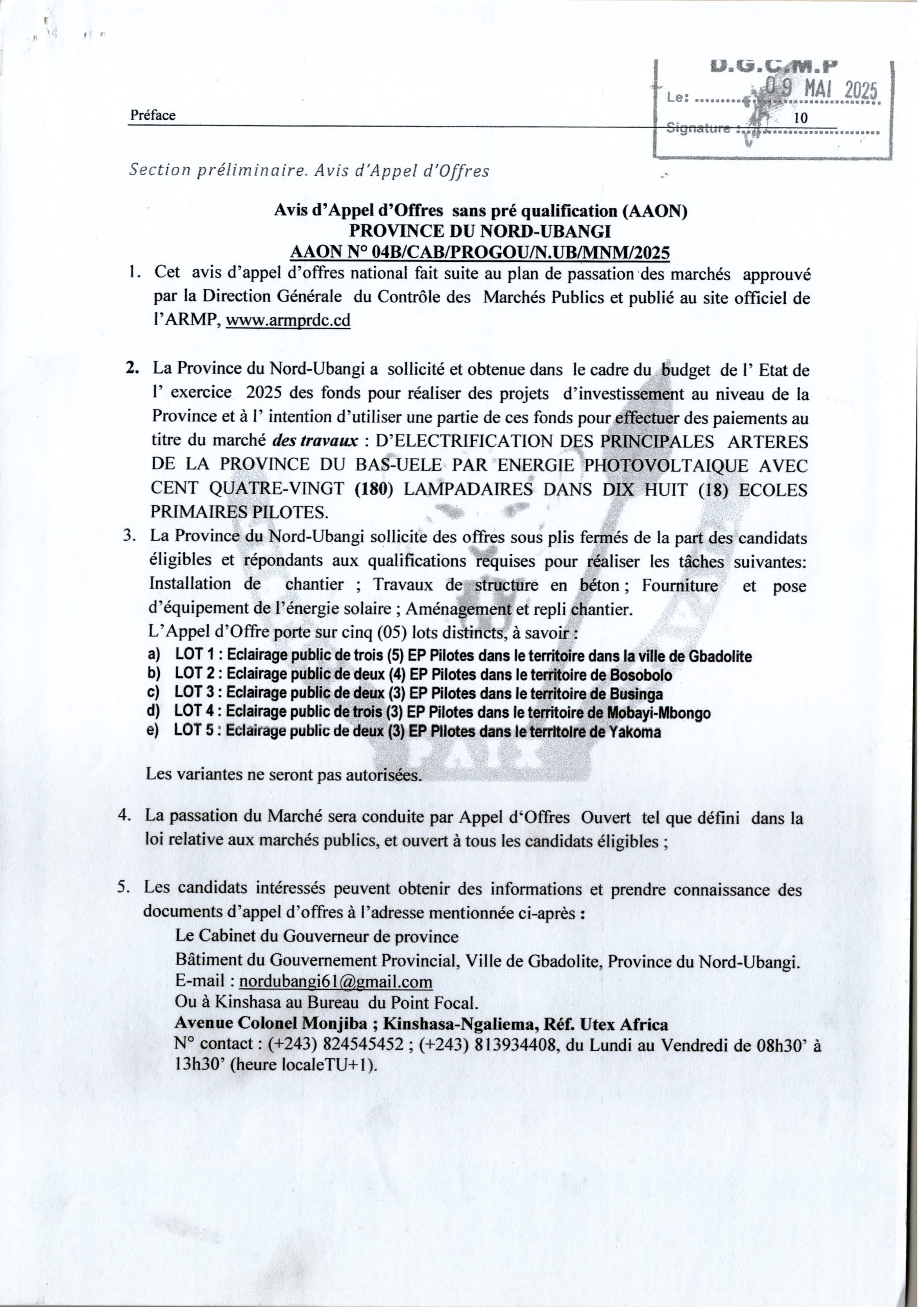 Travaux d’électrification des principales artères de la Province du Bas-Uele par Energie photovoltaïque avec cent quatre-vingt (180) Lampadaires dans dix huit (18) écoles primaires pilotes, repartis en cinq (05) lots distincts.