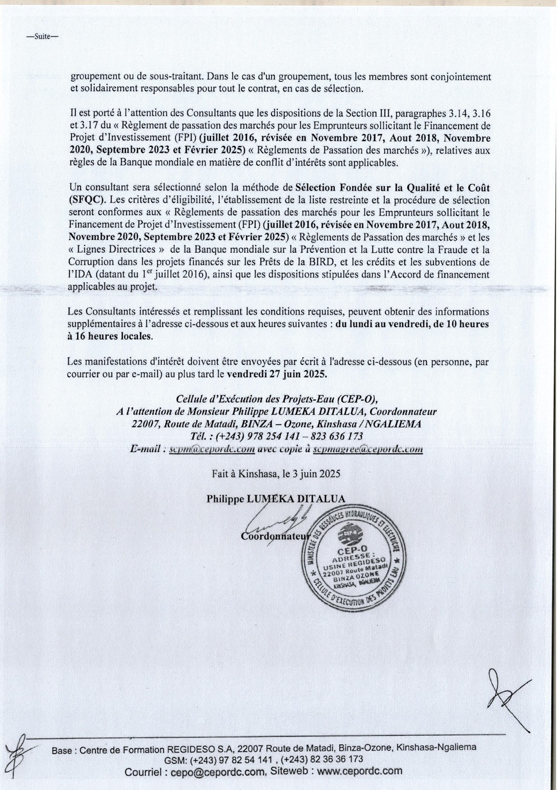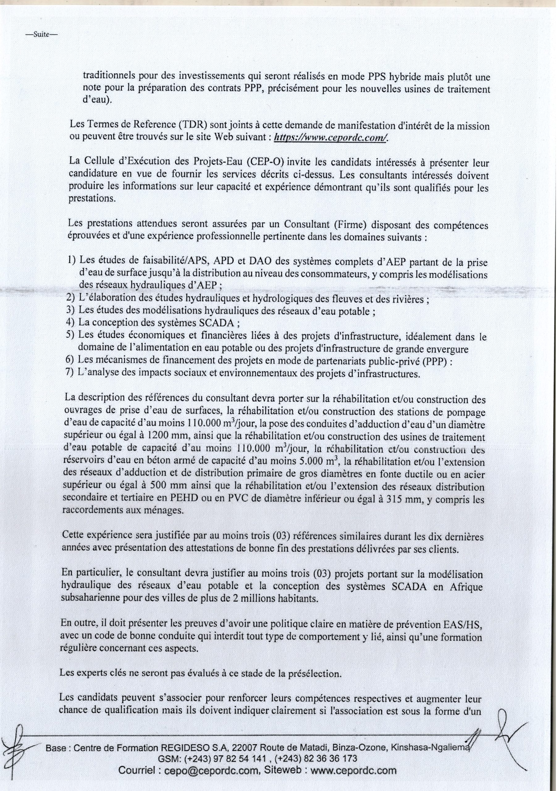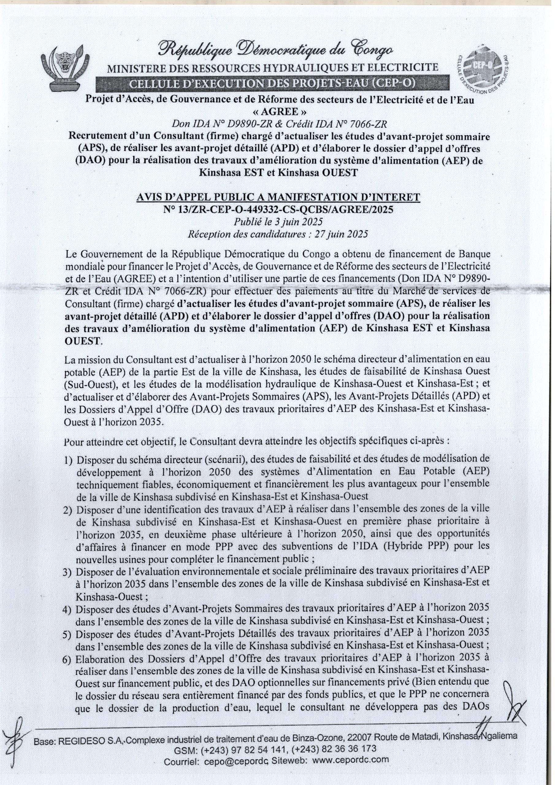 Recrutement d’un Consultant (firme) chargé d’actualiser les études d’avant-projet sommaire (APS), de réaliser les avant-projet détaillé (APD) et d’élaborer le dossier d’appel d’offres (DAO) pour la réalisation des travaux d’amélioration du système d’alimentation (AEP) de Kinshasa EST et Kinshasa OUEST.