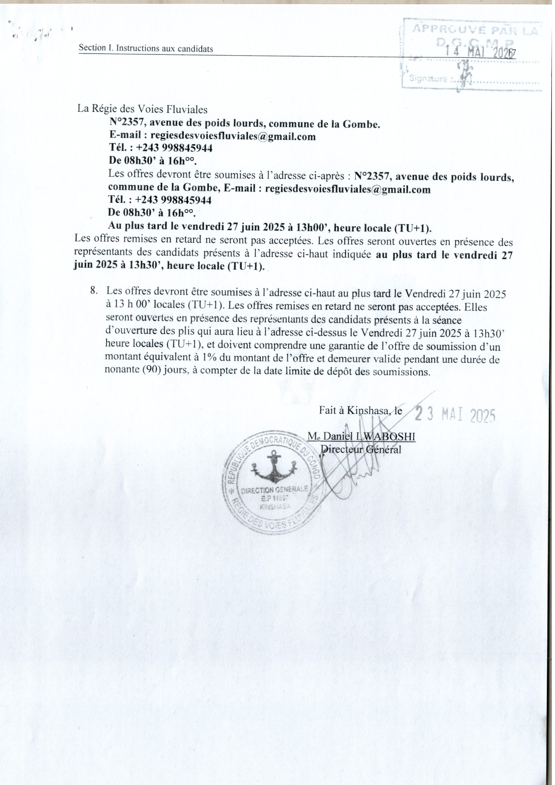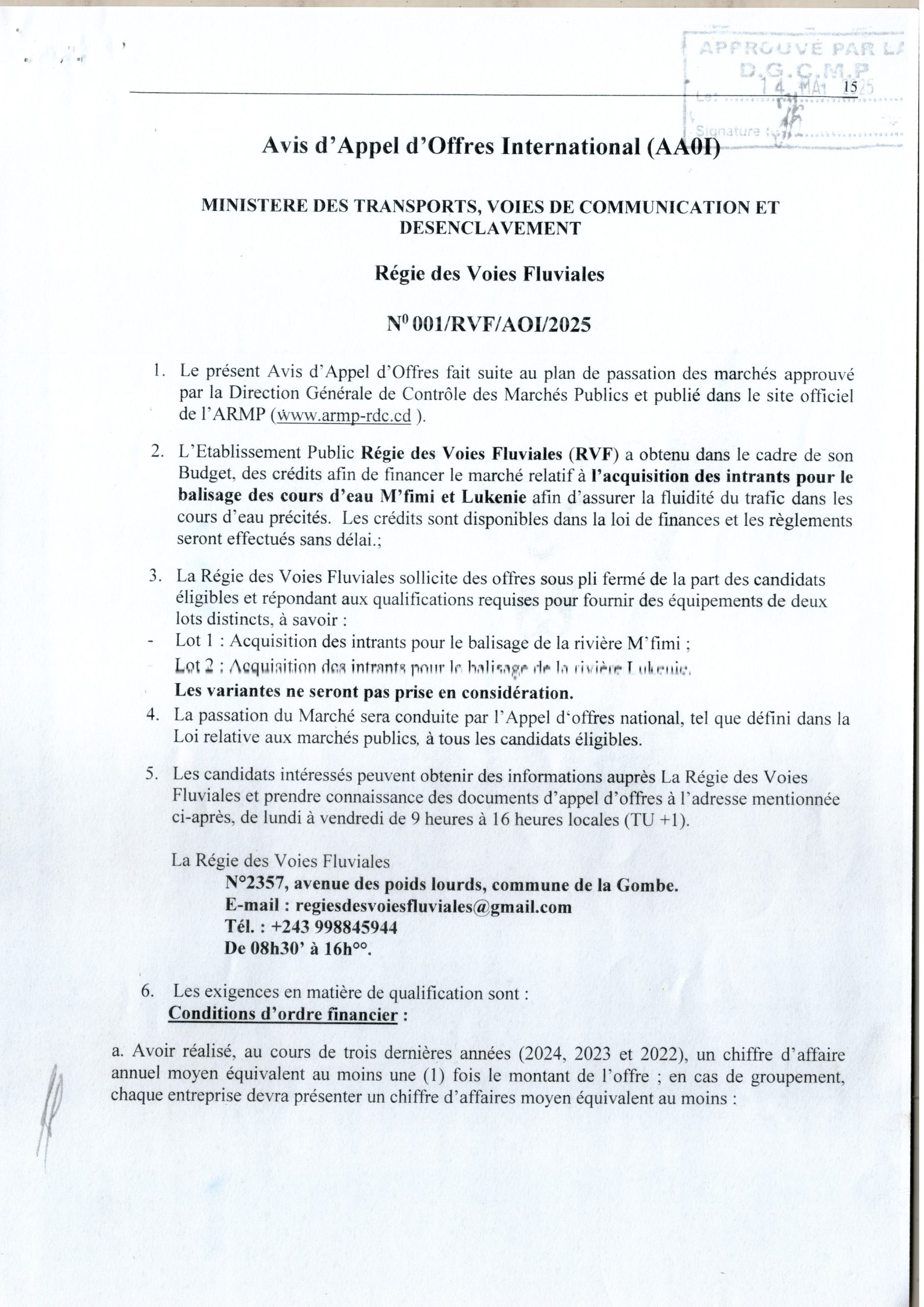 Acquisition des intrants pour le balisage des cours d’eau Sankuru, Kasaï et Kwilu afin en trois (03) lots disctincts.