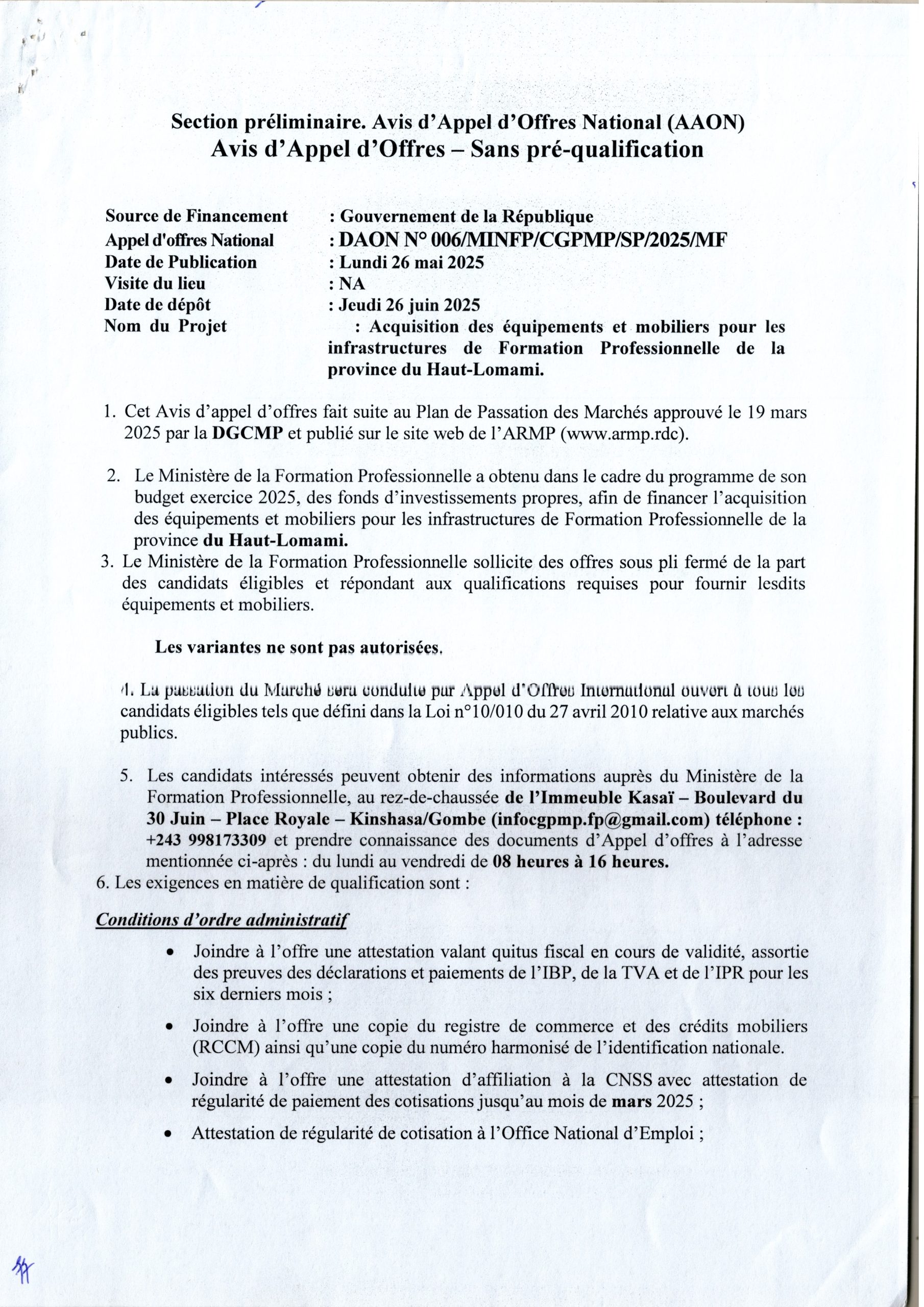 Acquisition des équipements et mobiliers pour les infrastructures de Formation Professionnelle de la Province du Haut-Katanga en République Démocratique du Congo