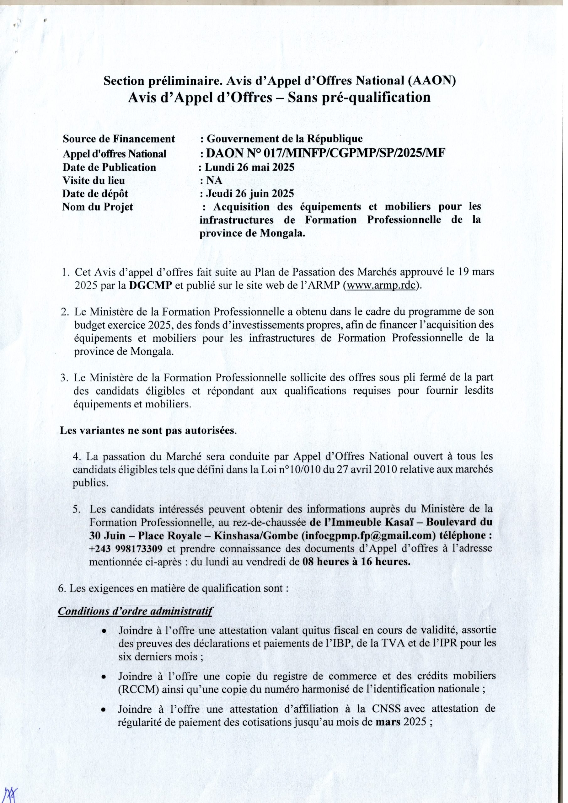 Acquisition des équipements et mobiliers pour les infrastructures de formation professionnelle de la Province de la Mongala.