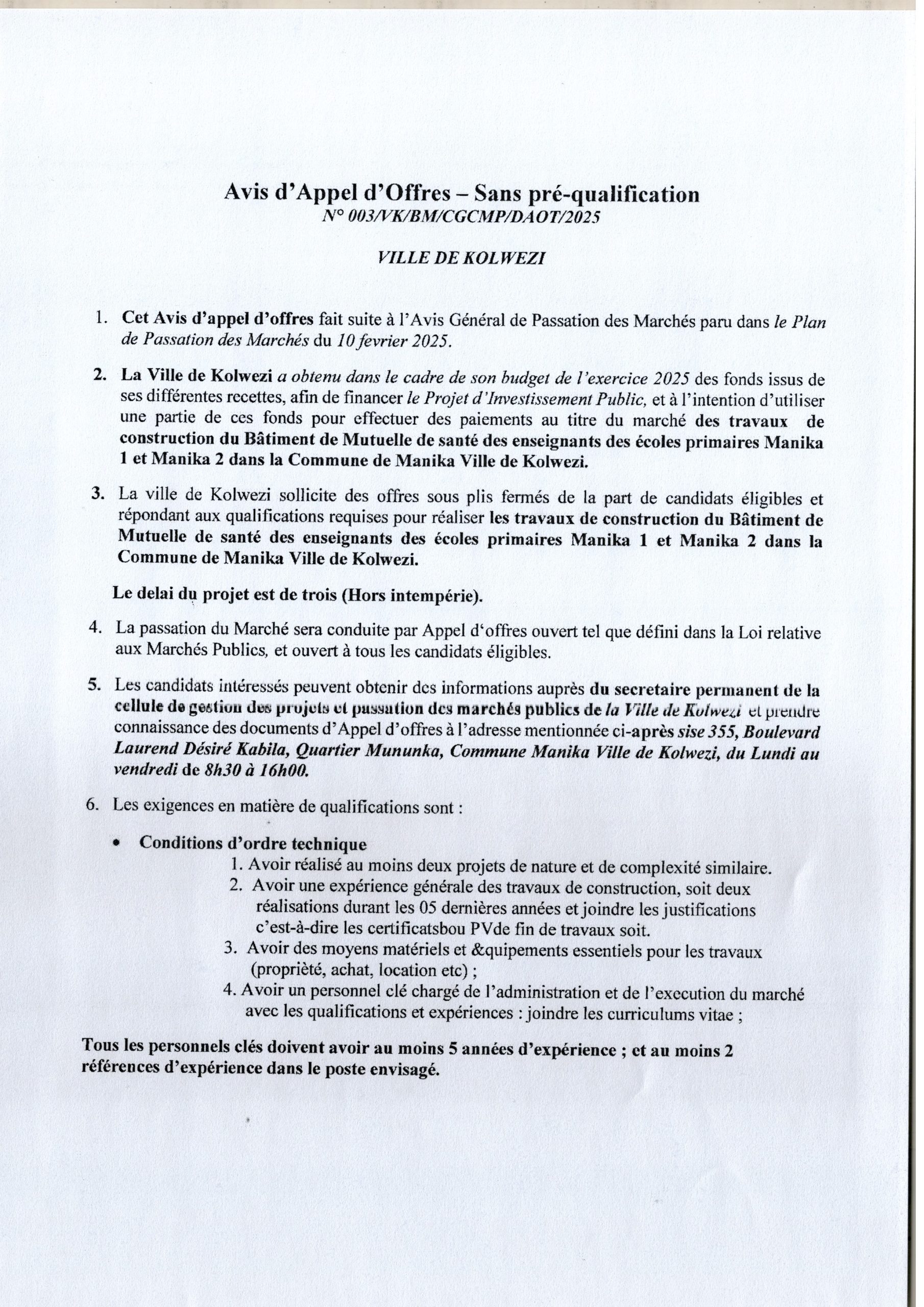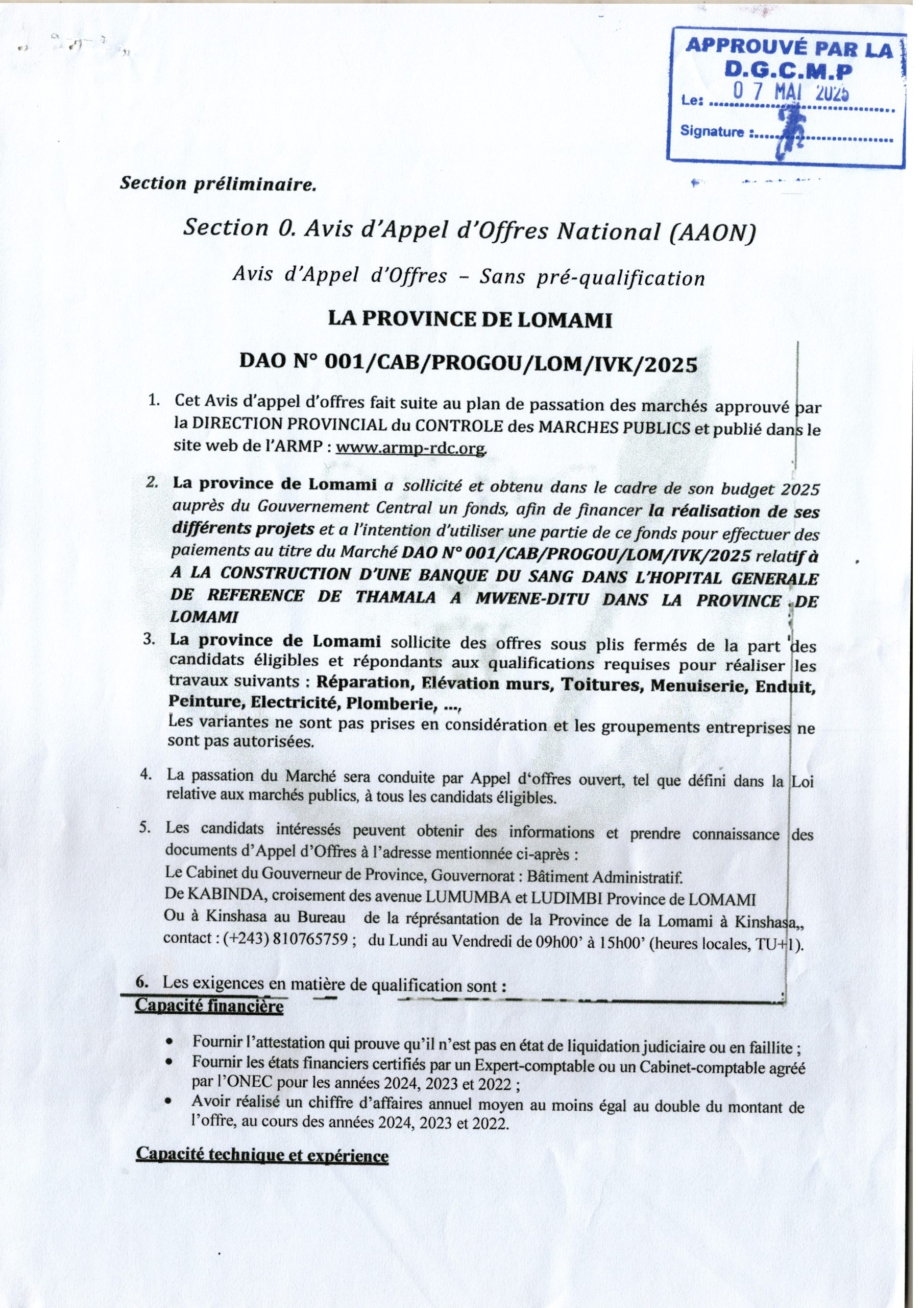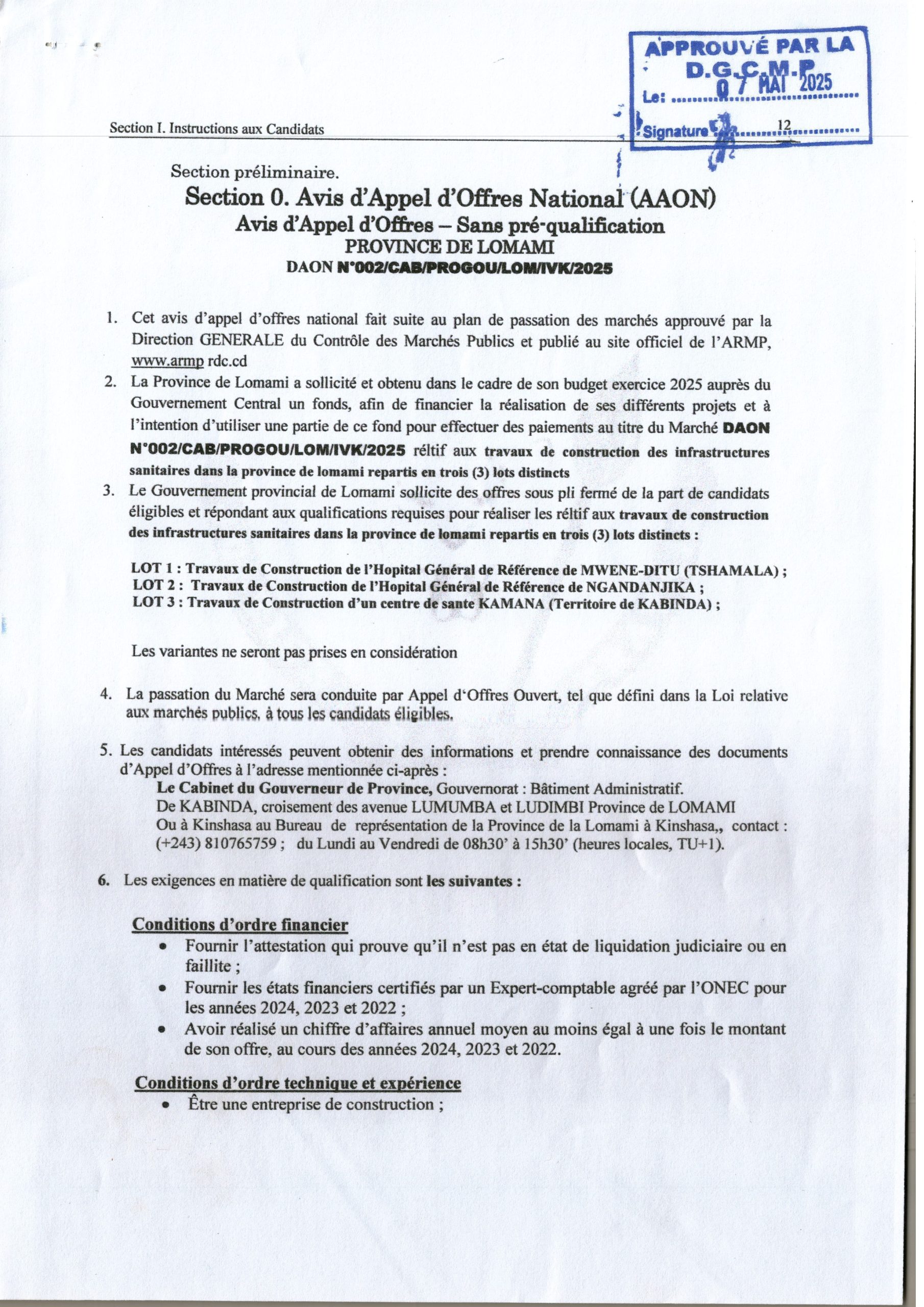 Travaux de construction des infrastructures sanitaires dans la province de Lomami repartis en trois (3) lots distincts