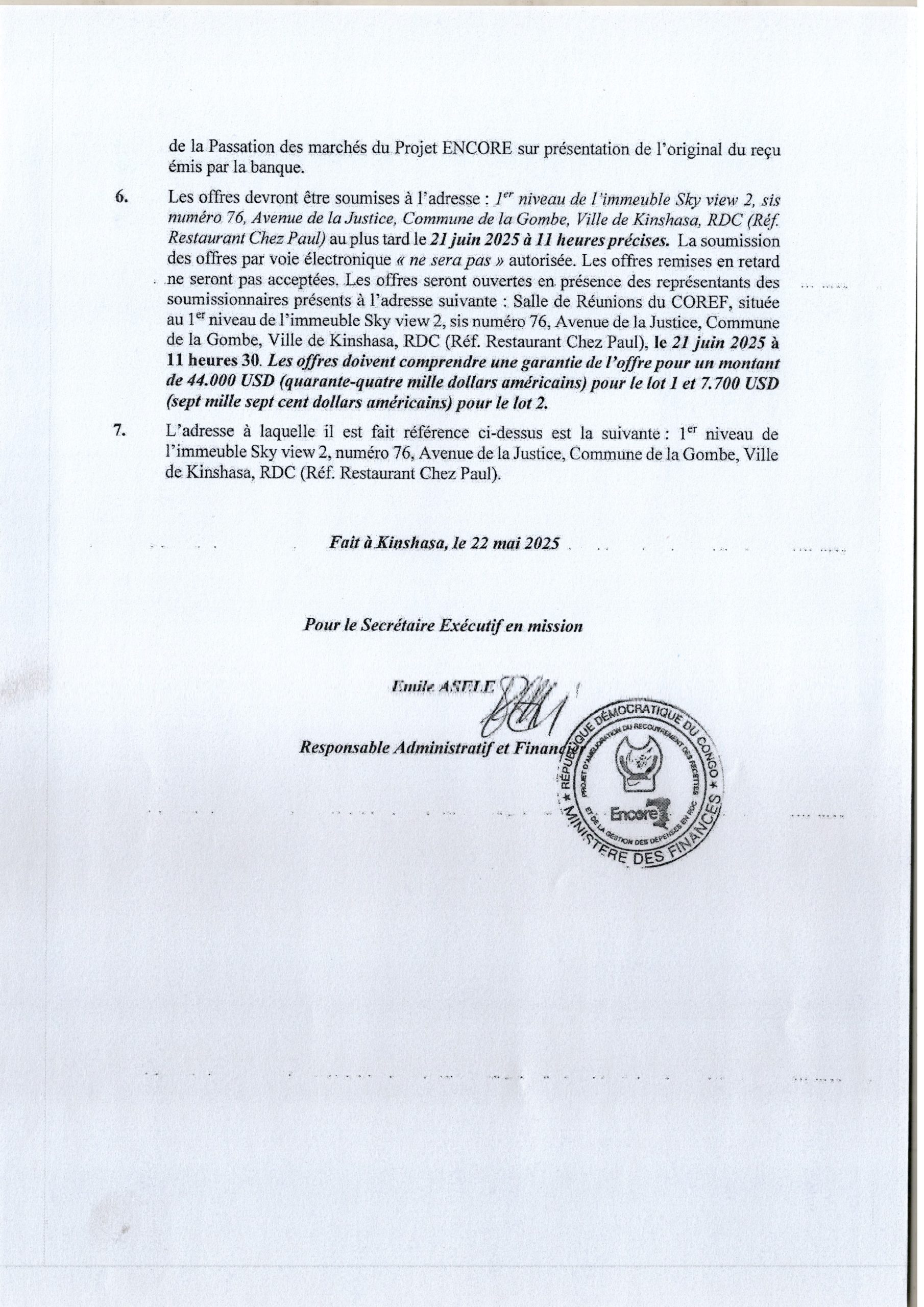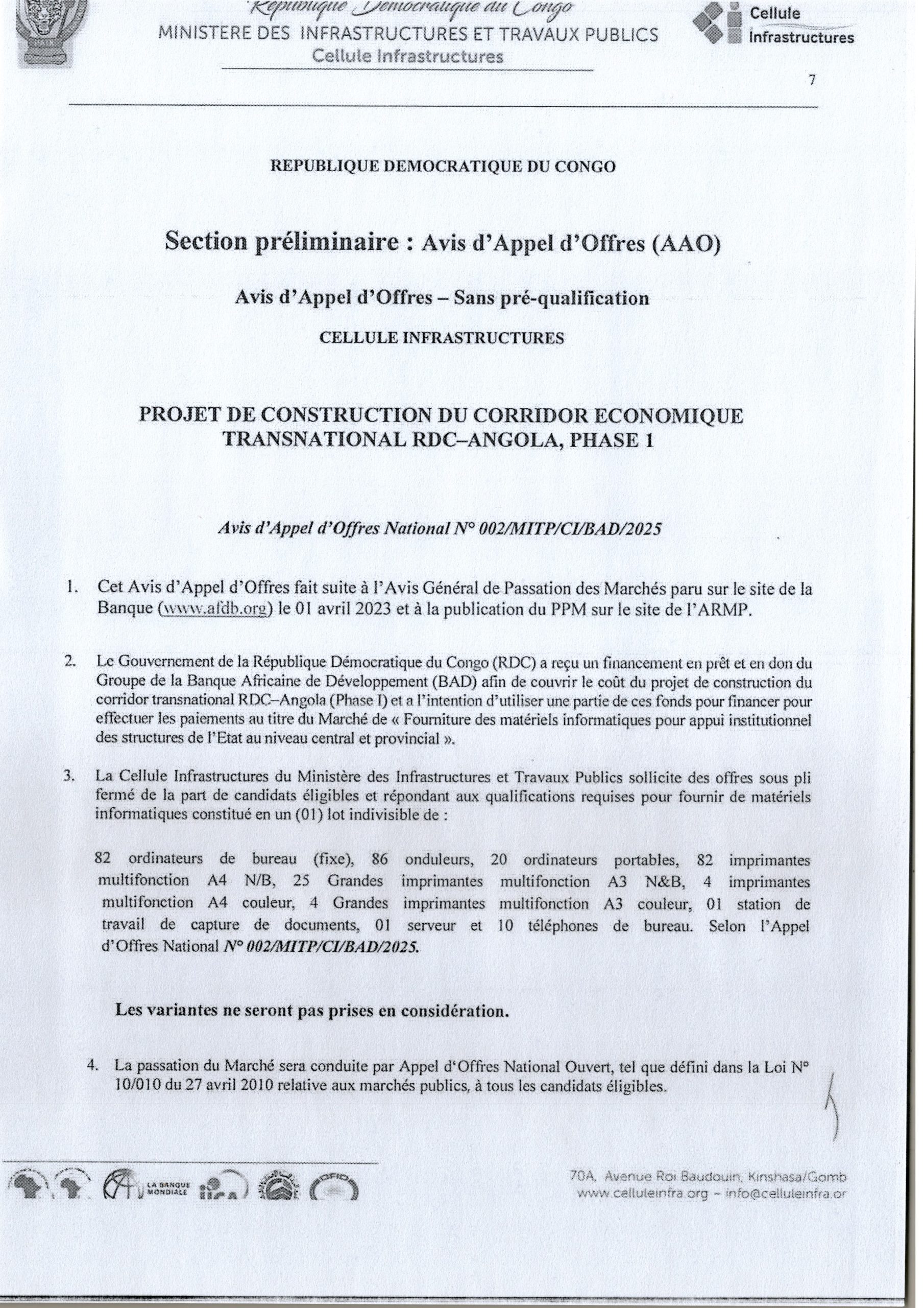 Acquisition des matériels informatiques et consommables en 2 lots distincts : Lot 1 : Pour les services d’assiettes additionnels pour l’utilisation du LOGIRAD à la DGRAD – Lot 2 : Pour l’Initiative pour la Transparence dans les Industries Extractives (ITIE-RDC)