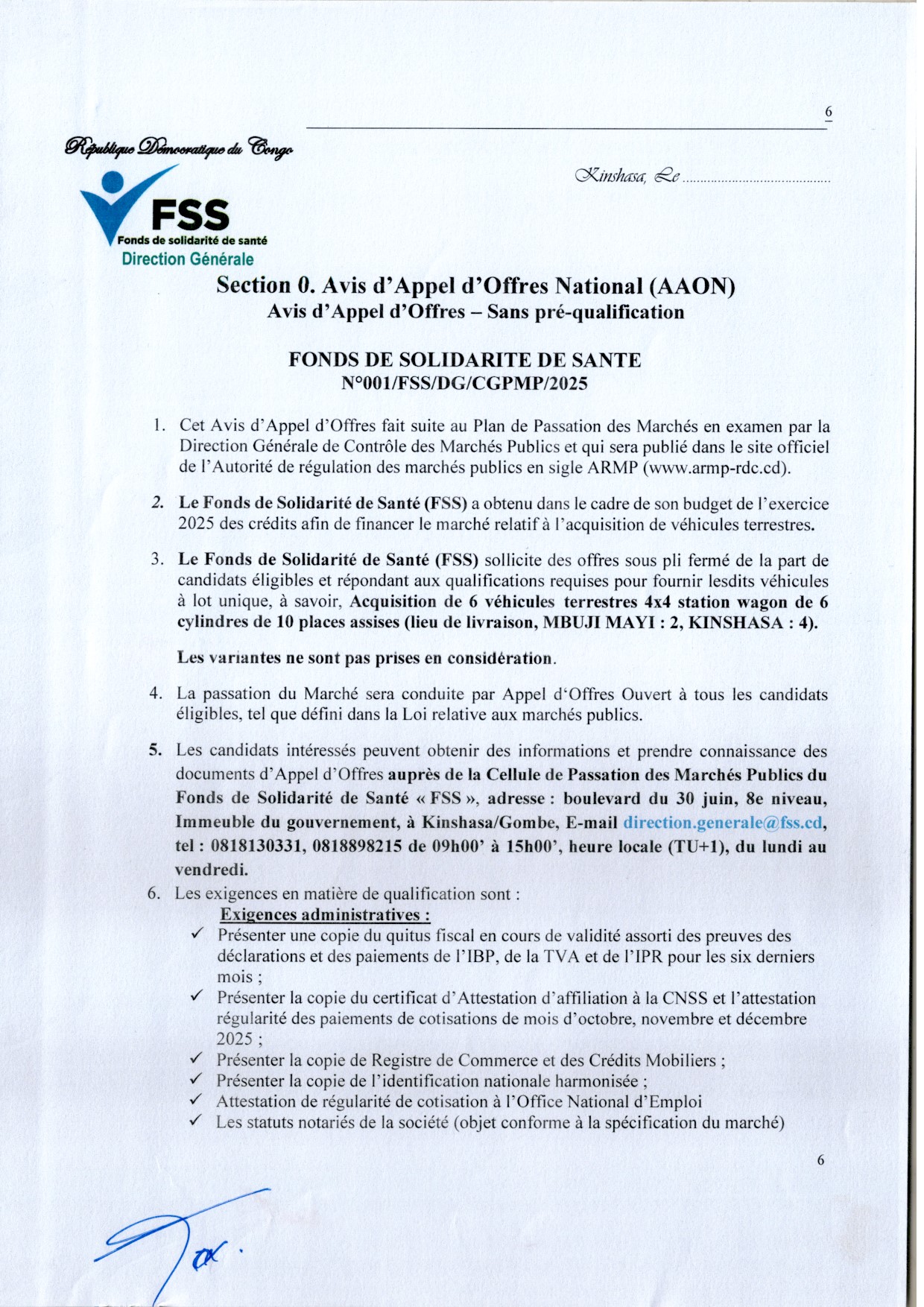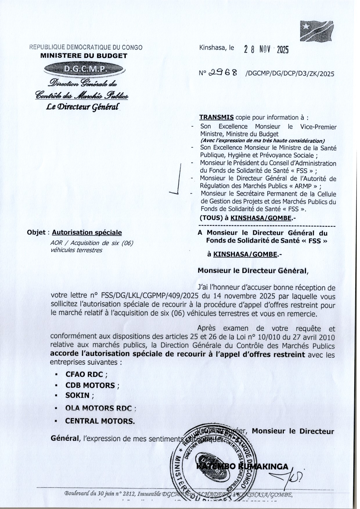 Attribution provisoire accordée au GRAND INTERNATIONAL GROUP LLC relative aux études techniques et au contrôle des travaux de réhabilitation de la voirie urbaine de la ville de Kinshasa : Avenue Kasai (tronçon Camp Faza- Boulevard du 30 juin) au bureau d’études