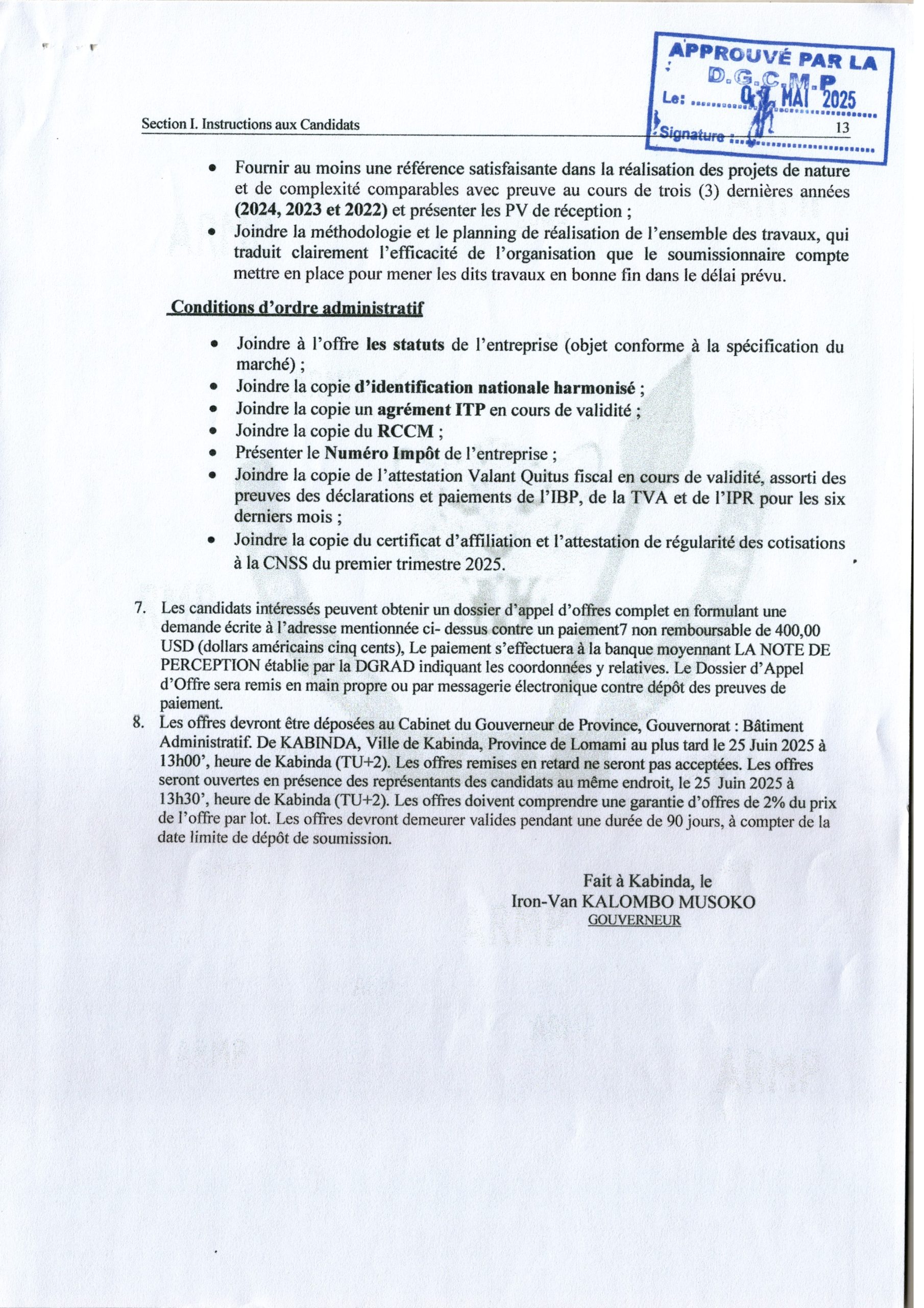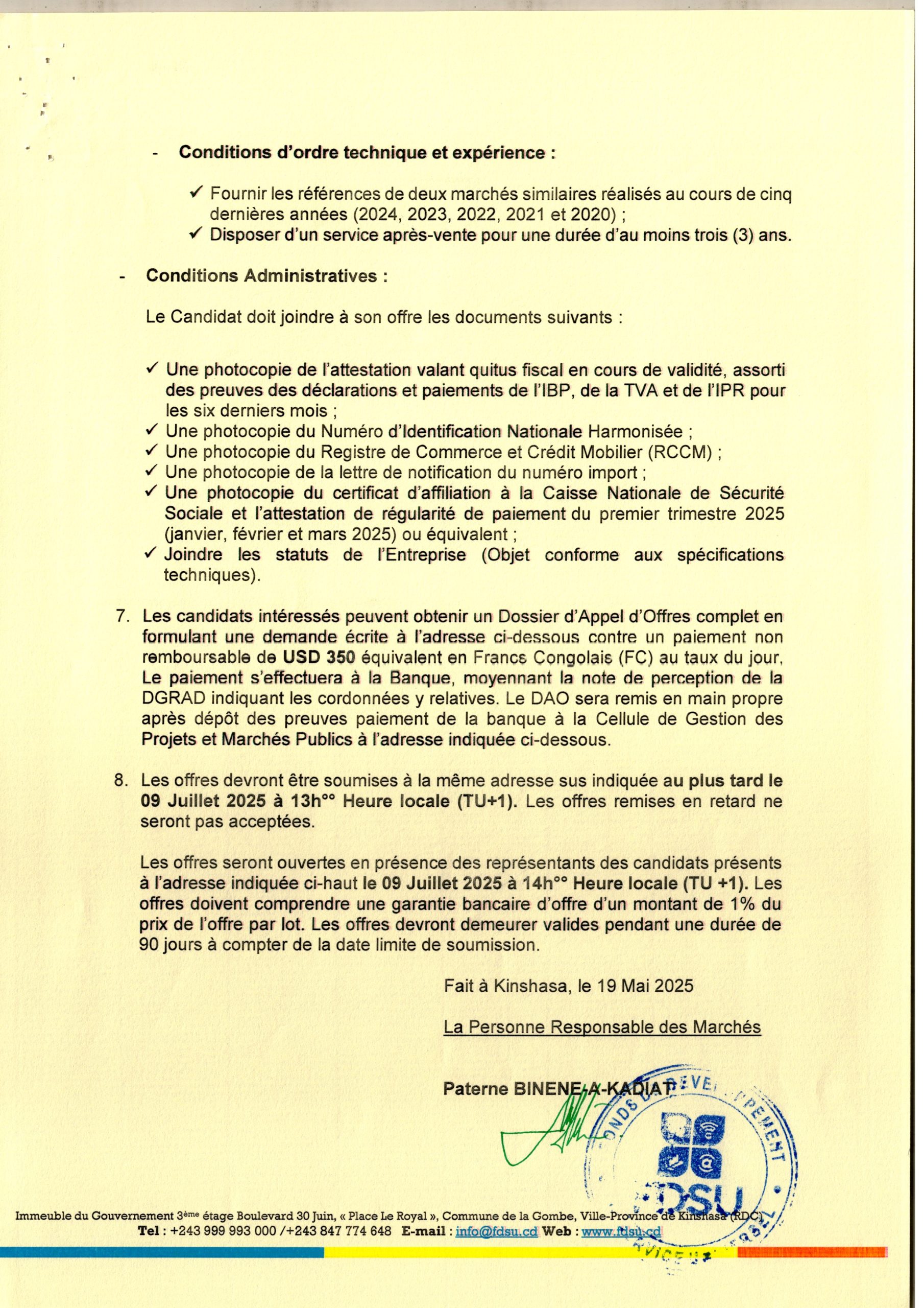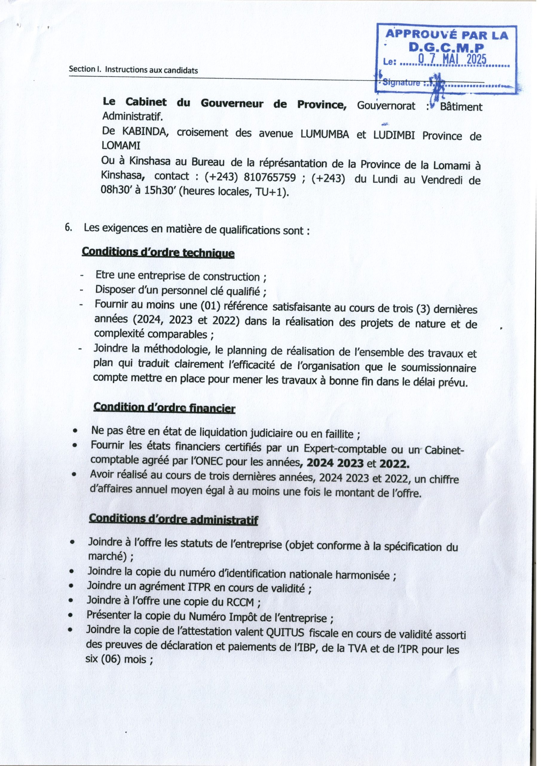 Attribution provisoire accordée au Groupement WEZA INVESTMENTS ET COMPAGNIE AFRICAINE DE CONSTRUCTION relative aux travaux de réhabilitation, reconstruction, et/ou modernisation de 27 km de la voirie urbaine sur 8 axes principaux prioritaires de la ville de Kinshasa répartis en 6 lots distincts.