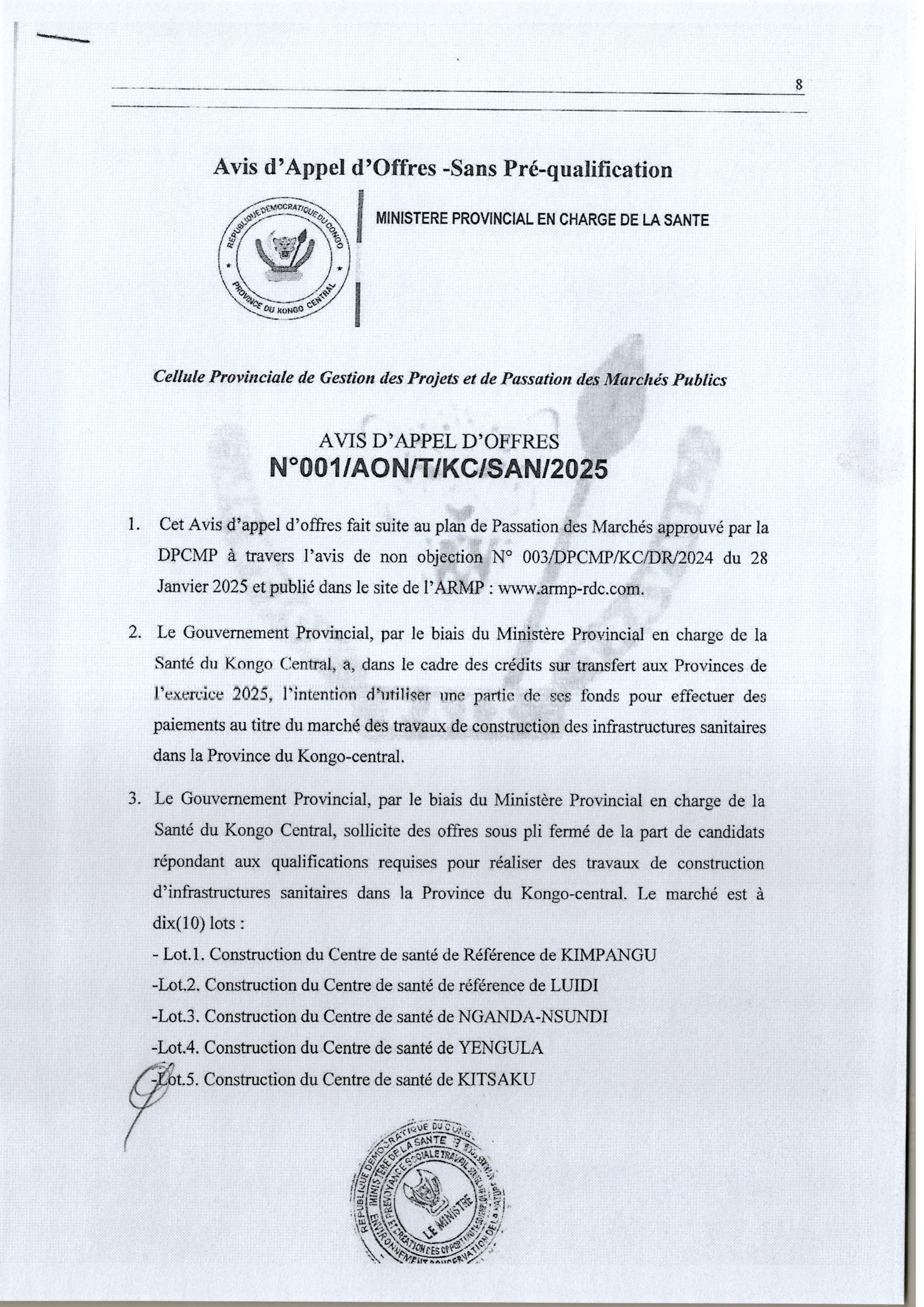 Attribution provisoire accordée à l’Entreprise SAFRIMEX SARLU relative aux travaux de réhabilitation, reconstruction et/ou modernisation de 27 km de la voirie urbaine sur 8 axes principaux prioritaires de la ville de Kinshasa lot 5…….