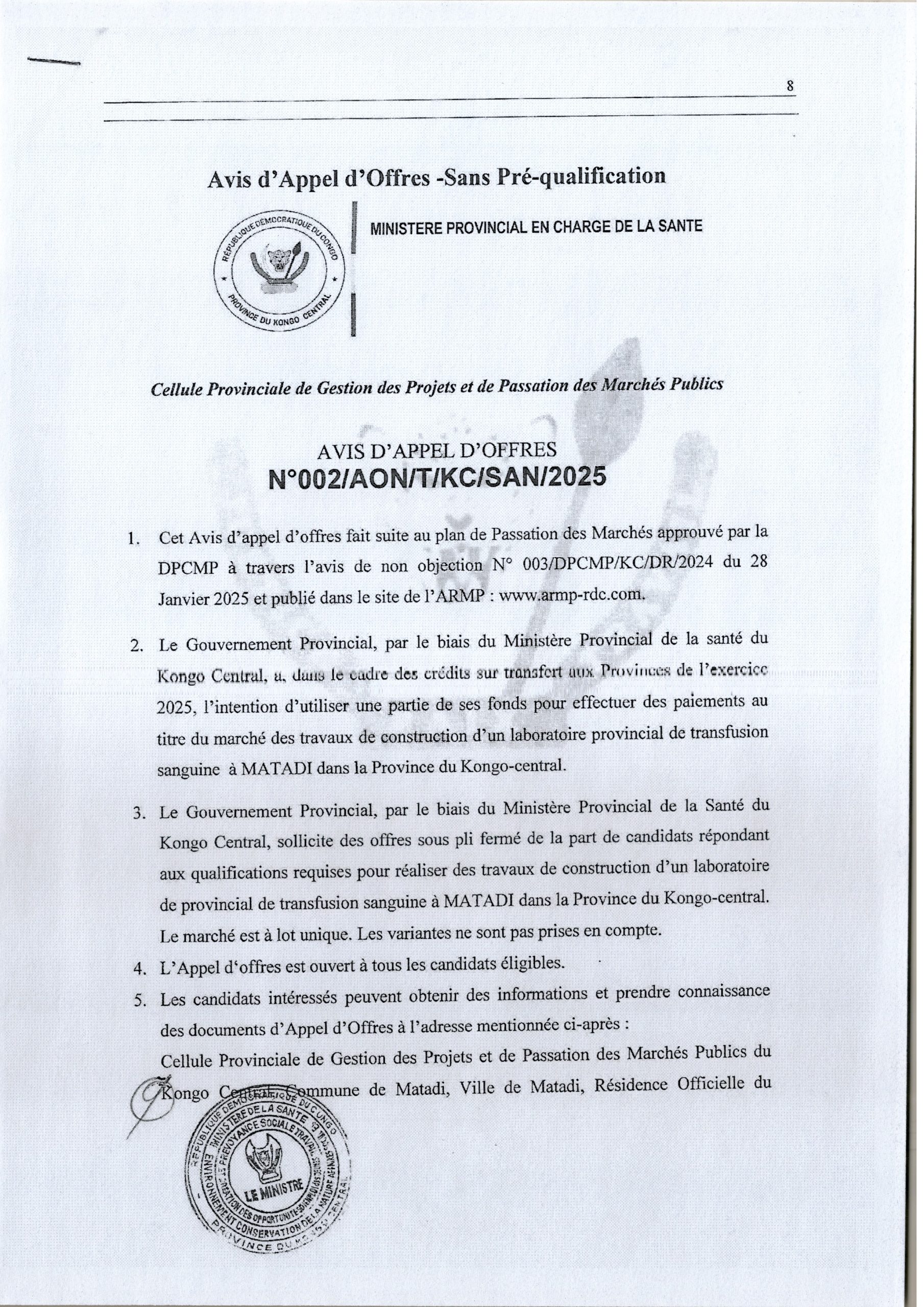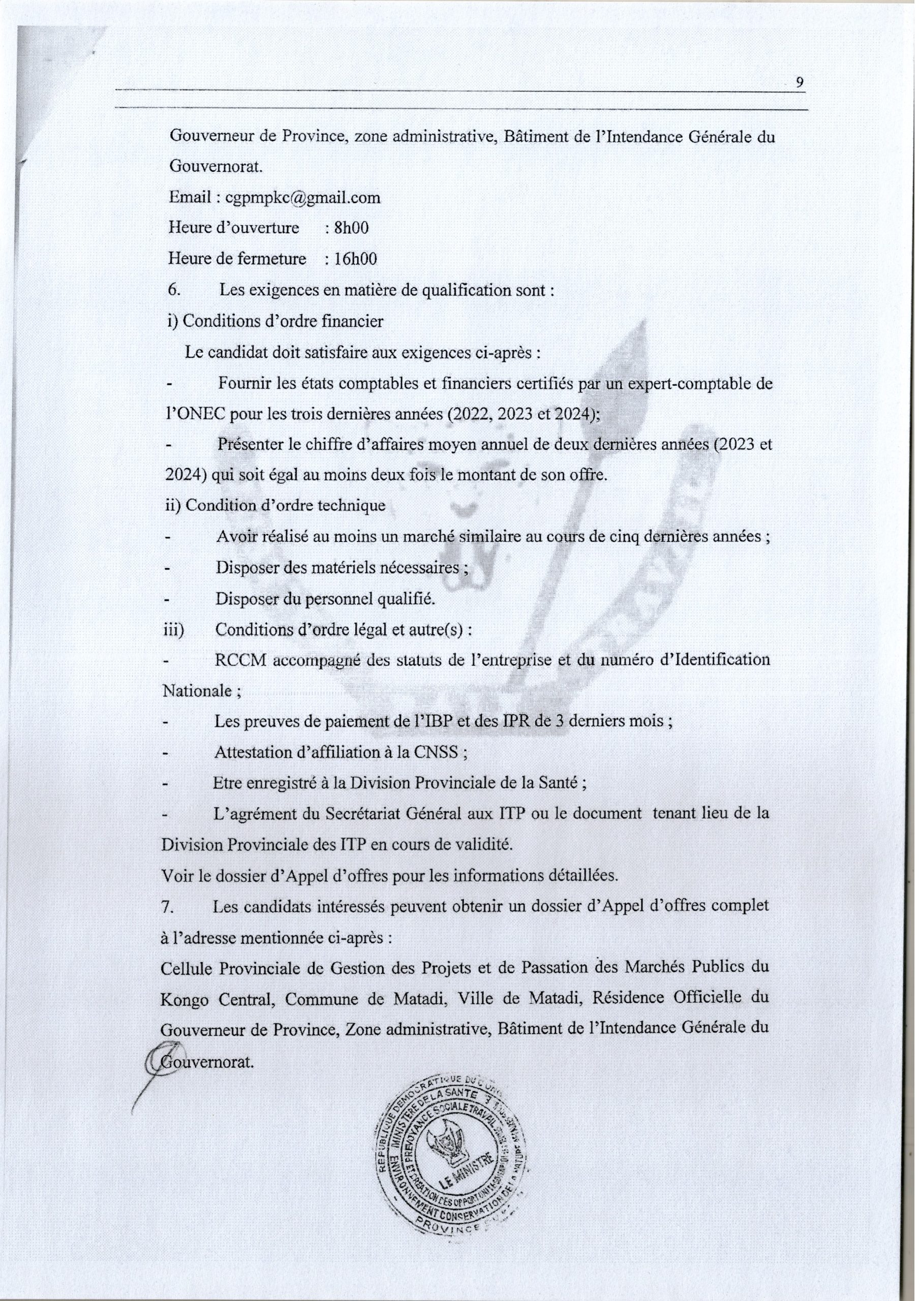 Attribution définitive accordée à Mr MAMBU MAMBU Gabriel relative au recrutement d’un consultant pour la réalisation d’une étude pour la réhabilitation de l’hôpital général de référence de Kananga pour recevoir le don du projet CURE en matériels et équipements médicaux.
