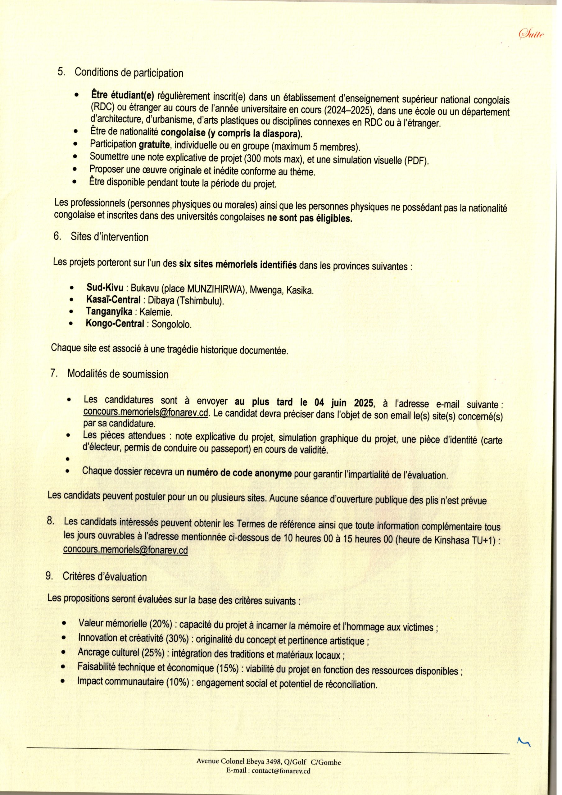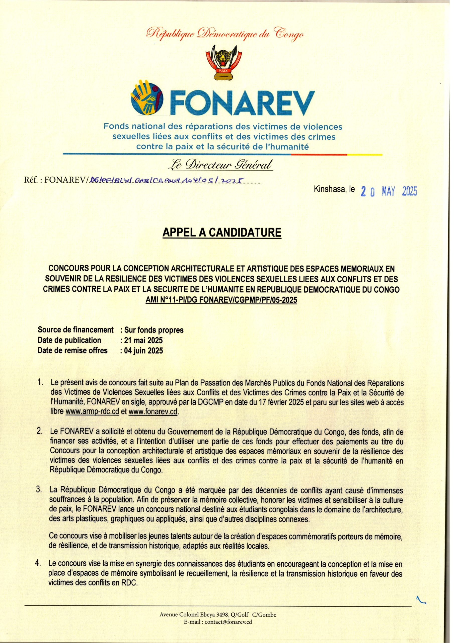 Avis à candidature sur le concours pour la conception architecturale et artistique des espaces mémoriaux en souvenir de la résilience des victimes des violences sexuelles liées aux conflits et des crimes contre la paix et la sécurité de l’humanité en RDC.