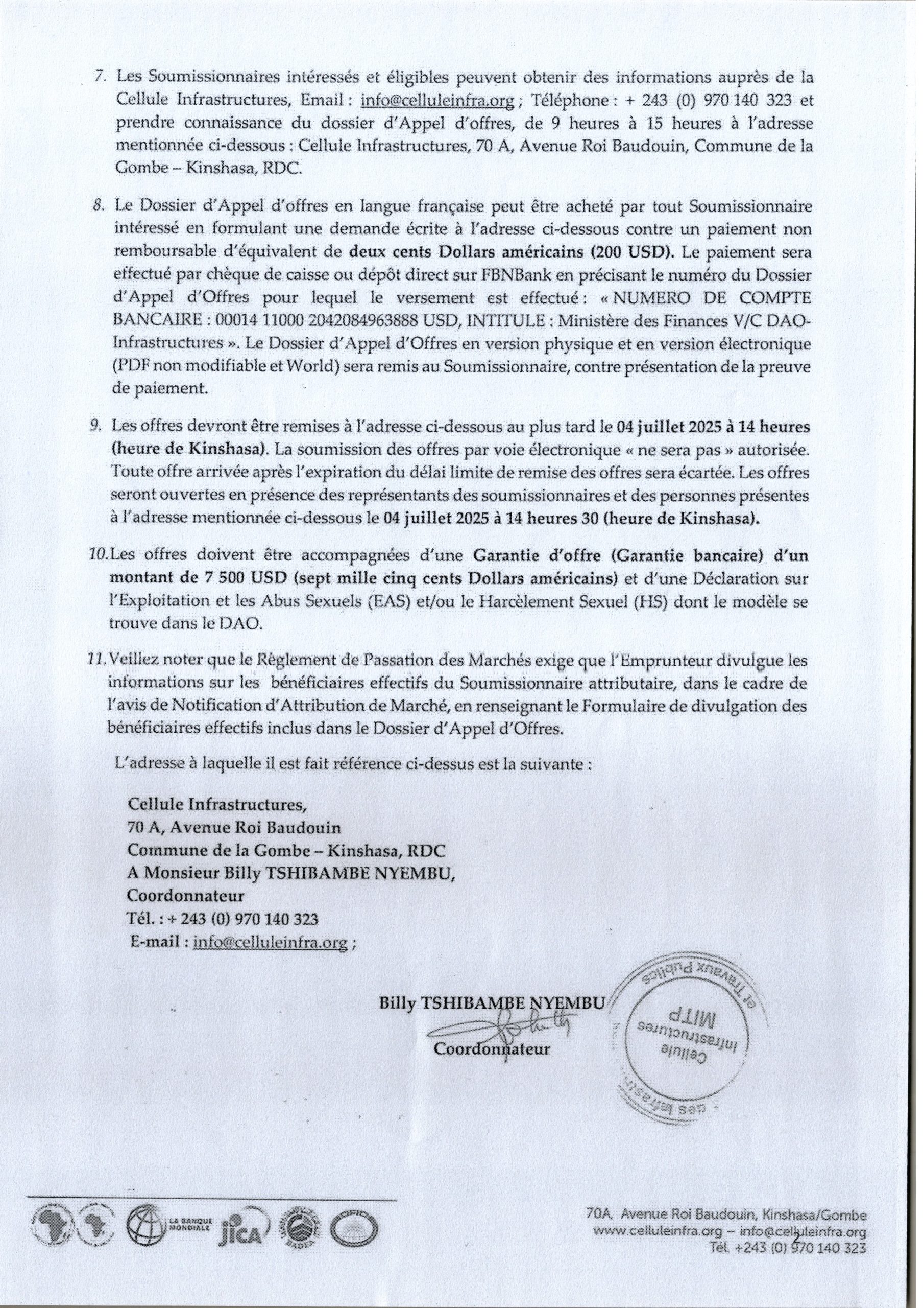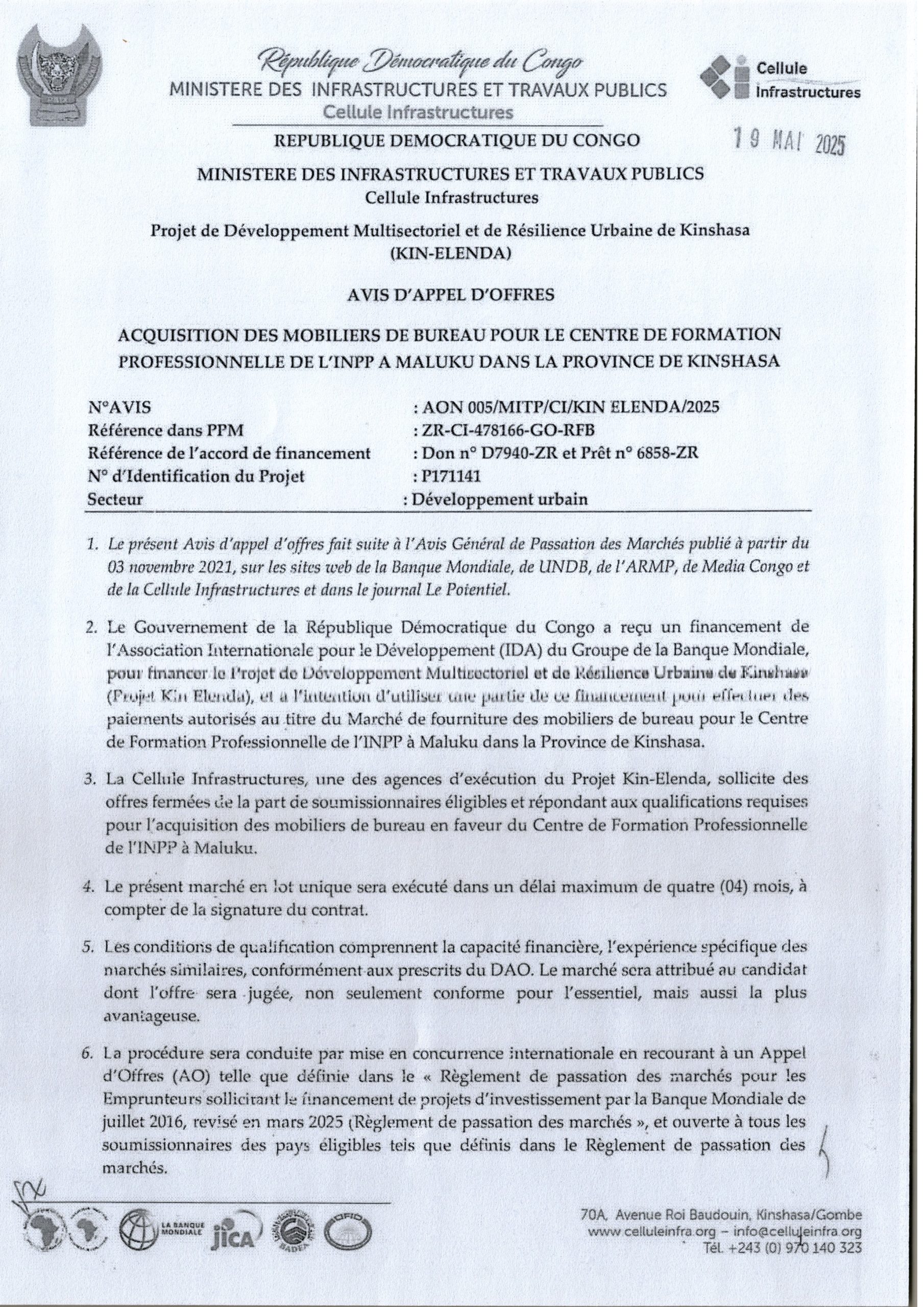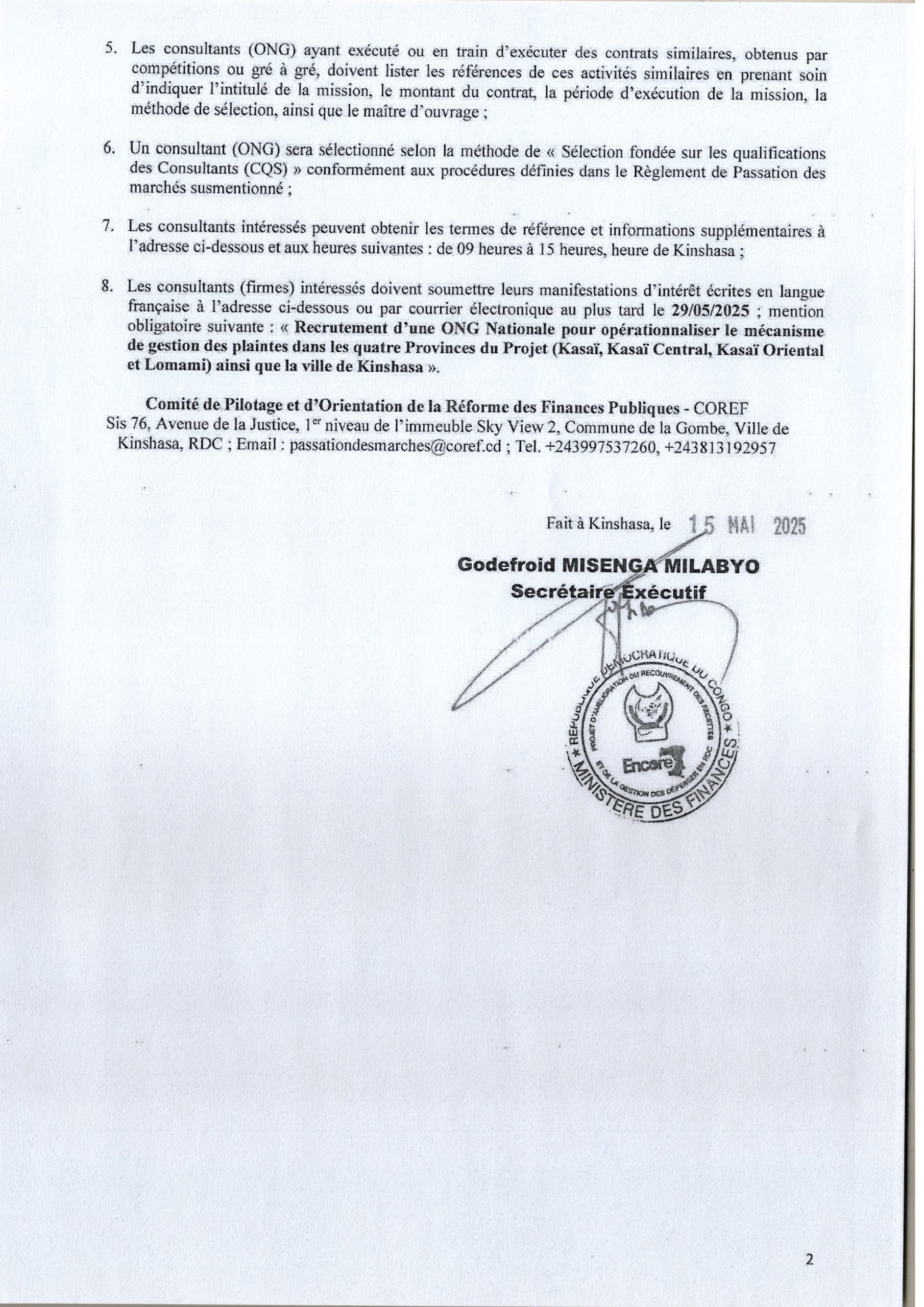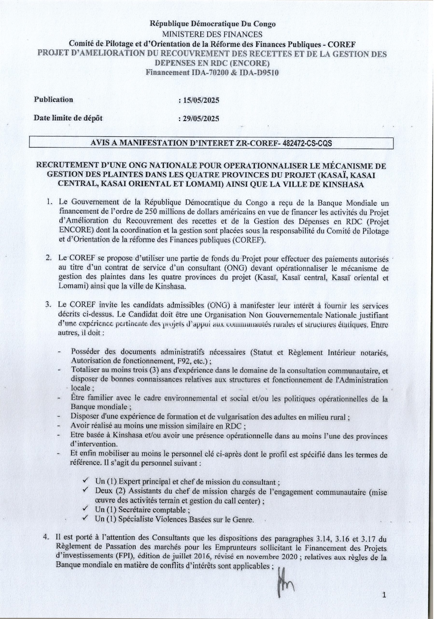 Recrutement d’une ONG Nationale pour opérationnaliser le Mécanisme de Gestion des plantes dans les quatre Provinces du Projet (Kasaï, Kasaï Central, Kasï Oriental et Lomami) ainsi que la Ville de Kinshasa