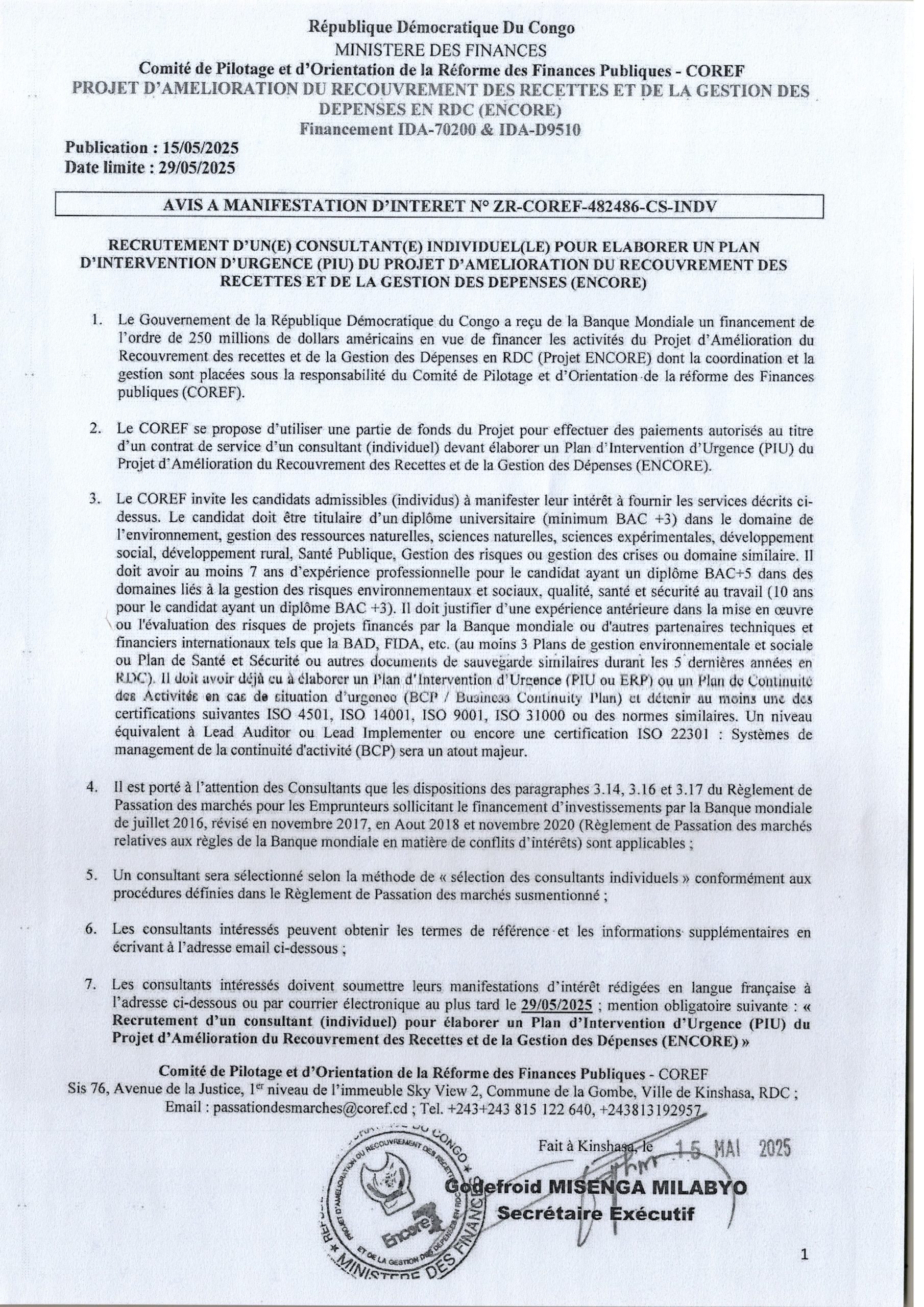 Recrutement d’un(e) Consultant(e) individuel(le) pour élaborer un plan d’Intervention d’Urgence (PIU) du Projet d’amélioration du recouvrement des recettes et de la gestion des défenses (ENCORE)