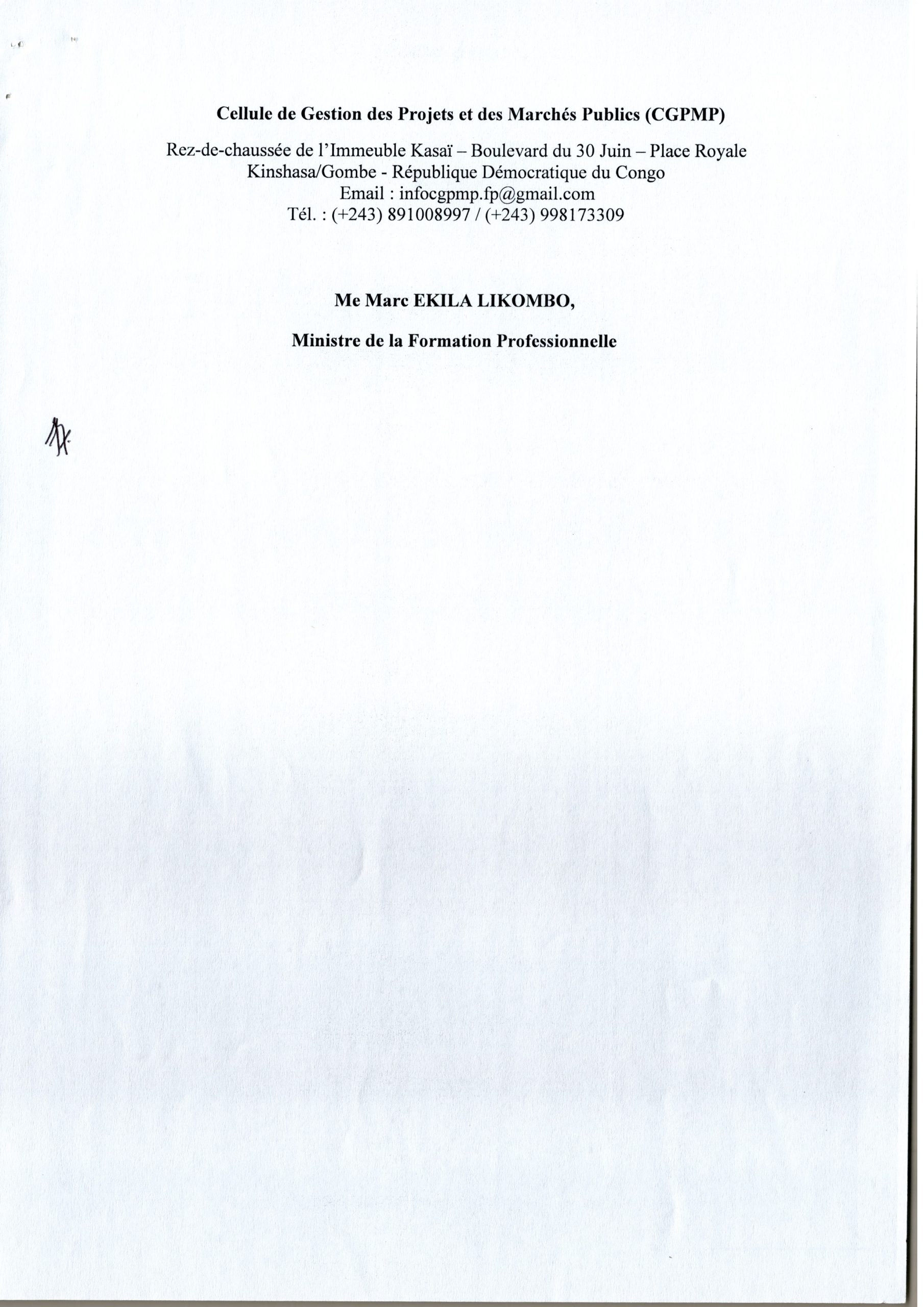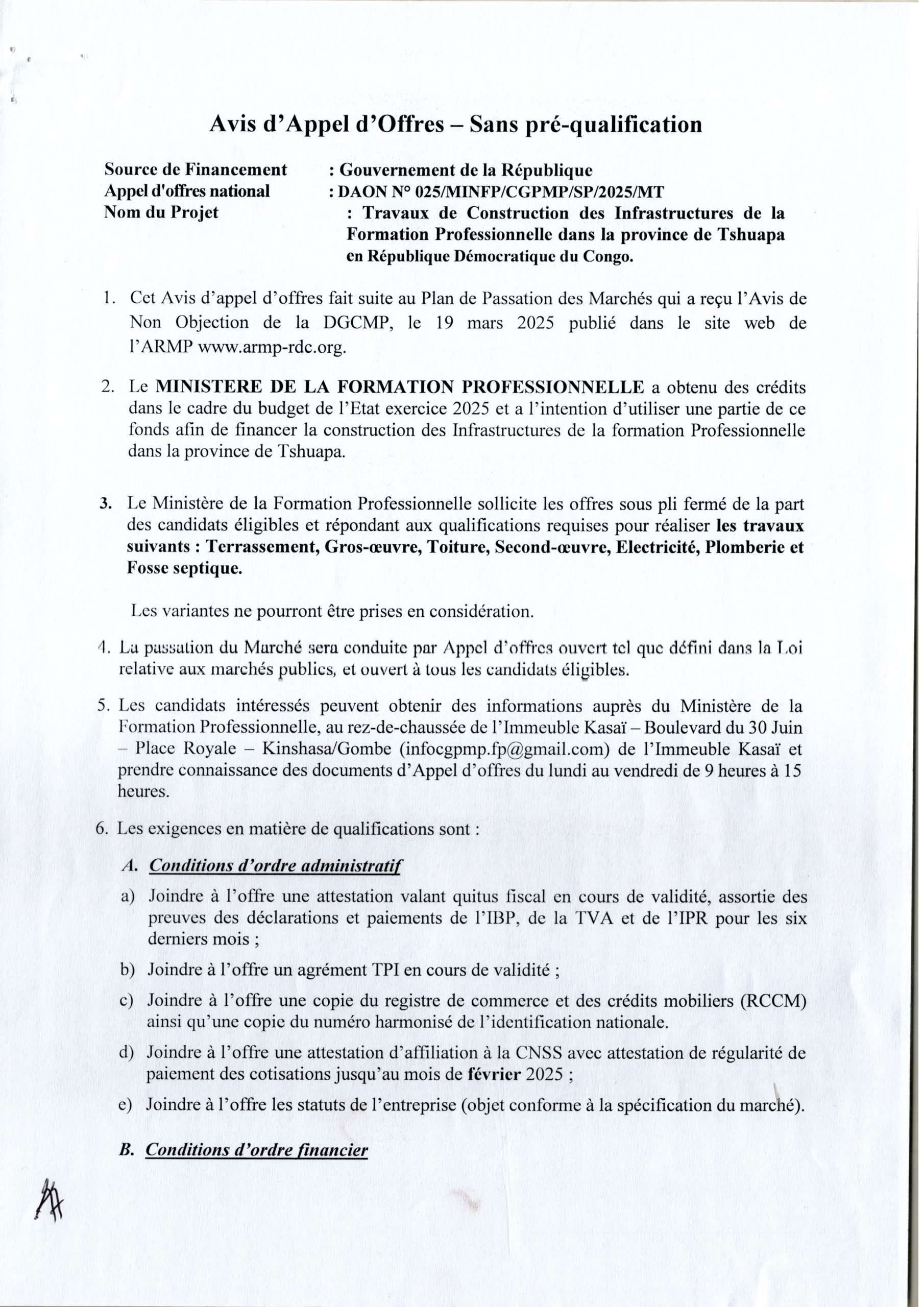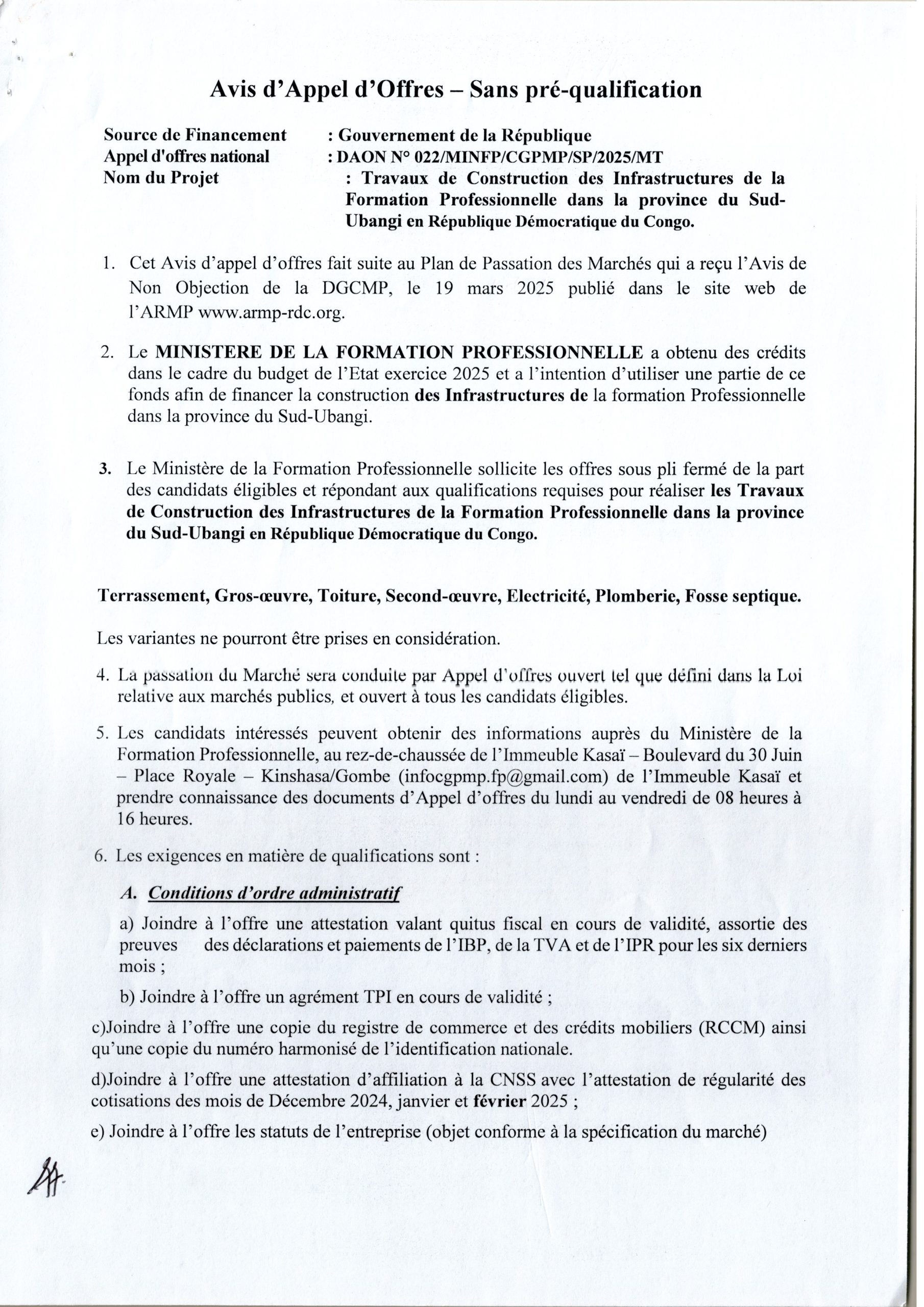 Travaux de Construction de dix (10) centres de formation professionnelle dans les territoires du Kasaï-Central et Kasaï-Oriental, marché à dix (10) lots en République Démocratique du Congo