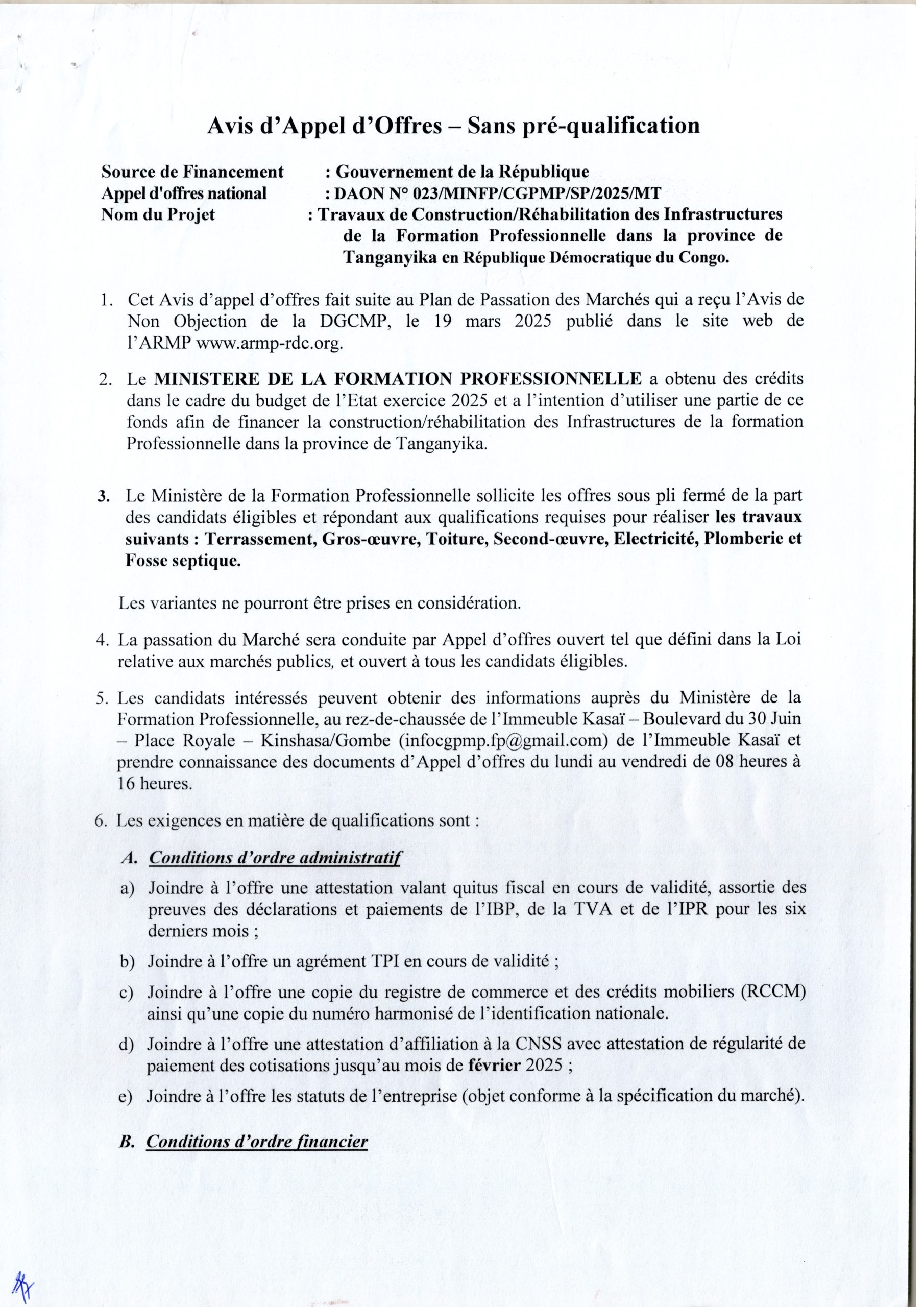 Travaux de Construction/Réhabilitation des Infrastructures de la Formation Professionnelle dans la province de Tanganyika en République Démocratique du Congo