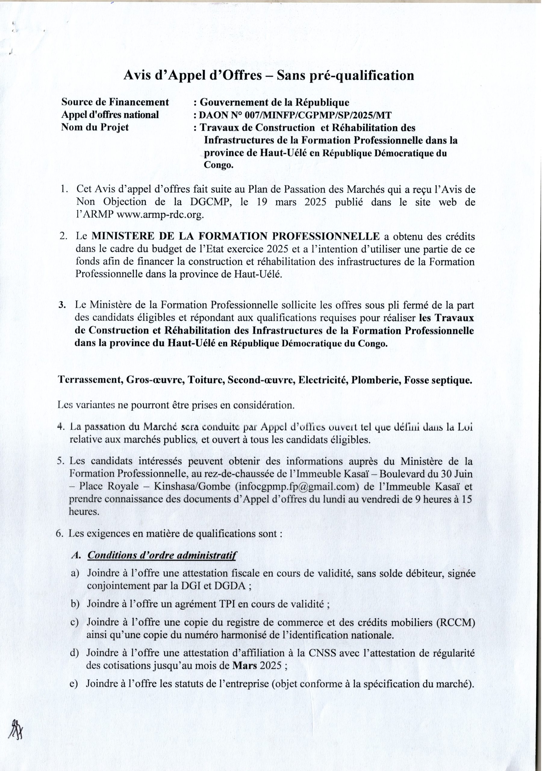 Travaux de Construction / Réhabilitation des Infrastructures de la Formation Professionnelle dans la Province du Haut-Katanga en République Démocratique du Congo
