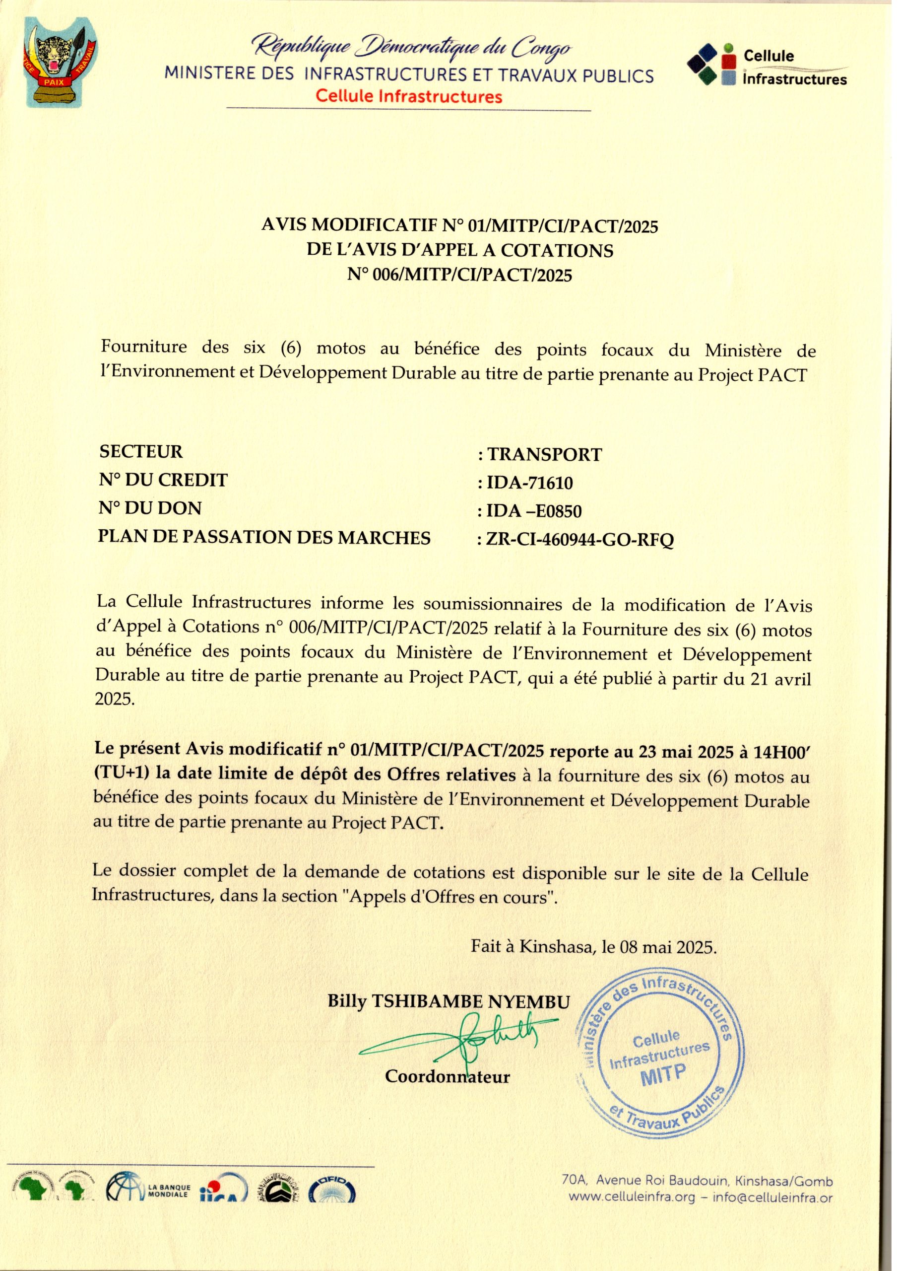 Avis modificatif de l’avis d’appel a cotation relatif au fourniture des six (06) motos au bénéfice des points focaux du Ministère de l’Environnemental et développement Durable au titre de partie prenante au Projet PACT.