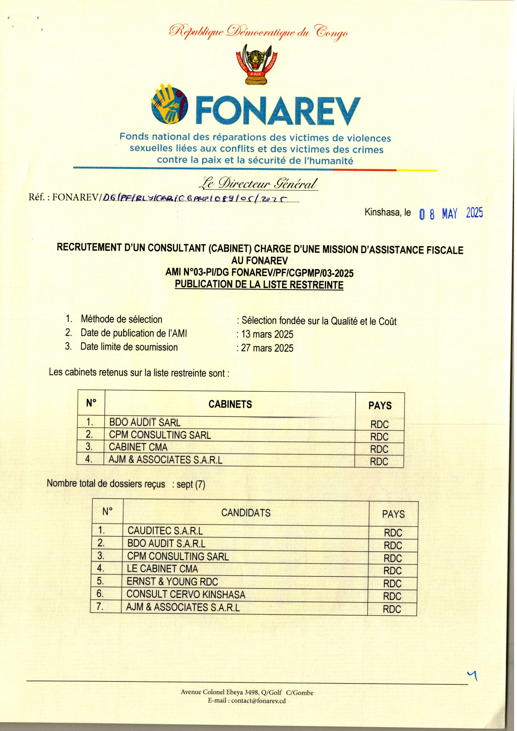 Recrutement d’un consultant (cabinet) charge d’une mission d’assistance fiscale au FONAREV.