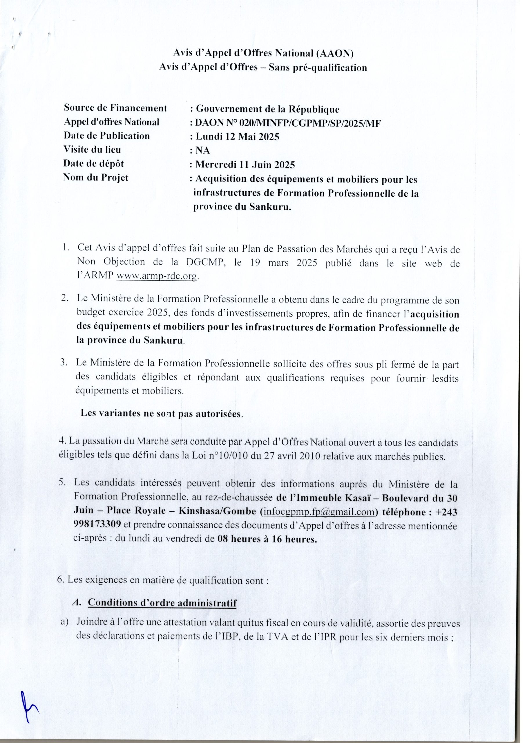 Acquisition des équipements et mobiliers pour les infrastructures de Formation Professionnelle de la province du Sankuru.