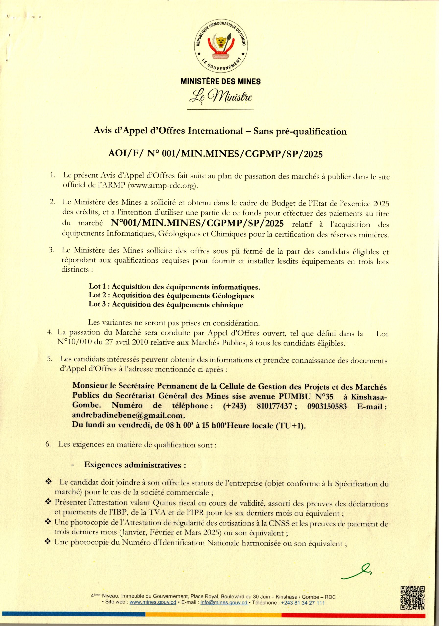 Acquisition des équipements informatiques, Géologiques et chimiques pour la certification des réserves minières (lot 1,2 et 3).