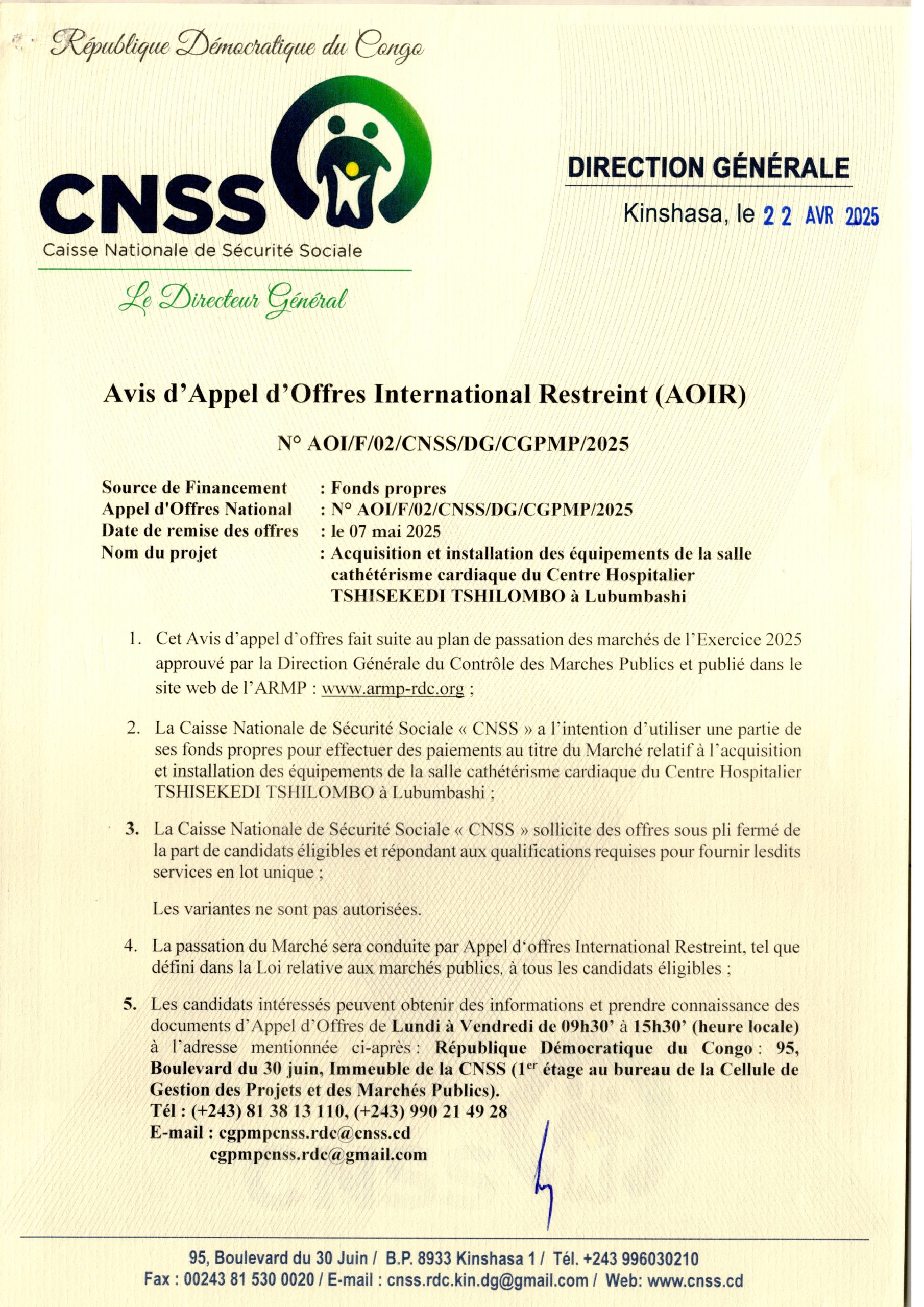Autorisation spéciale pour la reduction de délai de publicité du marché d’acquisition et installation des équipements de la salle cathétérisme cardiaque du centre médical Tshisekedi Tshilombo à Lubumbashi