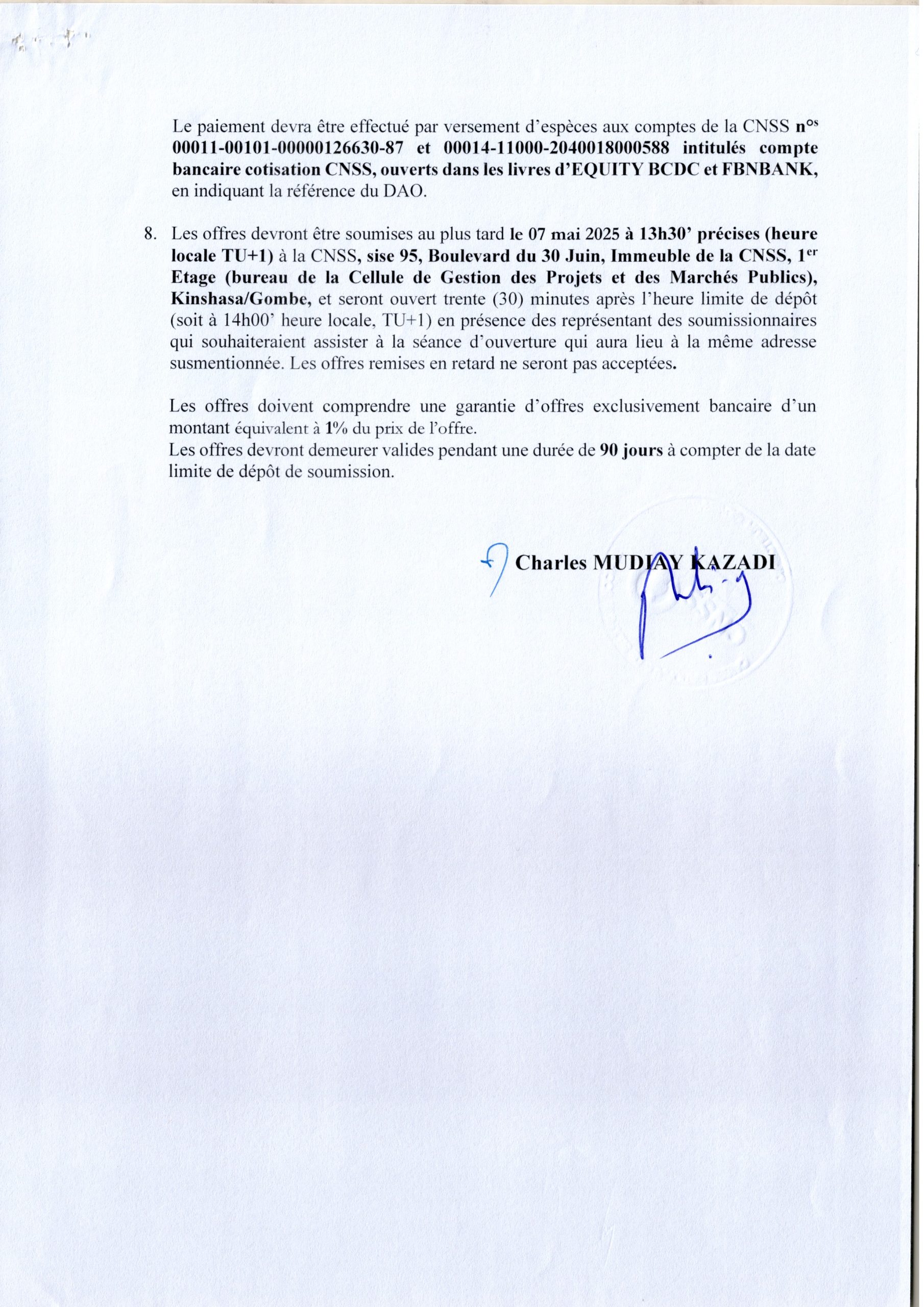 Attribution provisoire accordée au Bureau d’études 2X ENGINEERING Sarl relative au marché des services d’un consultant (Bureau d’études)devant réaliser les études techniques et mener le contrôle des travaux de réalisation, reconstruction et/ou modernisation de 27 km de la voirie urbaine sur 8 axes principaux prioritaire de la ville de Kinshasa répartis en 6 lots distincts (lot5).