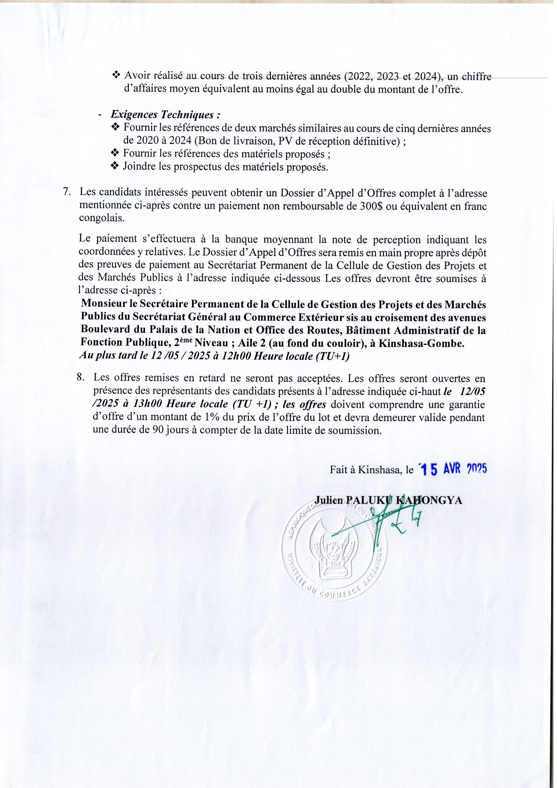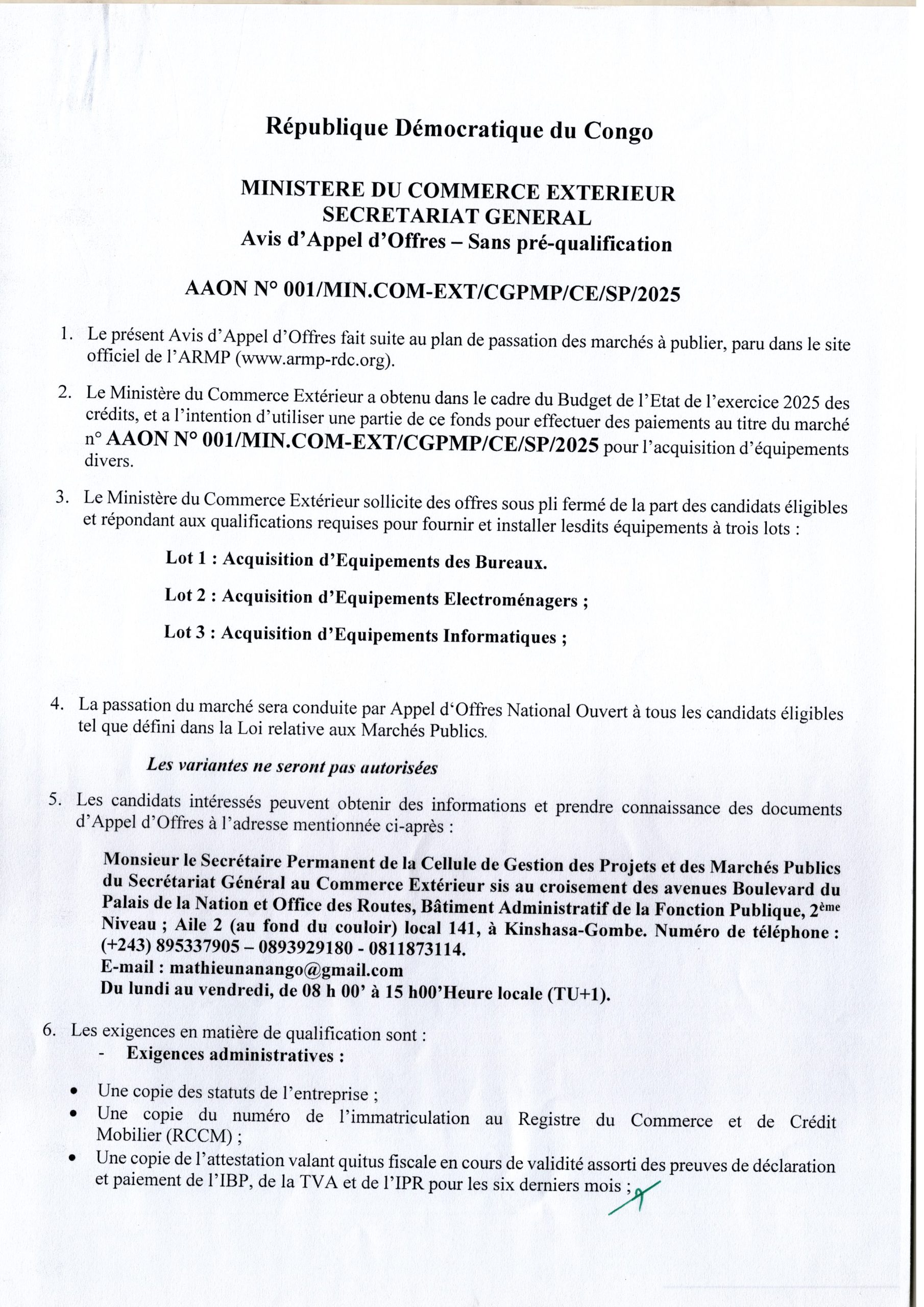Acquisition d’équipements divers en faveur de Ministère du Commerce Extérieur