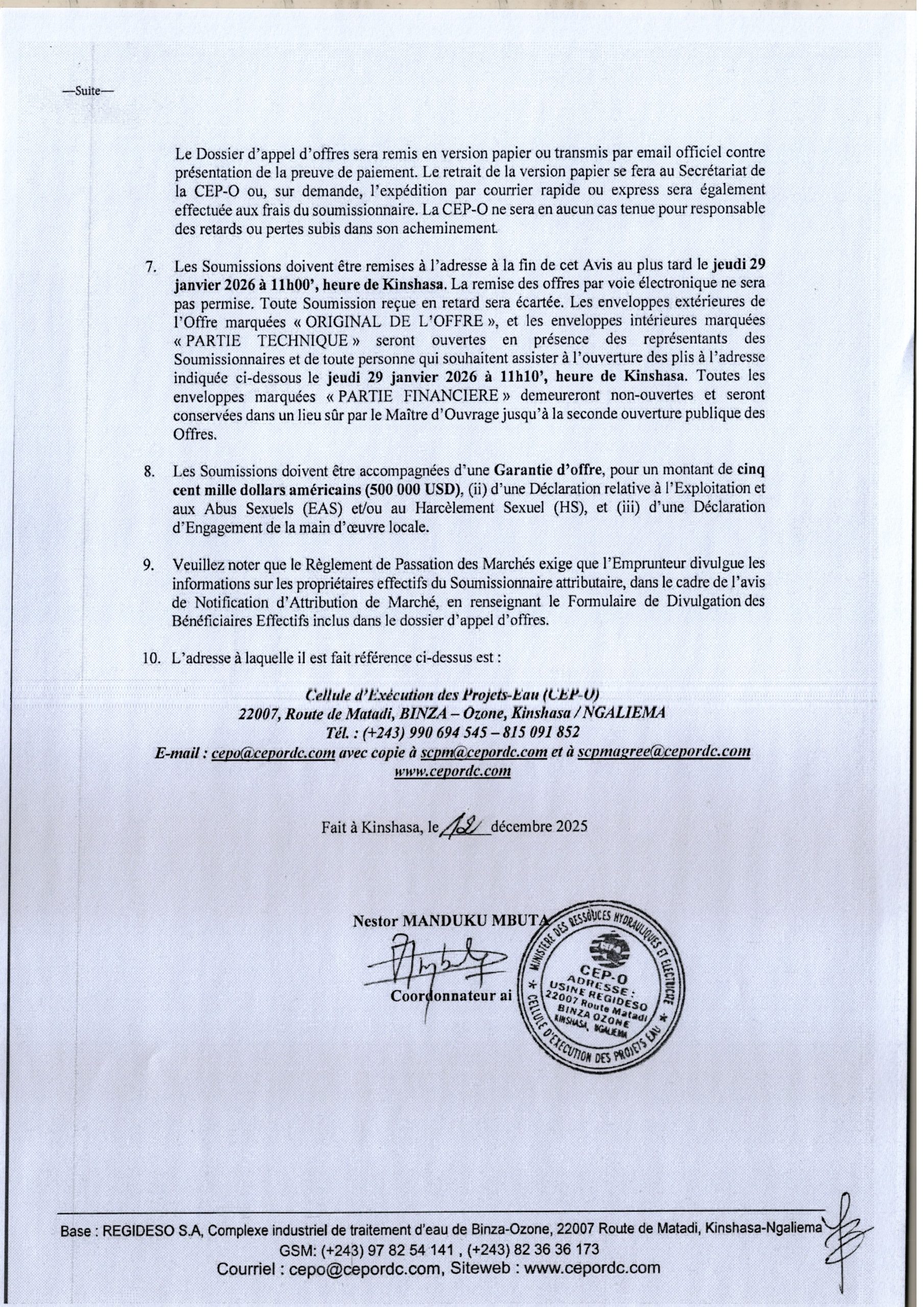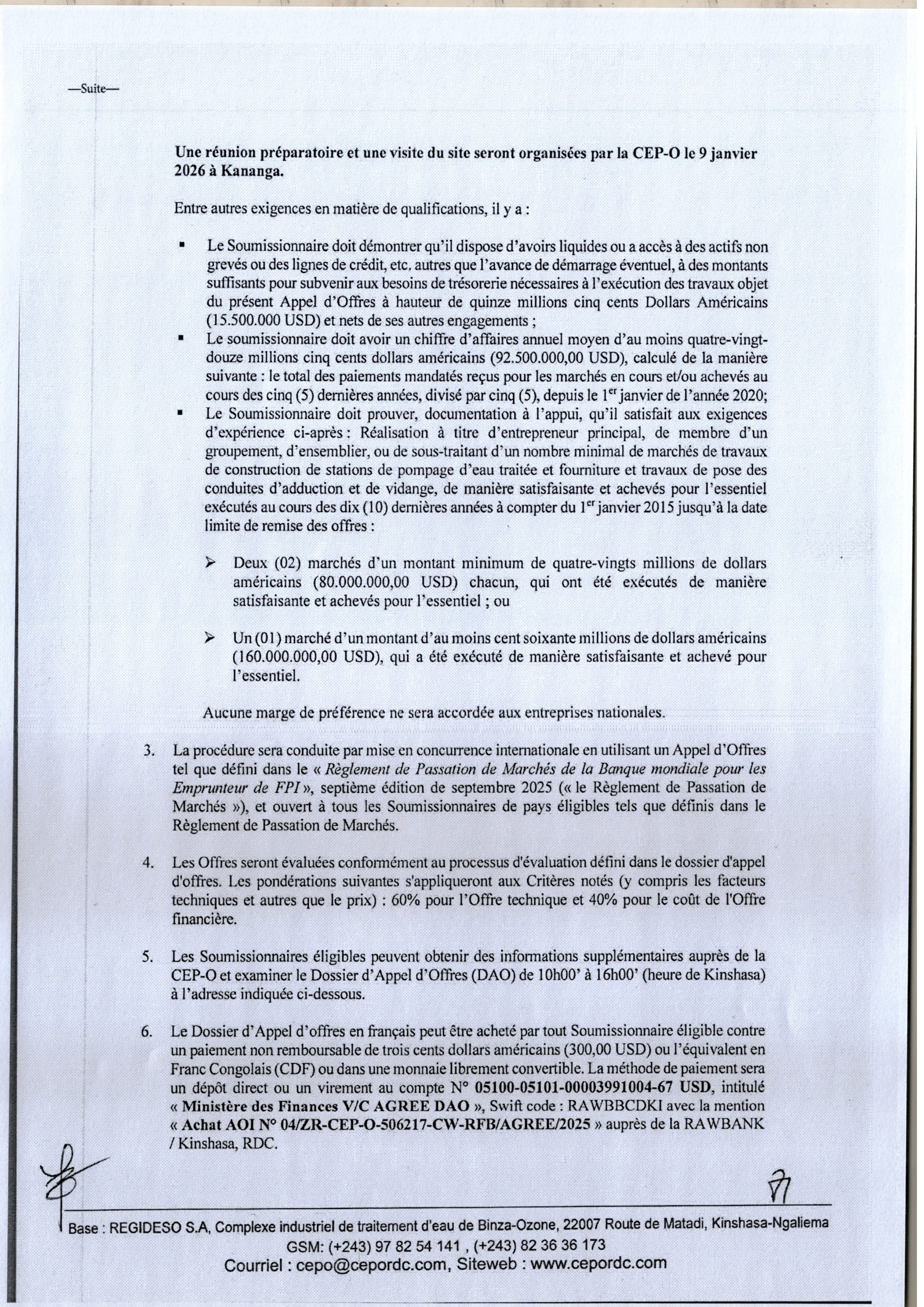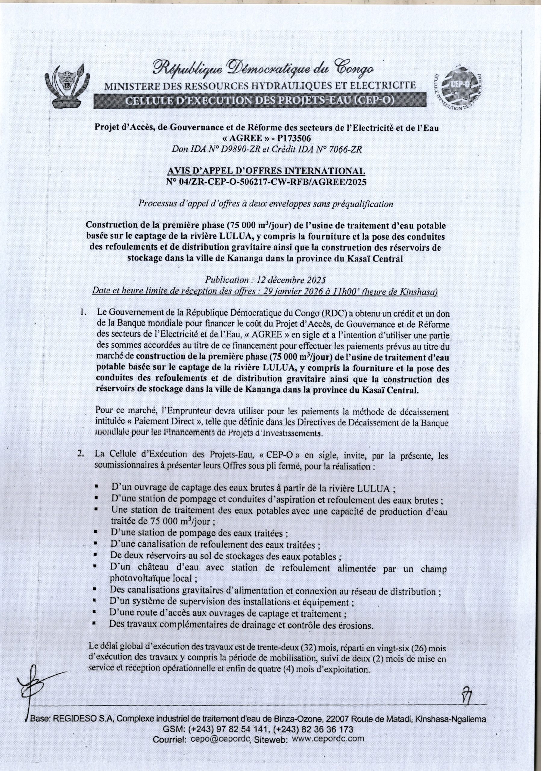 Construction de la première phase (75000 m3/jour) de l’usine de traitement d’eau potable basée sur le captage de la rivière LULUA, y compris la fourniture et la pose des conduites des refoulements et de distribution gravitaire ainsi que la construction des réservoirs de stockage dans la Ville de Kananga dans la Province du Kasai Central.