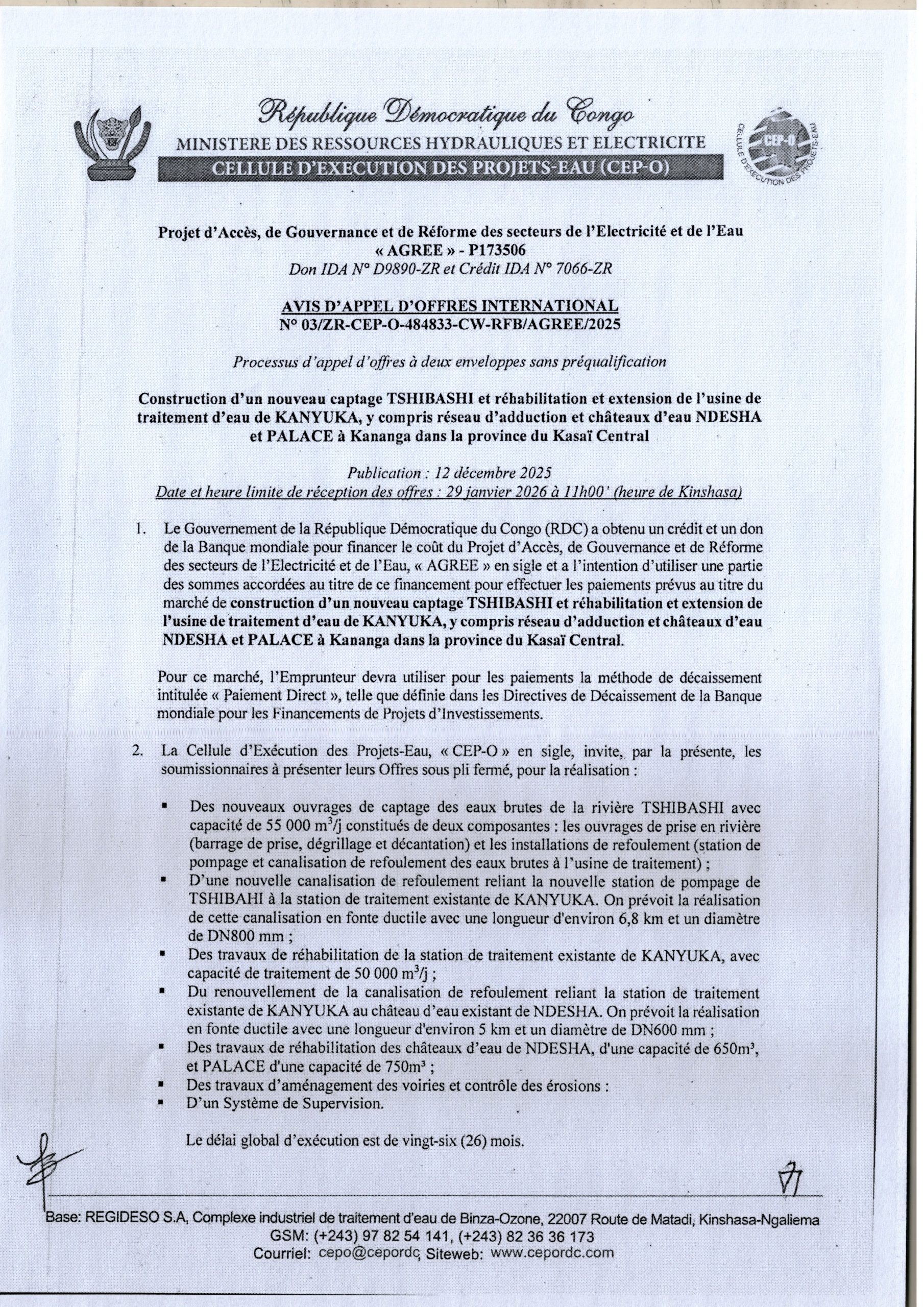 Construction d’un nouveau captage TSHIBASHI et réhabilitation et extension de l’usine de traitement d’eau de KANYUKA, y compris réseau d’adduction et château d’eau NDESHA et PALACE à Kananga dans la Province du Kasai-Central.