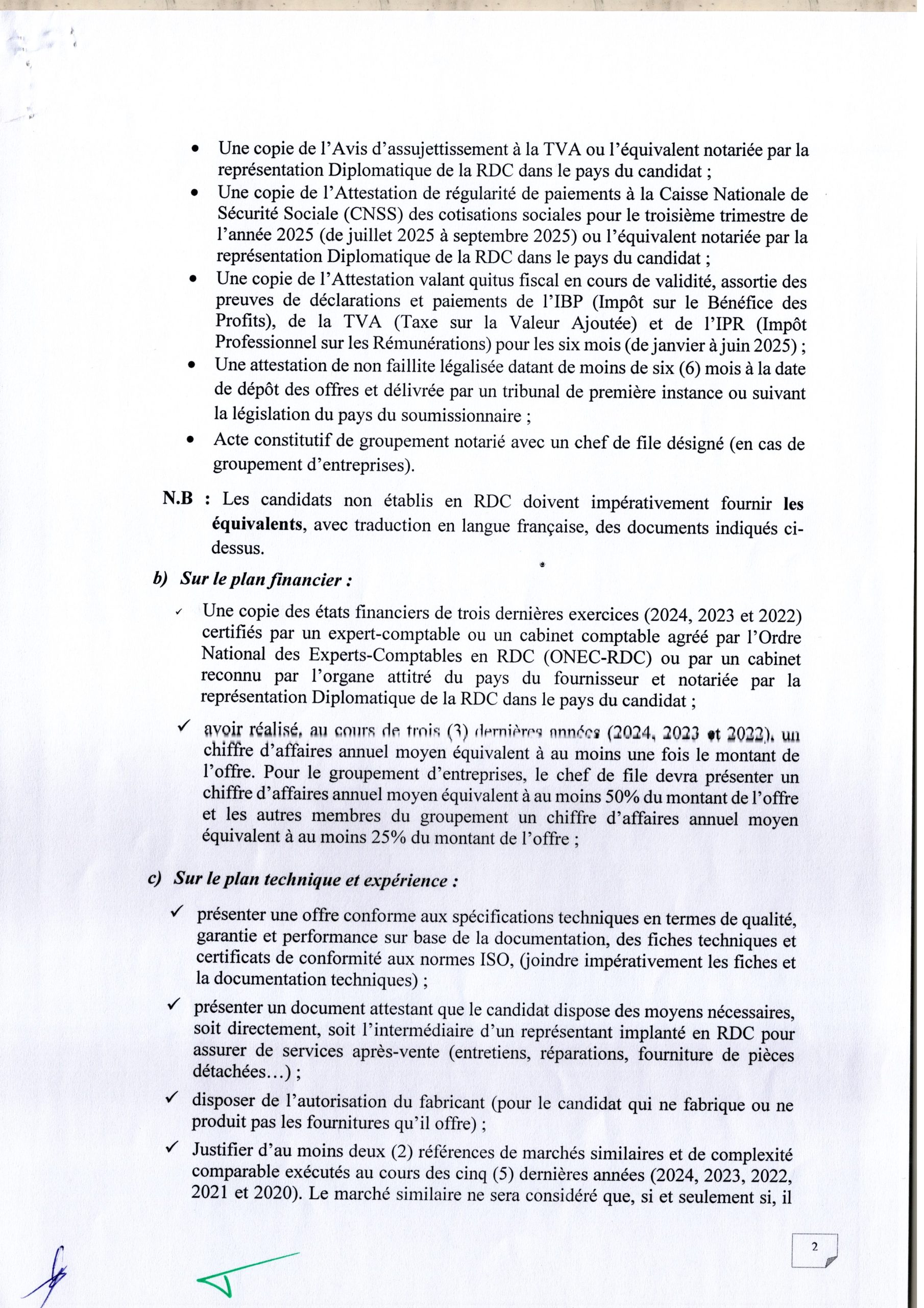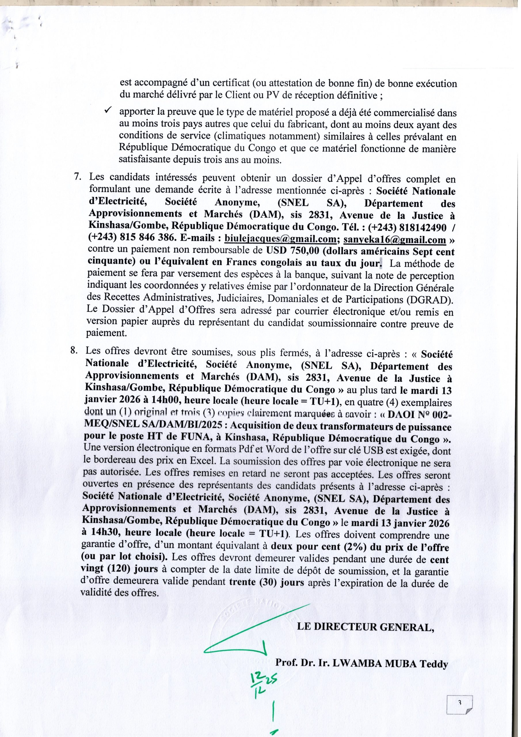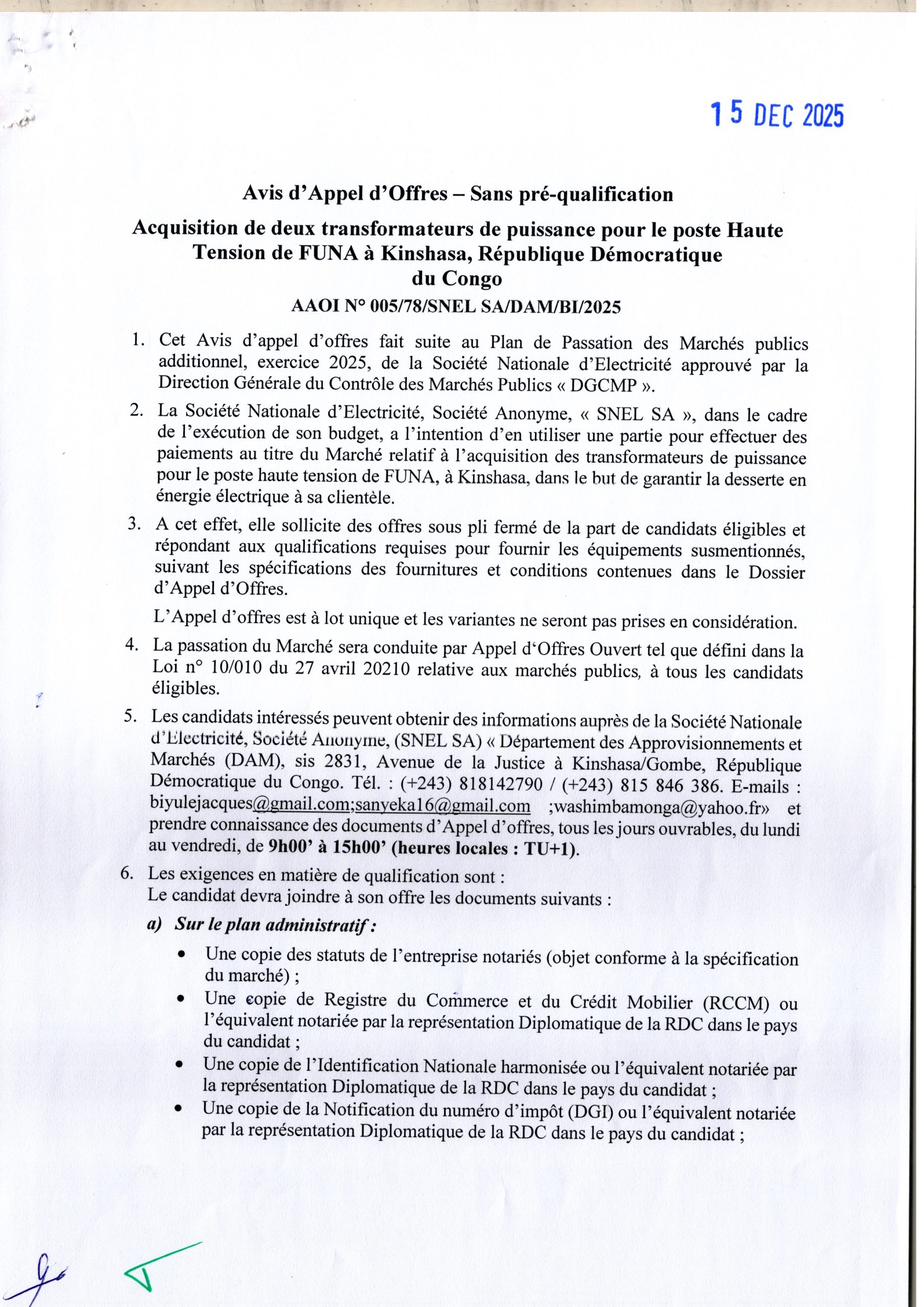 Acquisition de deux (2) transformateurs de puissance pour le poste Haute Tension de Funa à Kinshasa, République Démocratique du Congo.
