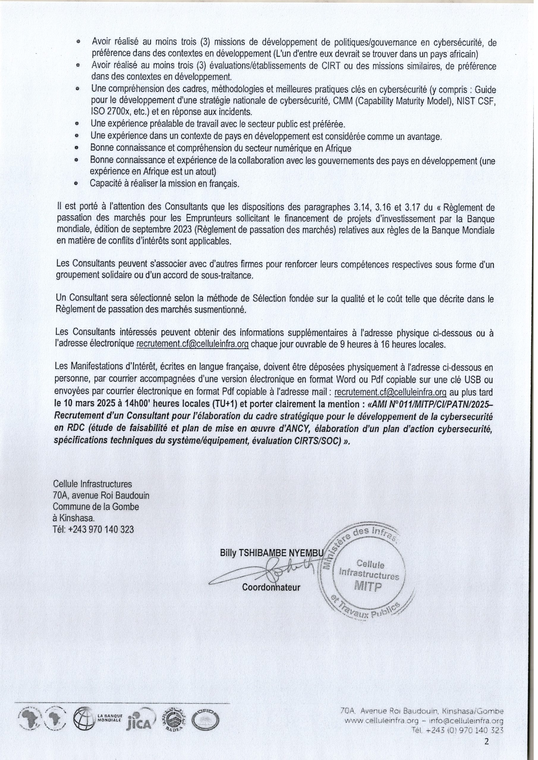Avis d’attribution provisoire accordé aux sociétés KAIS TRADING SARL(lot 1)et GRAIN DE SENEVE SARL (lot 2) relatif aux travaux de construction de deux Bâtiments Administratifs R+3 de la Direction Générale à Kinshasa et R+1 pour l’escale de Lubumbashi au profit de Congo Airways S.A.