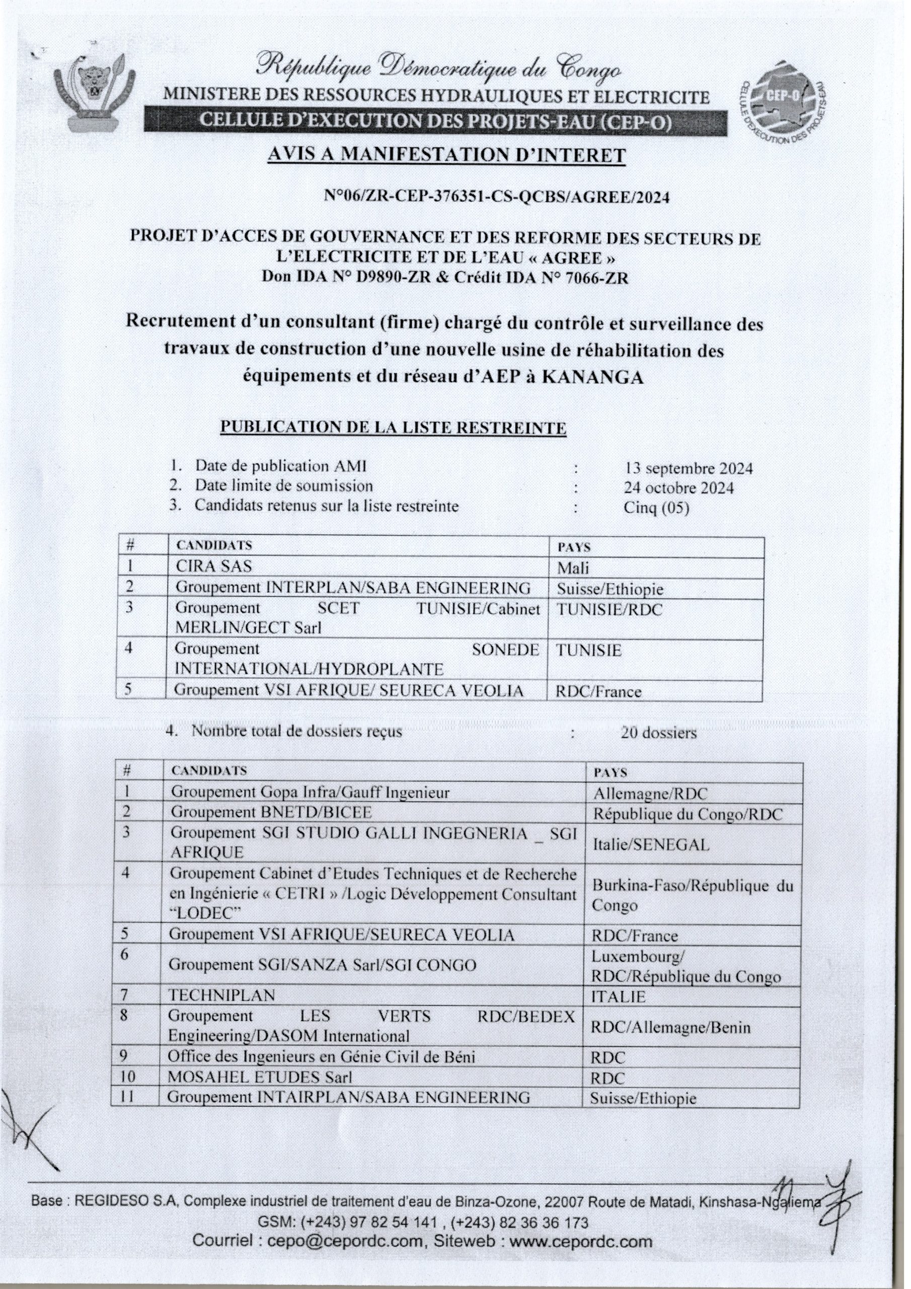 Liste restreinte de la CEP-O relative au recrutement d’un consultant (firme) chargé du contrôle et surveillance des travaux de construction d’une nouvelle usine de réhabilitation des équipements et du réseau d’AEP à KANANGA.