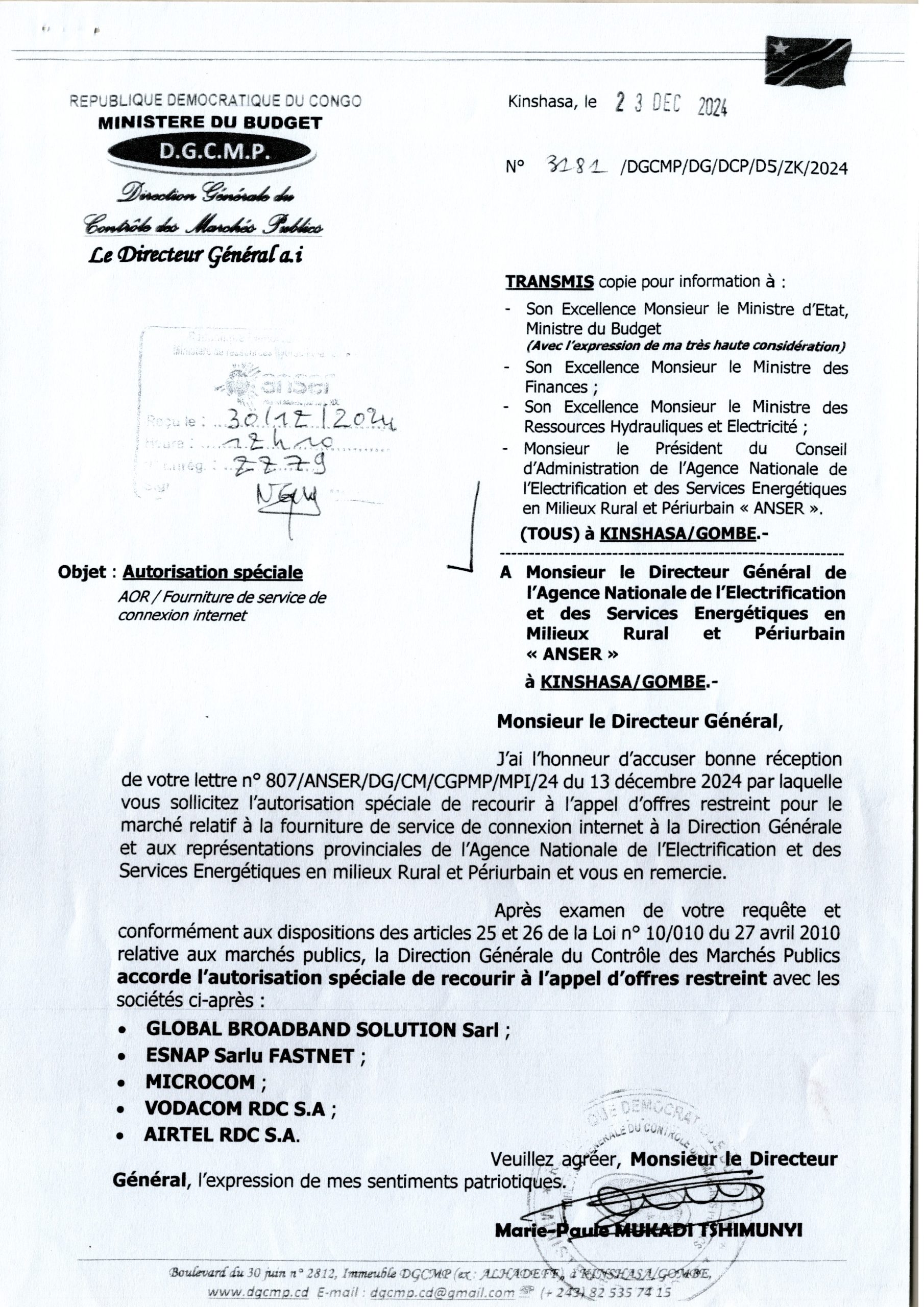 Attribution provisoire accordée à l’Etablissement KAS GOLD relative à l’acquisition des six cent (600) motos+casques pour les inspections provinciales (lot 1,2,3et 4).
