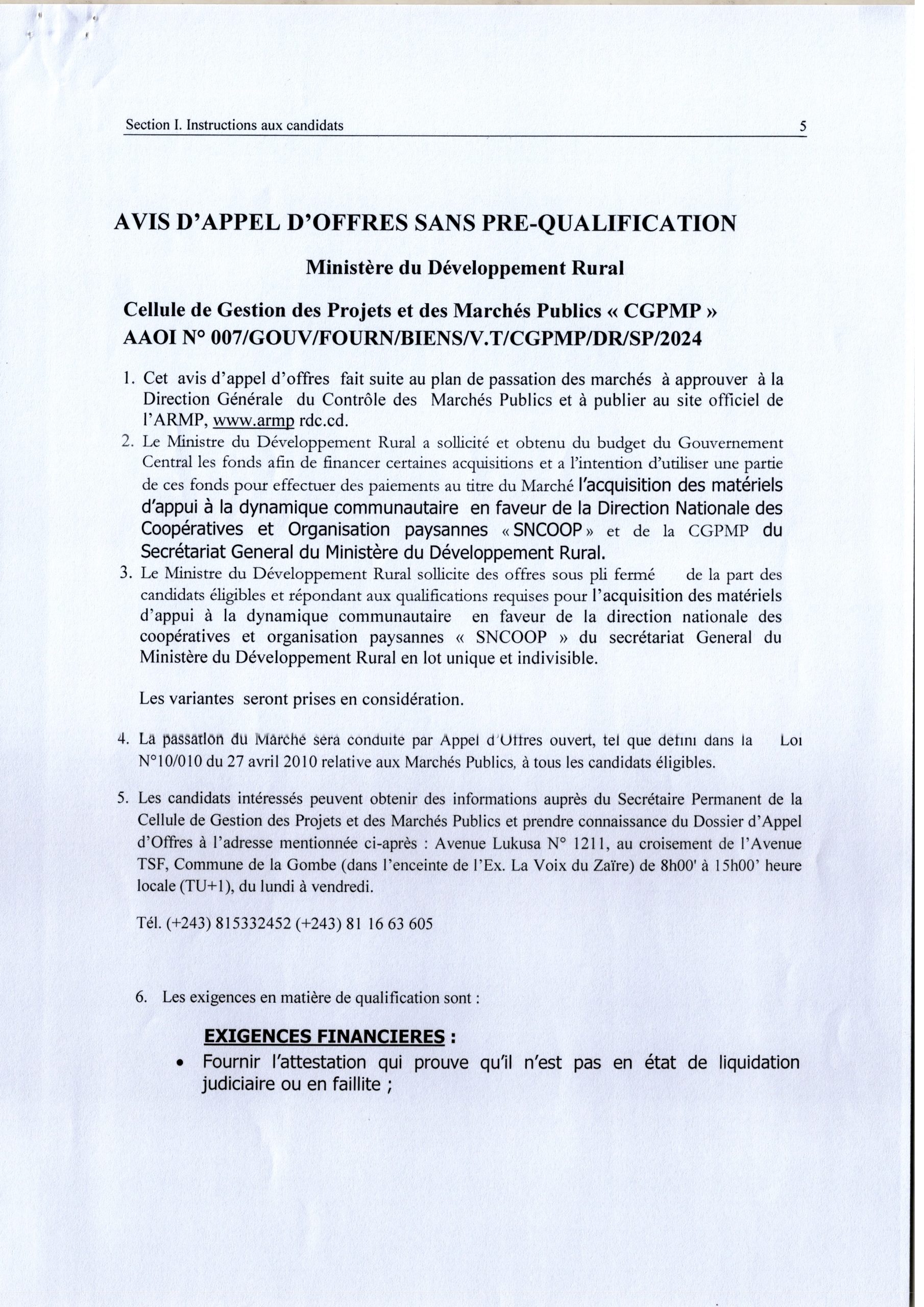 Acquisition des matériels d’appui à la dynamique communautaire en faveur de la Direction Nationale des coopératives et organisation paysannes “SNCOOP” et de la CGPMP du Secrétariat Général du Ministère du Développement Rural.