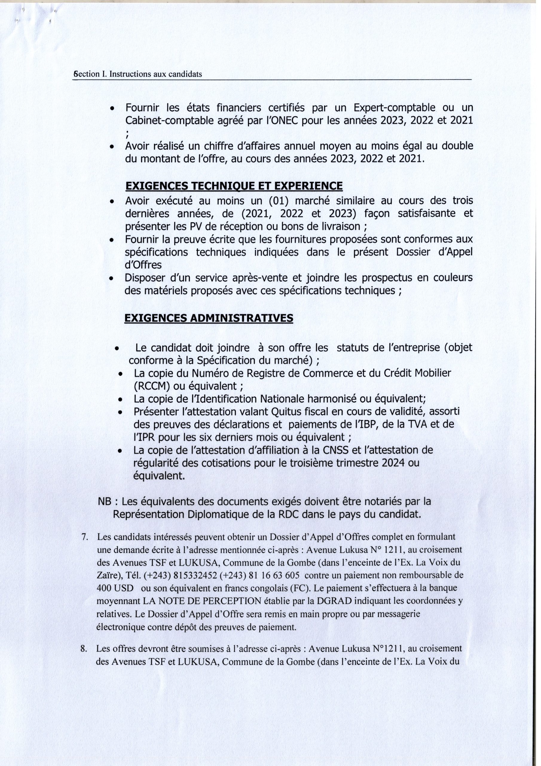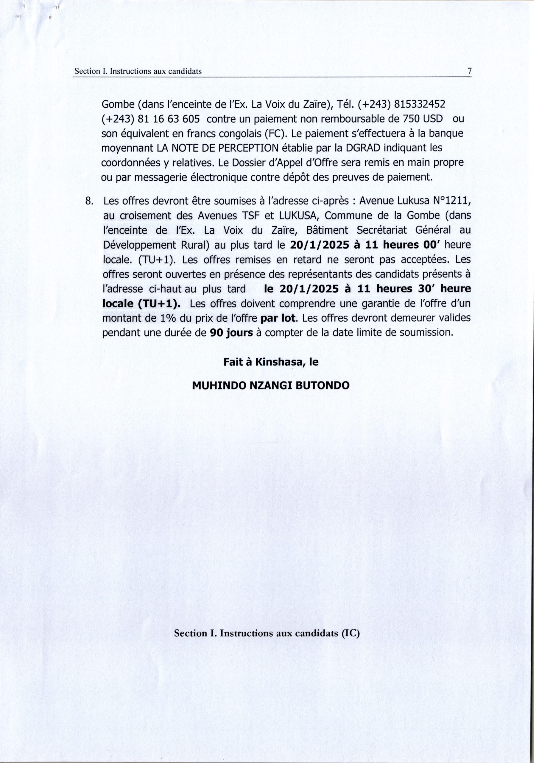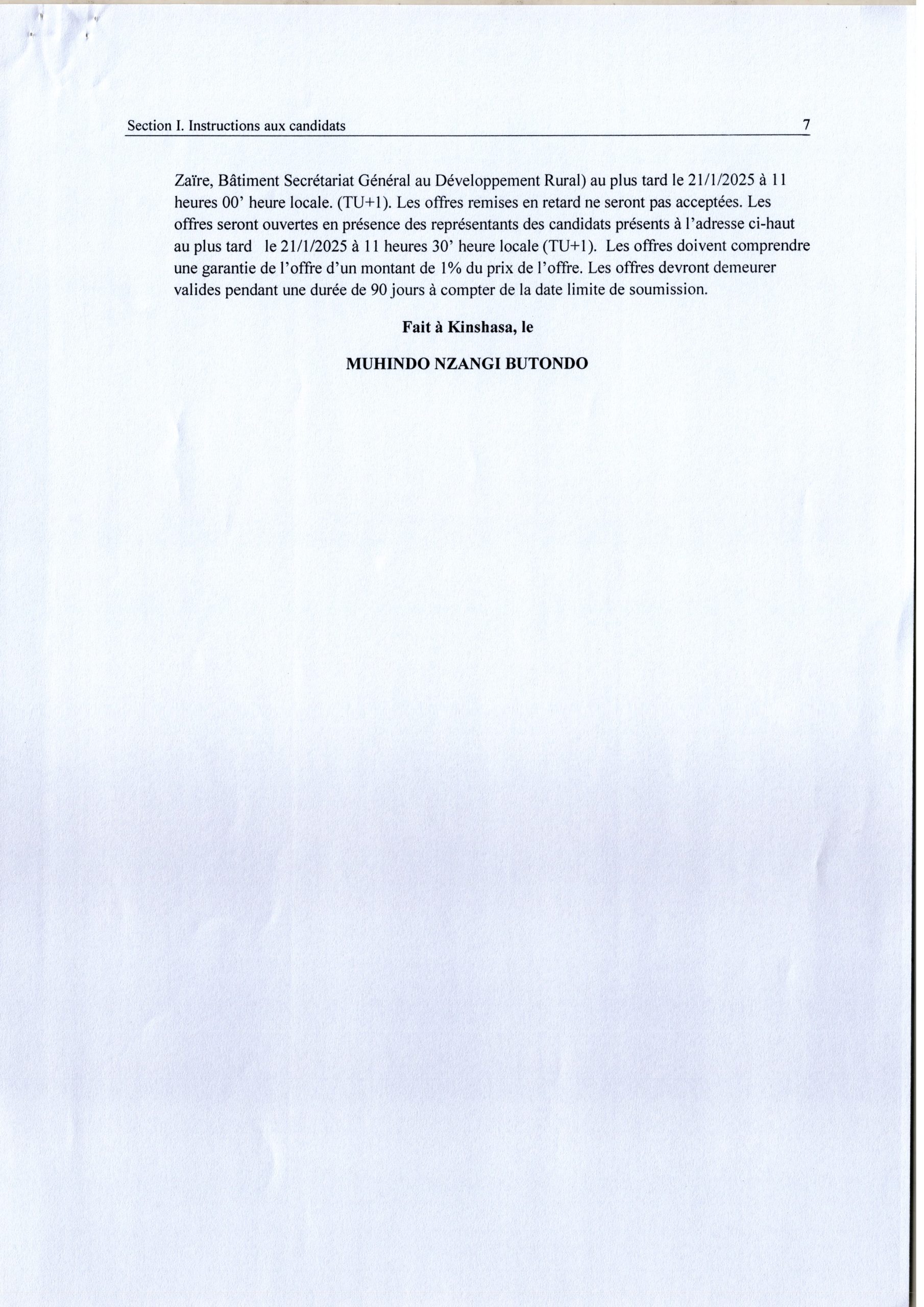 Décision d’attribution provisoire accordée à l’Entreprise SPARTAN QUARRIES relative à la construction d’un pont (dalot) sur la rivière KAMUSOMBO-KYALA.