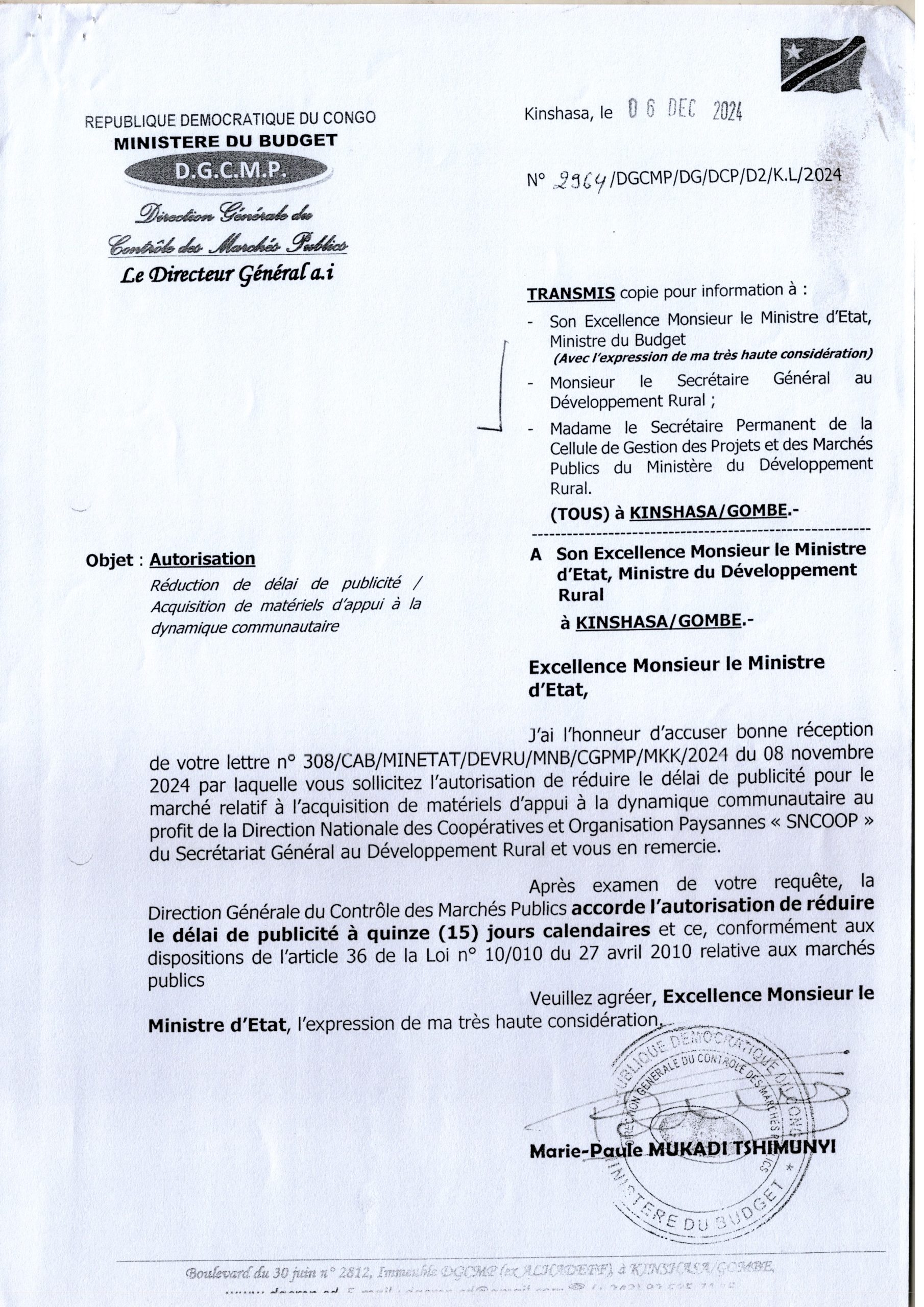 Autorisation de Réduction de délai de publicité à quinze (15) jours calendaires pour le marché relatif à acquisition d’un charroi automobile