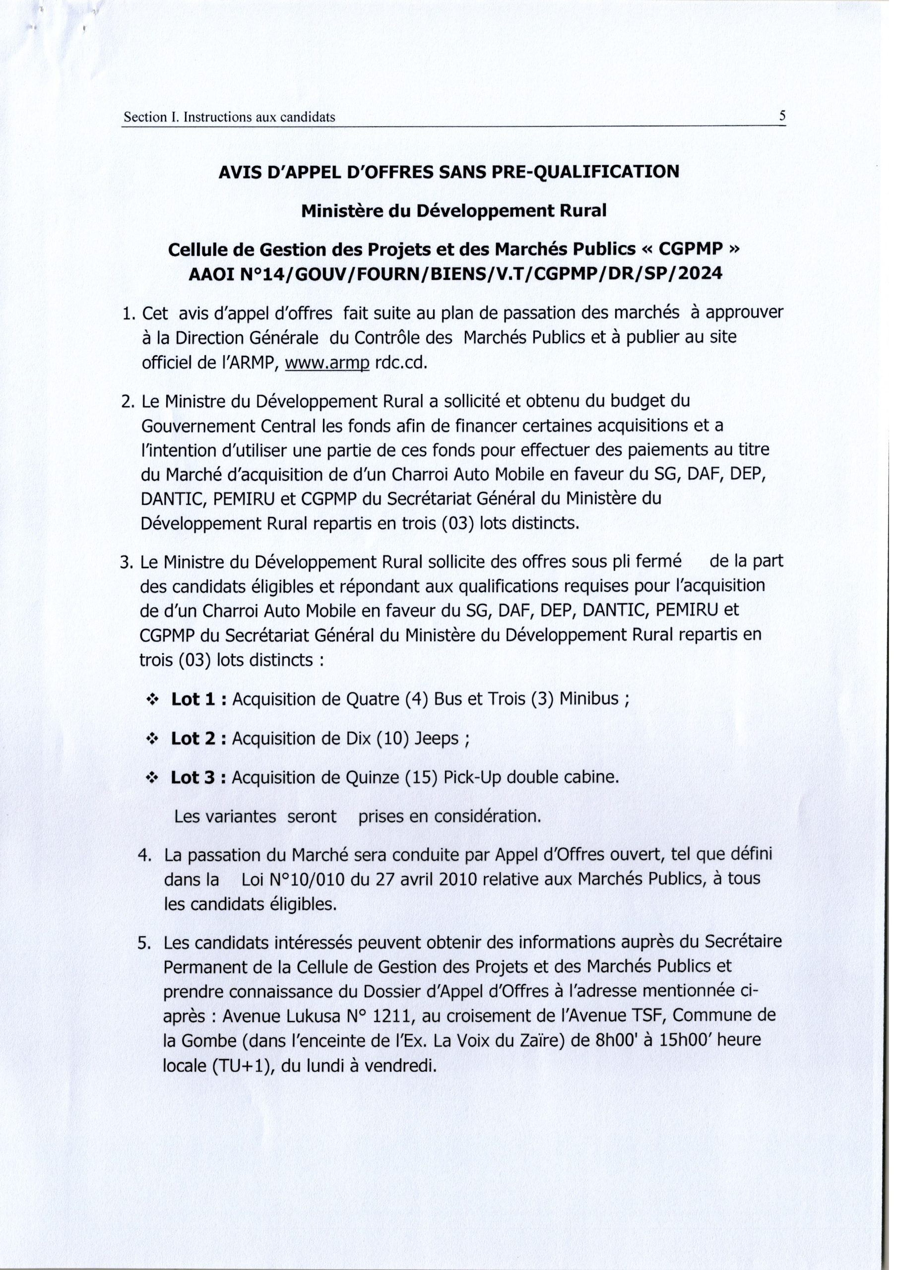 Acquisition d’un charroi Auto Mobile rn faveur du SG, DAF, DEP, DANTIC, PEMIRU et CGPMP du Secrétariat du Ministère du Développement Rural repartis en trois (03) lots distincts.