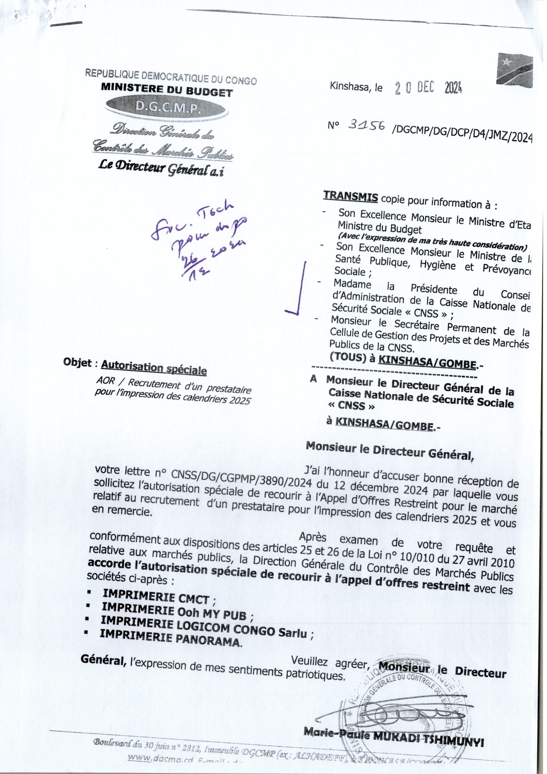Décision d’attribution définitive accordée au Groupement des Entreprises, Groupe Souvenir Construct Sarl & Bâtisseurs Professionnels Sarl ” GSC & BAPRO Sarl” relative aux travaux de réhabilitation de deux (02) bâtiments de l’Ecole Technique Mixte “Saint Jean Bosco de Kenge du lot 2,…