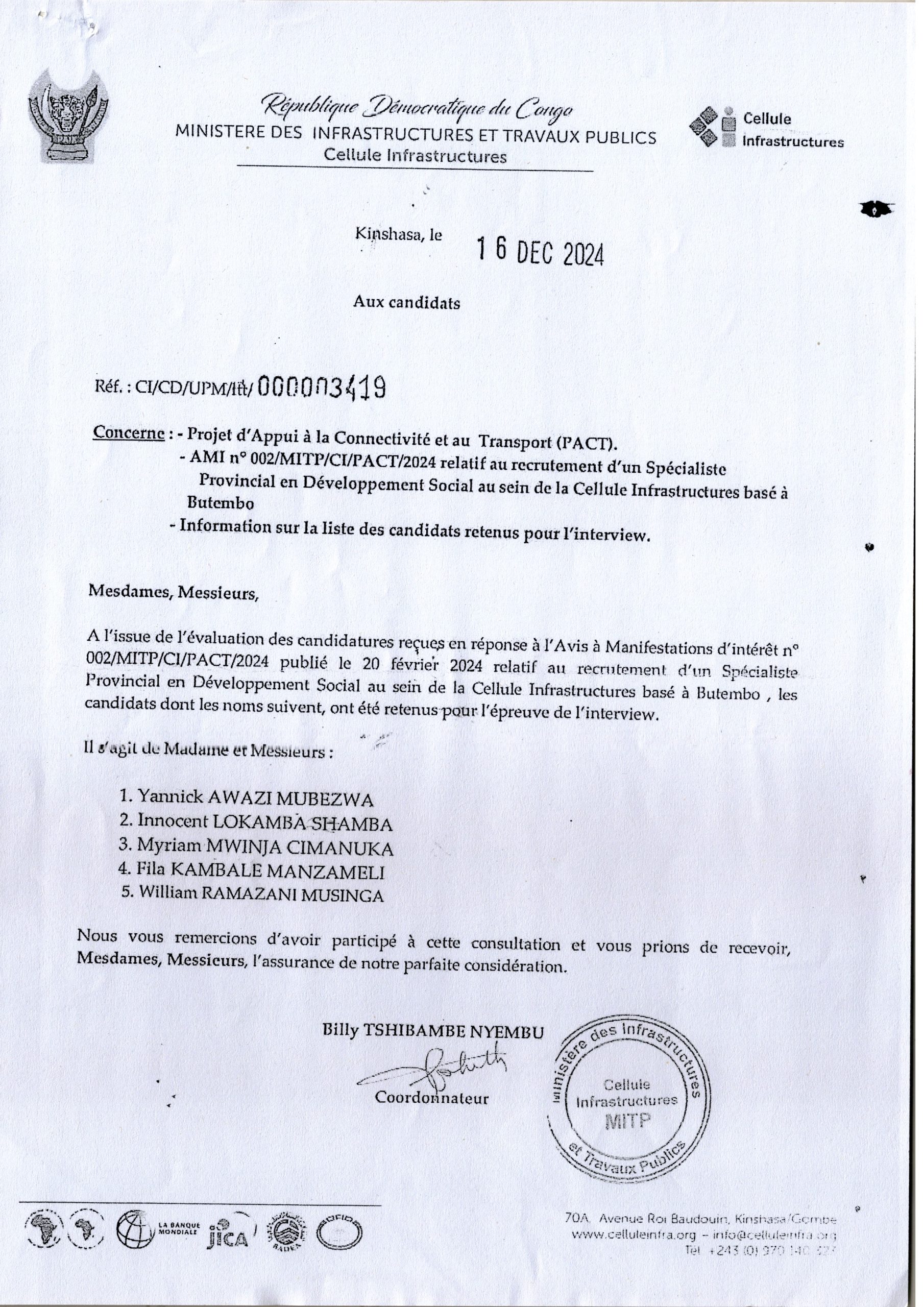 La liste des candidats retenus pour l’interview relative au recrutement d’un spécialiste Provincial en développement Social au sein de la cellule infrastructures basé à Butembo.