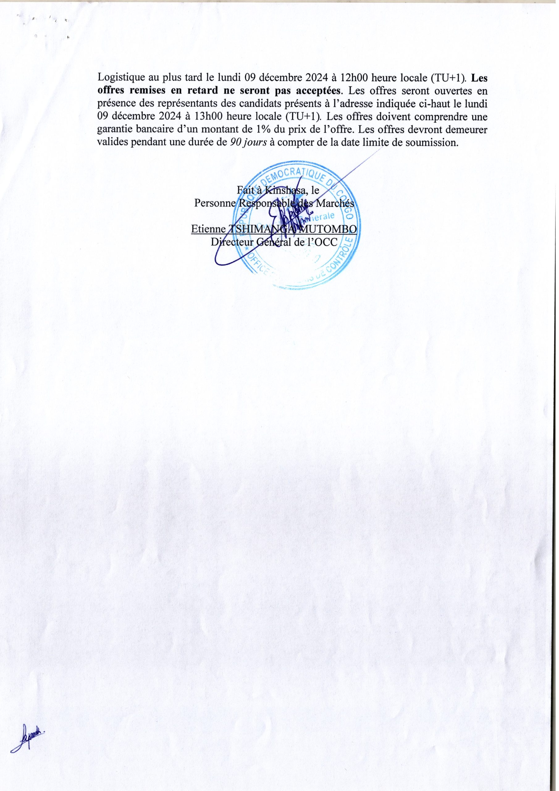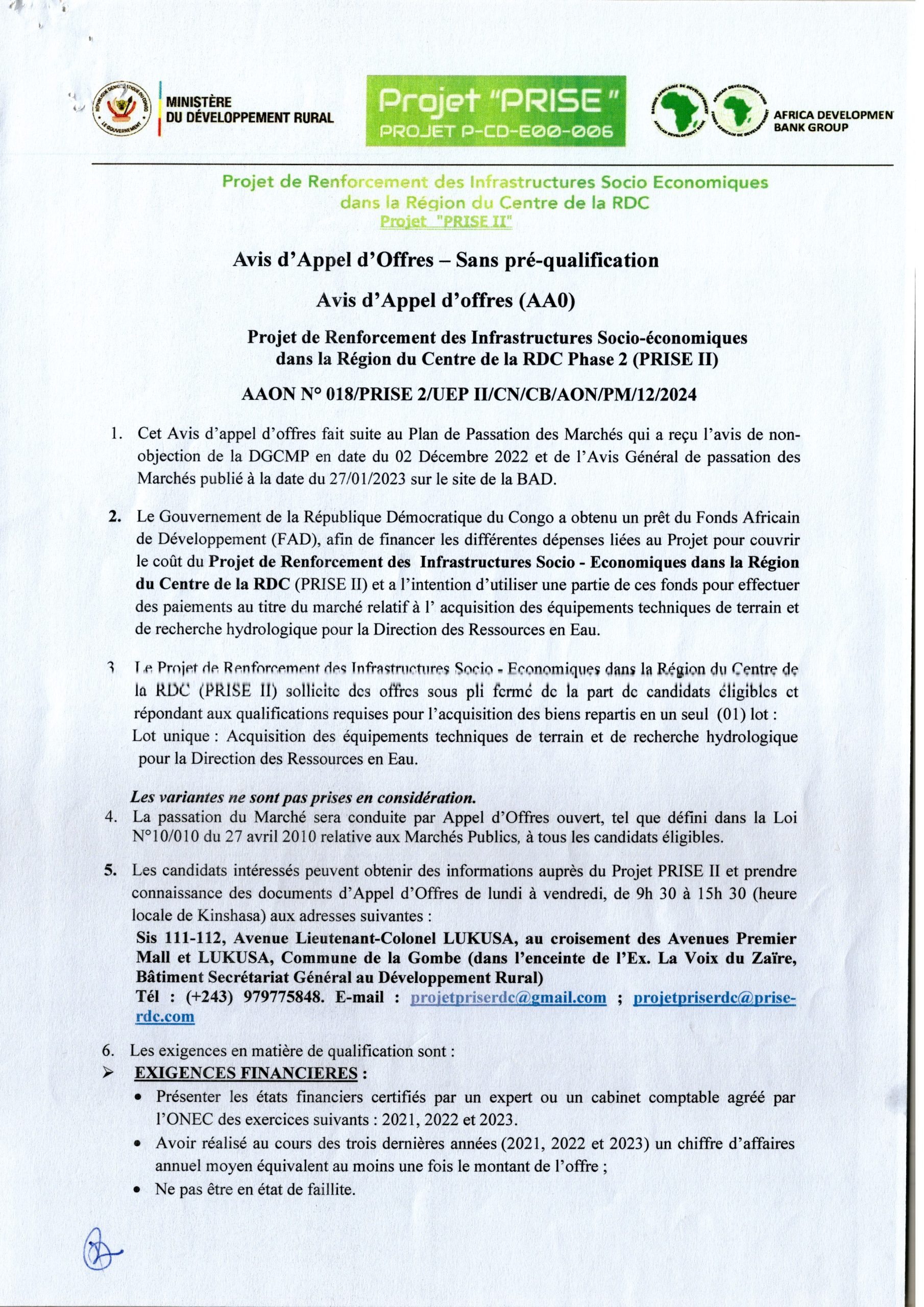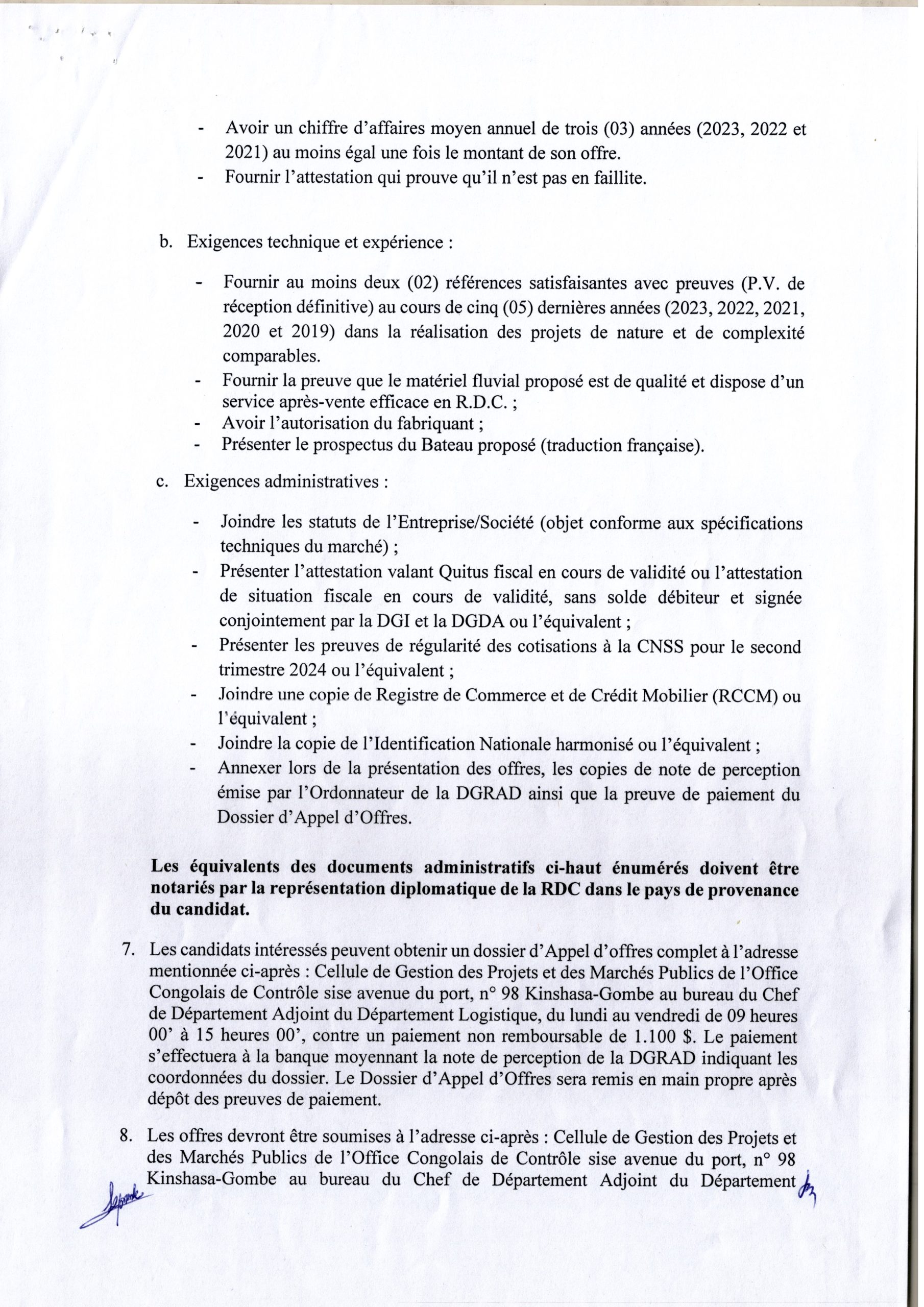 Acquisition d’un bateau (vedette) en lot unique en faveur de la Direction Provinciale du Kongo Central/Agence de Muanda.