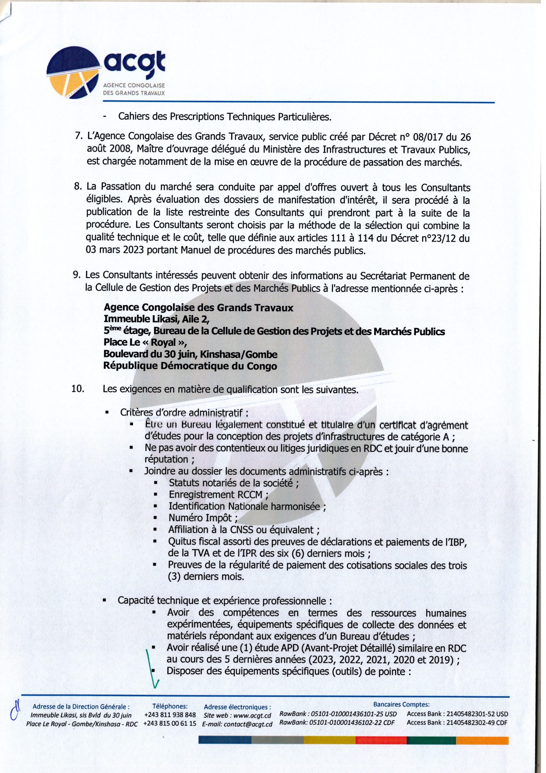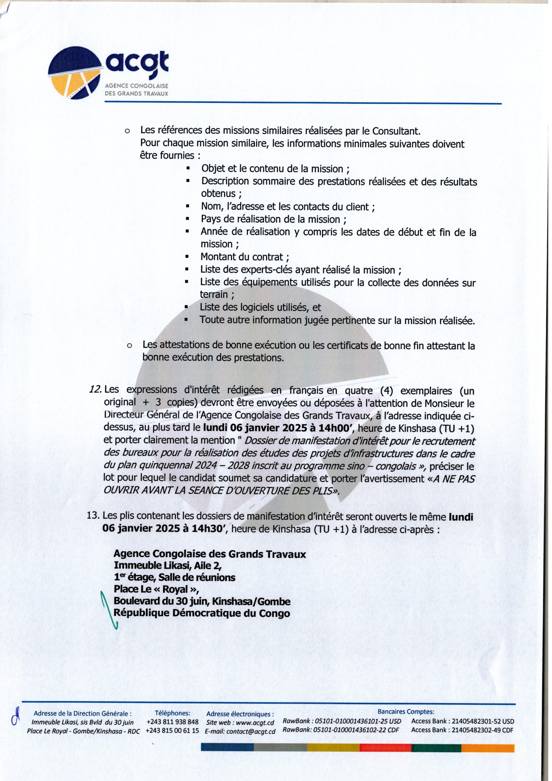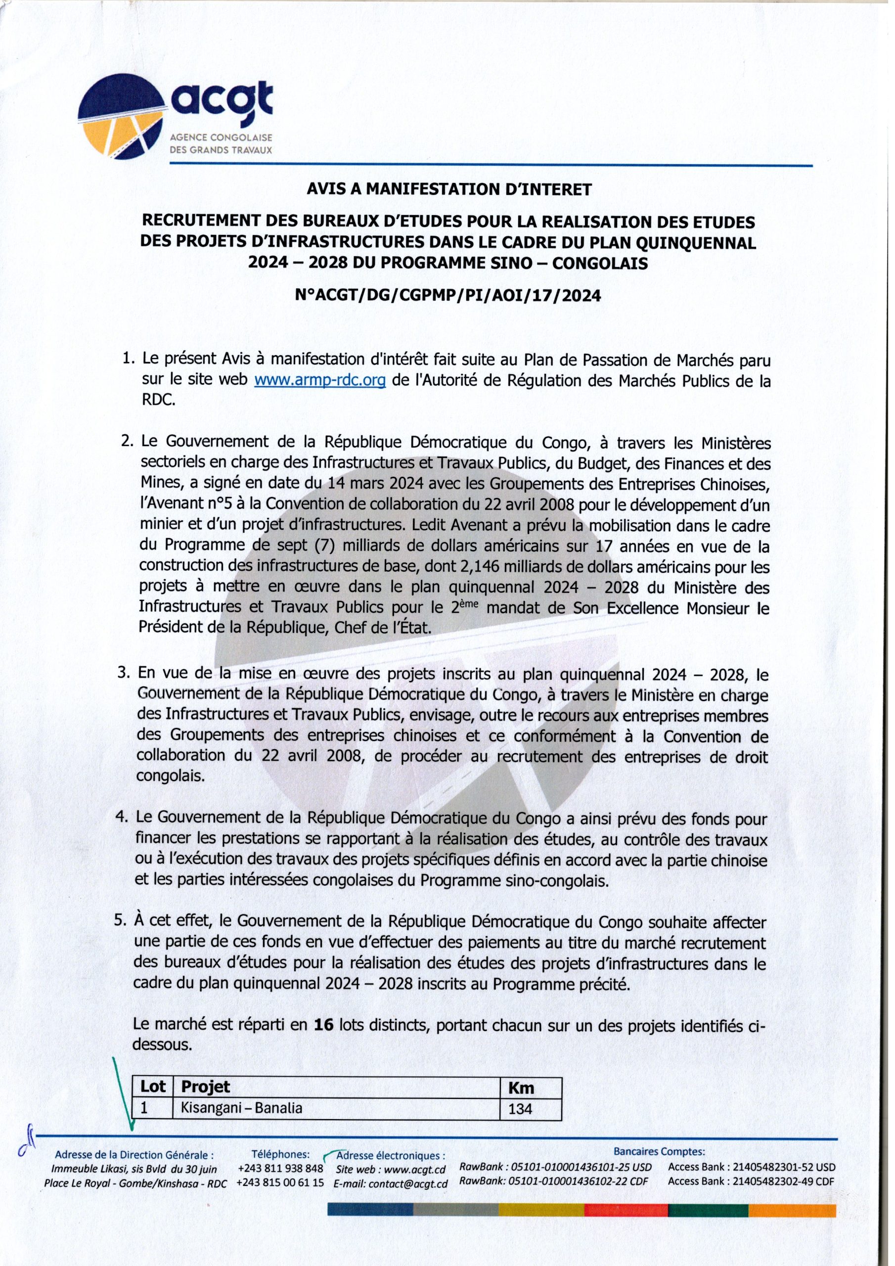 Recrutement des bureaux d’études pour la réalisation des études des projets d’infrastructures dans le cadre du plan Quinquennal 2024-2028 du programme SINO-CONGOLAIS.