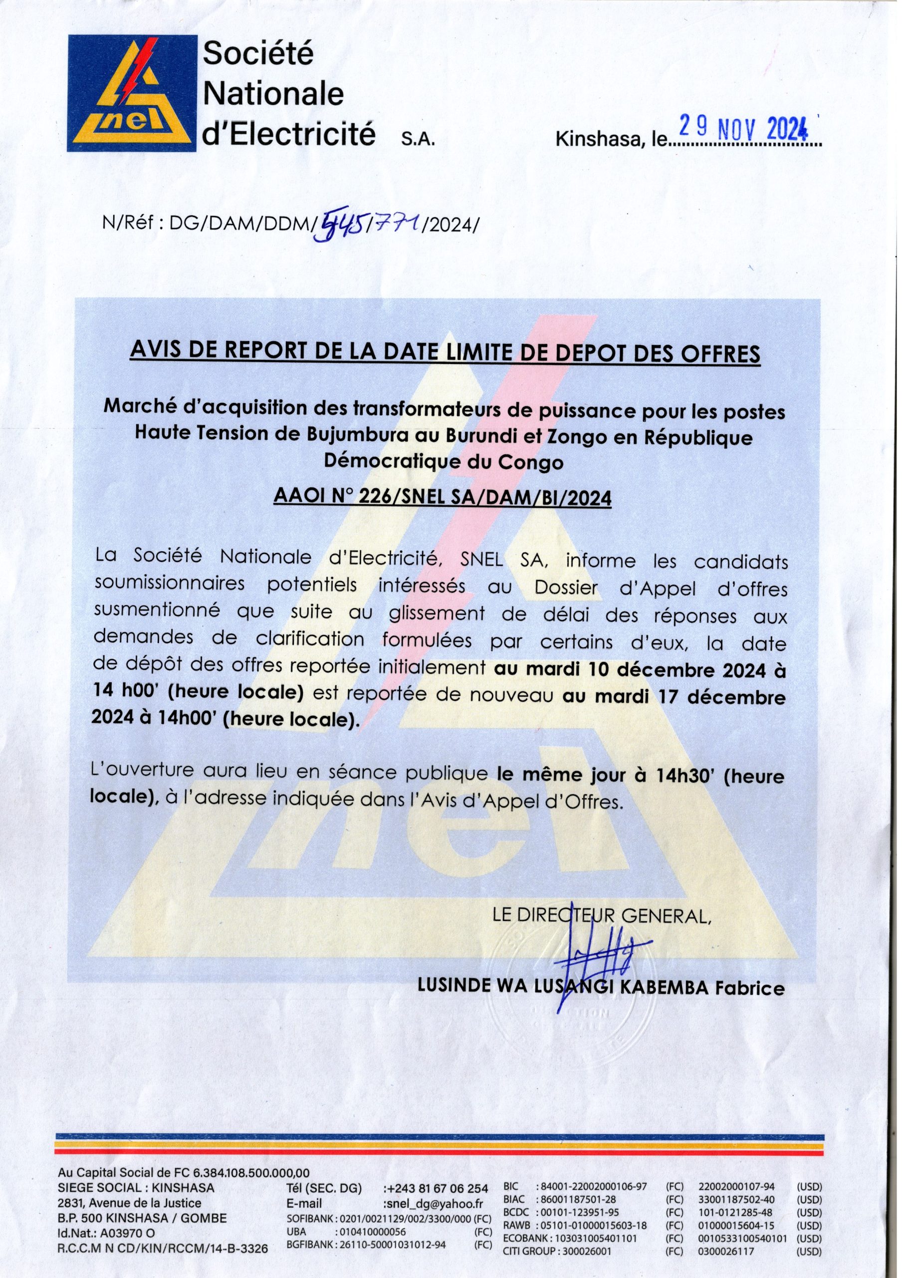 Avis de report relatif au marché d’acquisition des transformateurs de puissance pour les postes Haute Tension de Bujumbura et Zongo en RDC