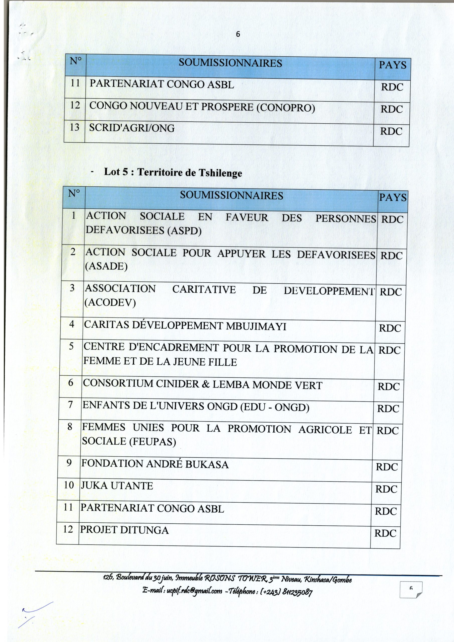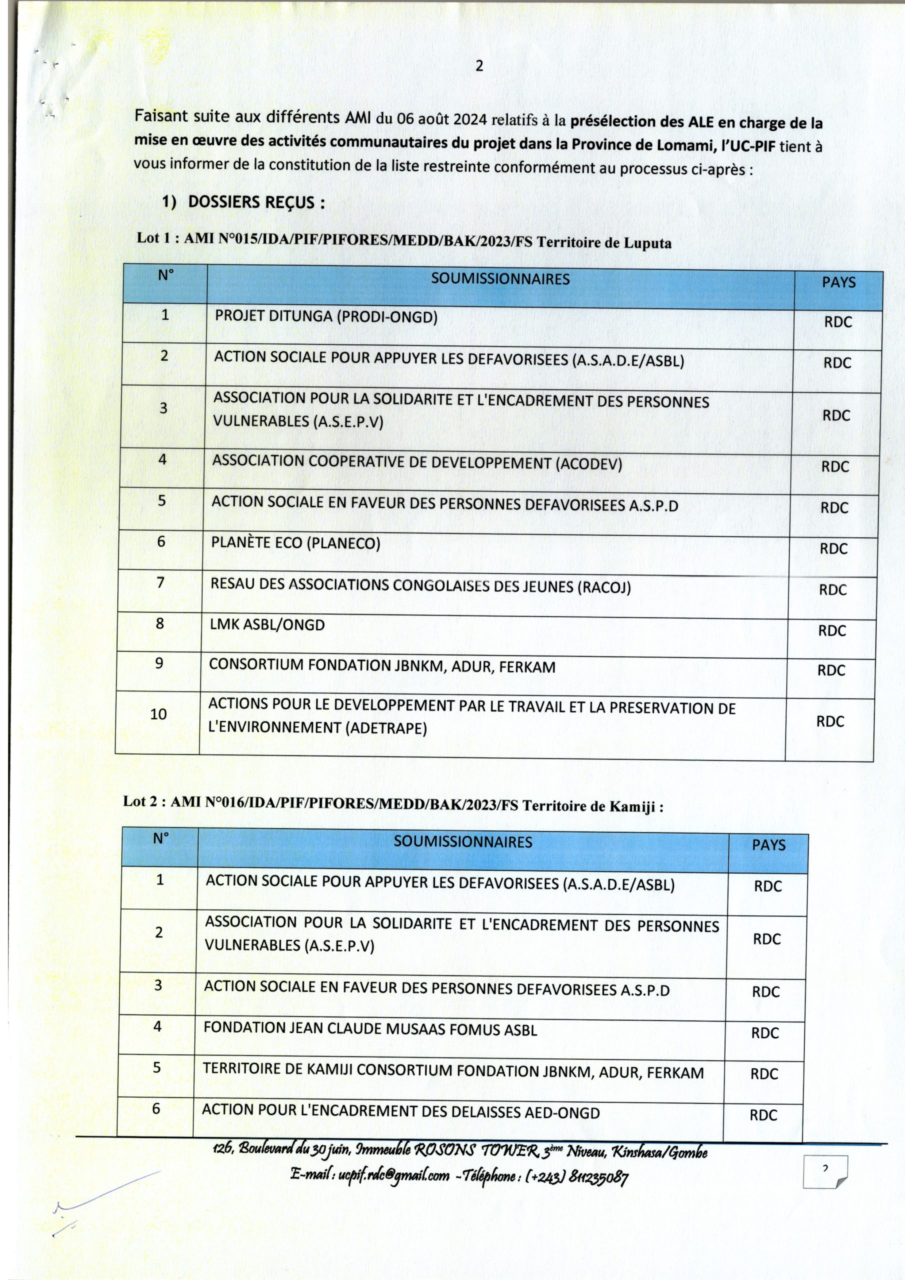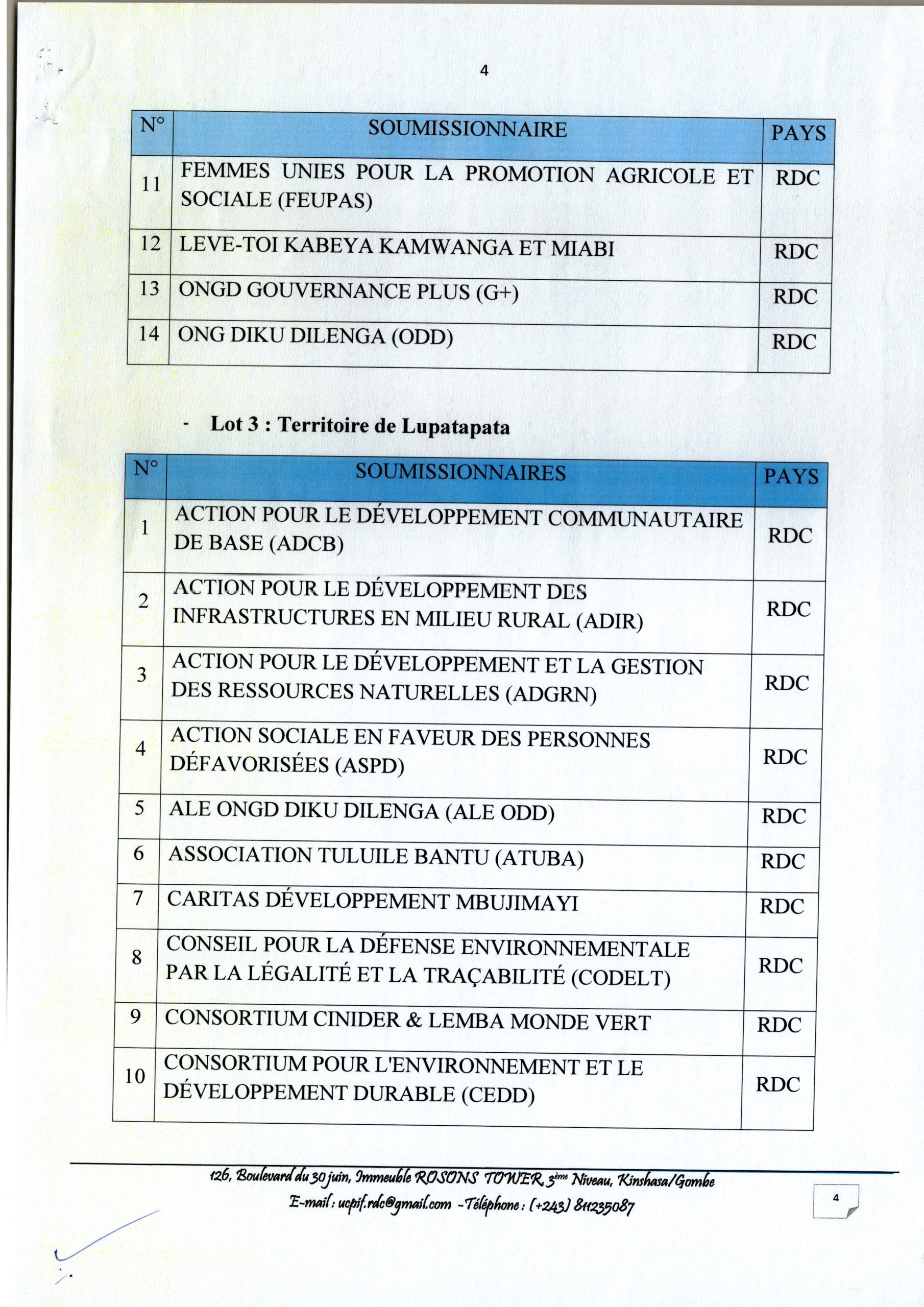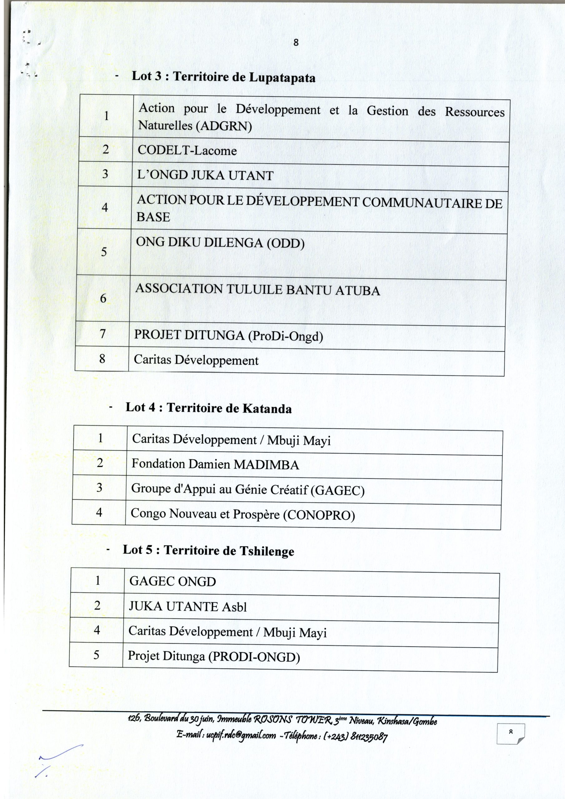 Liste restreinte des agences locales d’exécution en charge de la mise en œuvre des activités communautaires du projet dans la province de Lomami